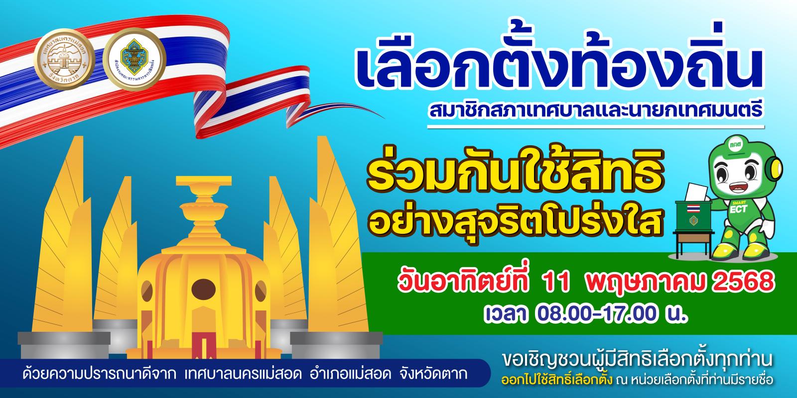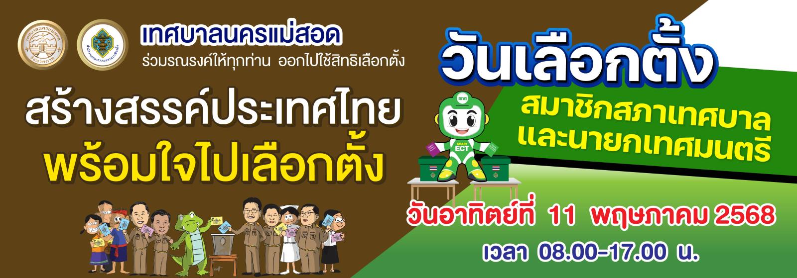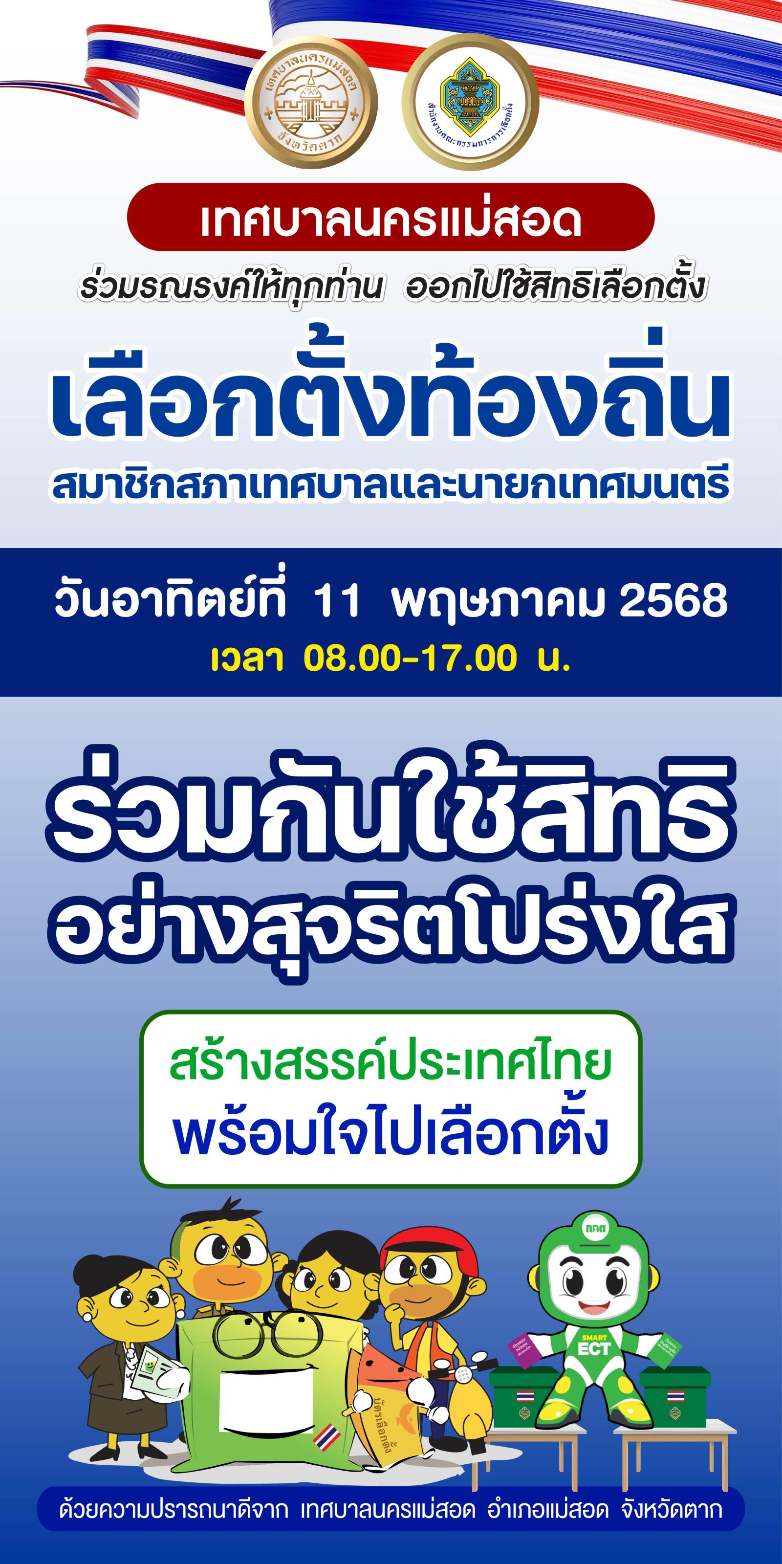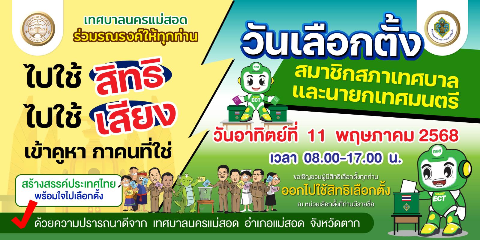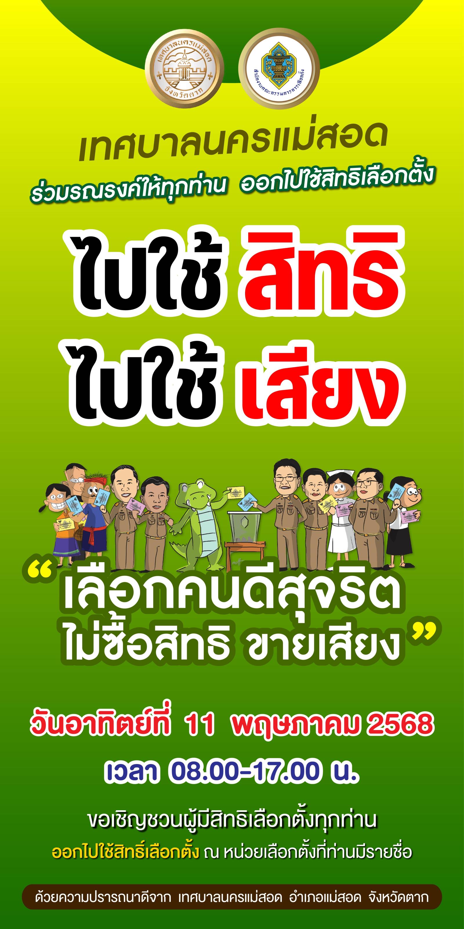 เทศบาลนครแม่สอด ขอเชิญชวนทุกท่านไปใช้สิทธิเลือกตั้งเทศบาล ณ หน่วยเลือกตั้งที่ท่านมีชื่ออยู่ ในวันอาทิตย์ ที่11 พฤษภาคม 2568 เวลา 8.00 น. - 17.00 น.
