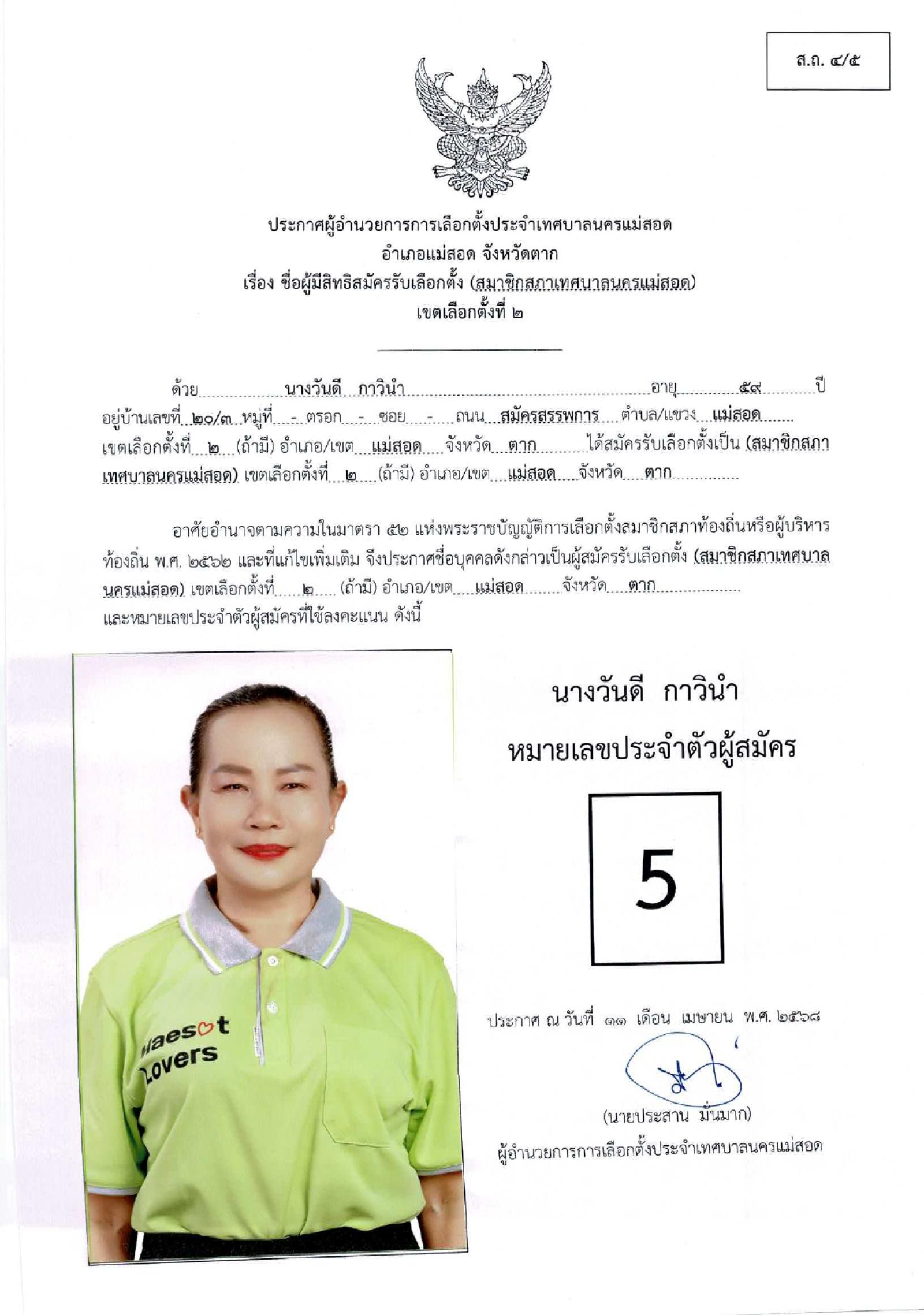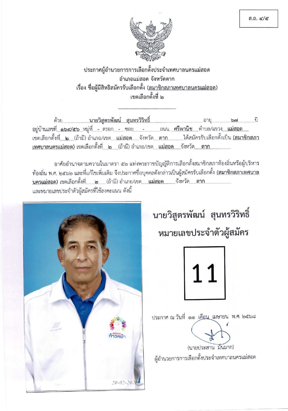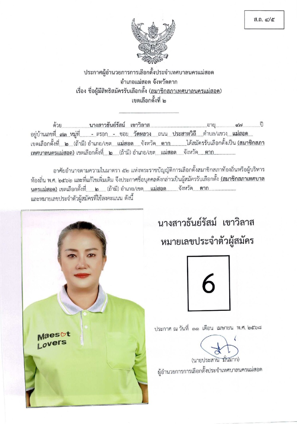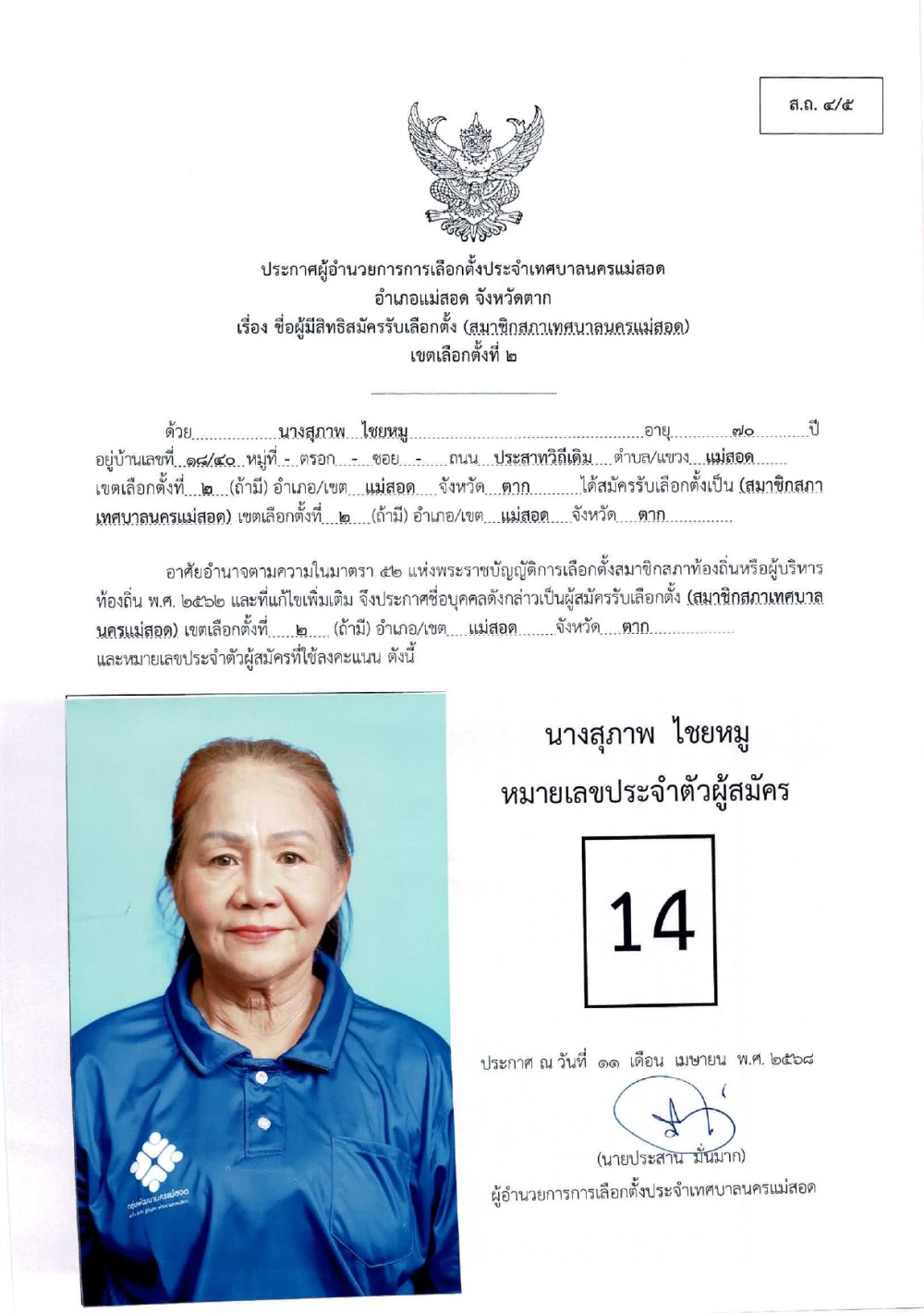ประกาศเทศบาลนครแม่สอด เรื่อง ชื่อผู้มีสิทธิสมัครรับเลือกตั้ง สมาชิกสภาเทศบาลนครแม่สอด เขตเลือกตั้งที่ 2