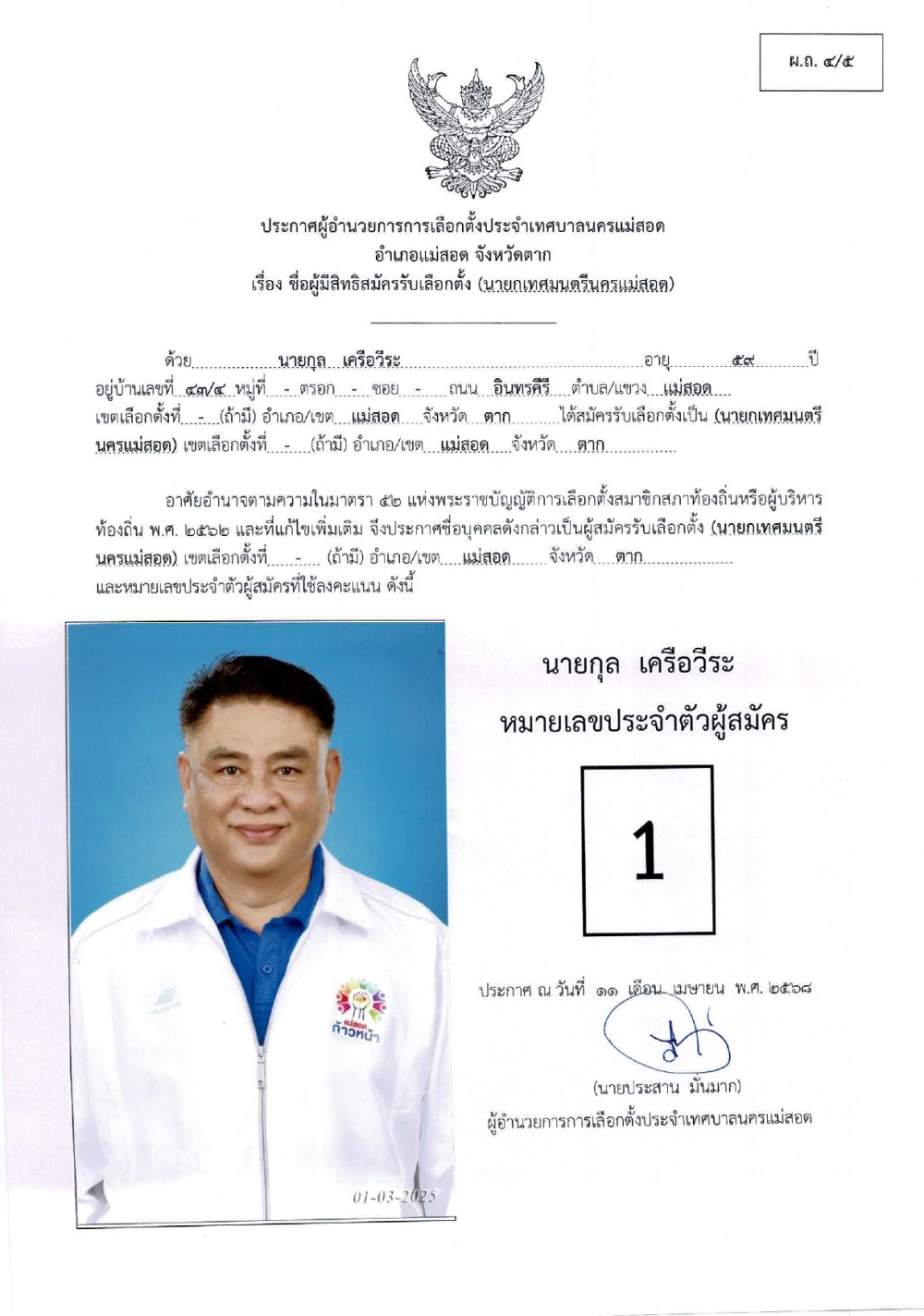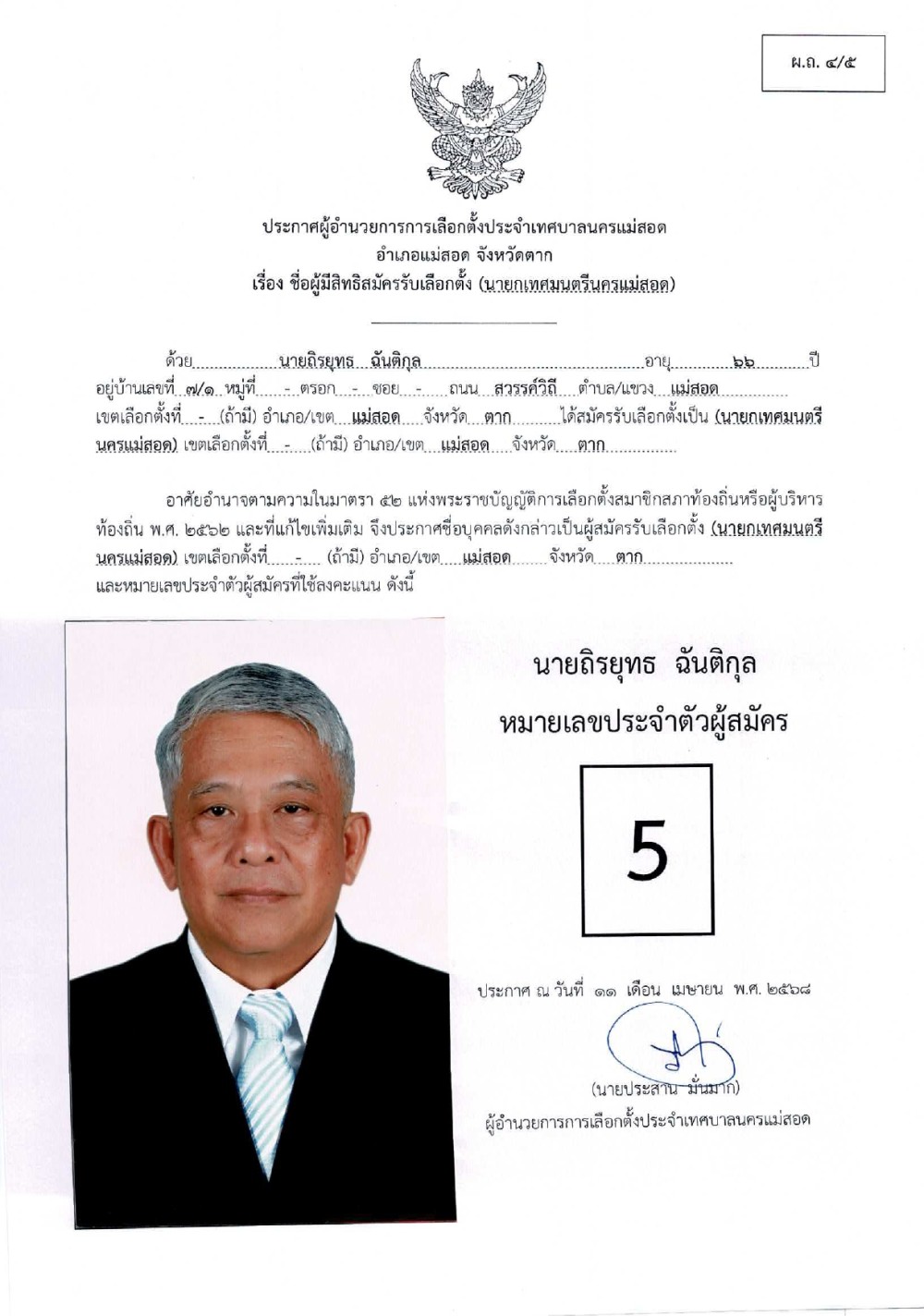 ประกาศเทศบาลนครแม่สอด เรื่อง ชื่อผู้มีสิทธิสมัครรับเลือกตั้ง นายกเทศมนตรีนครแม่สอด