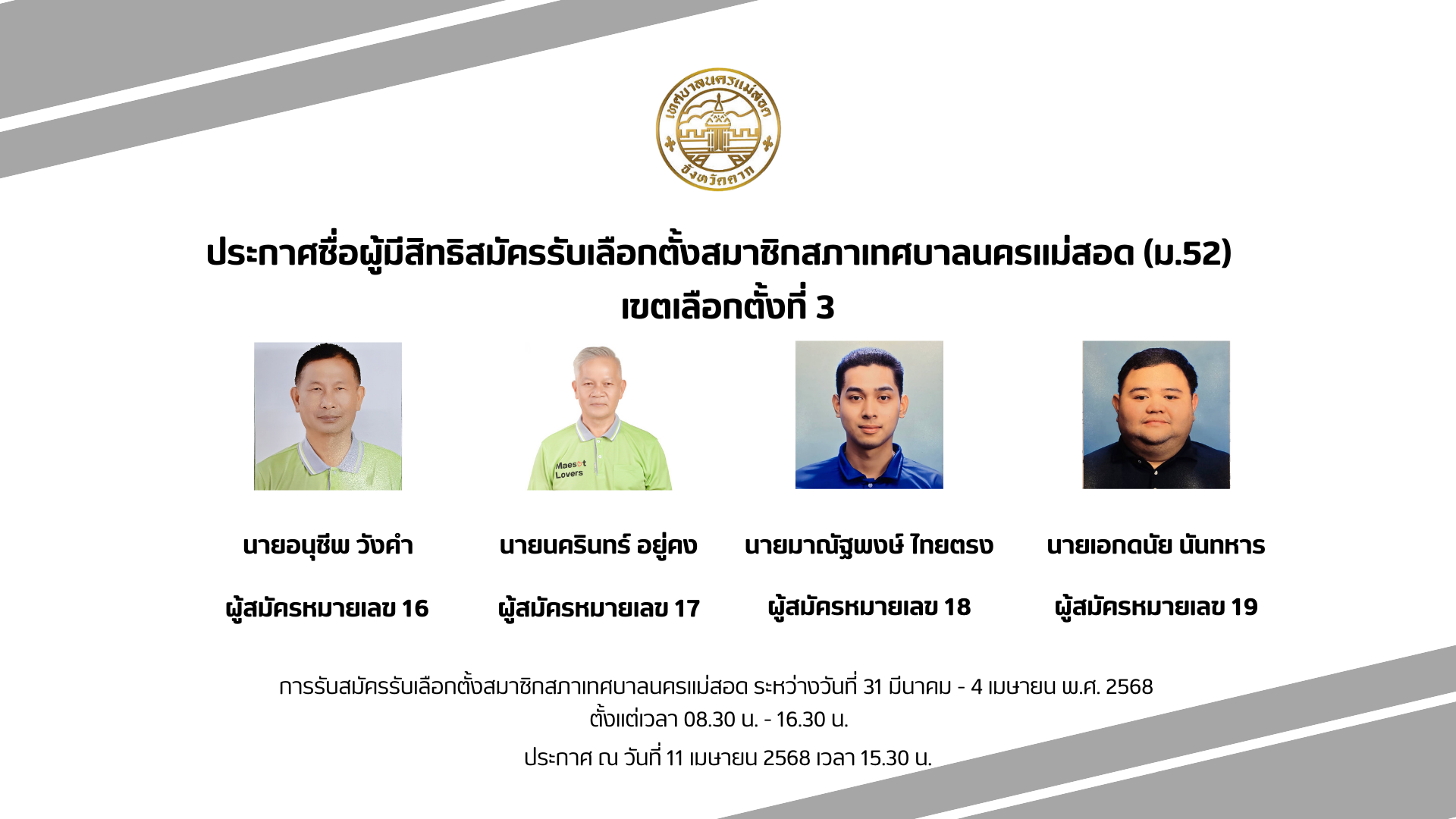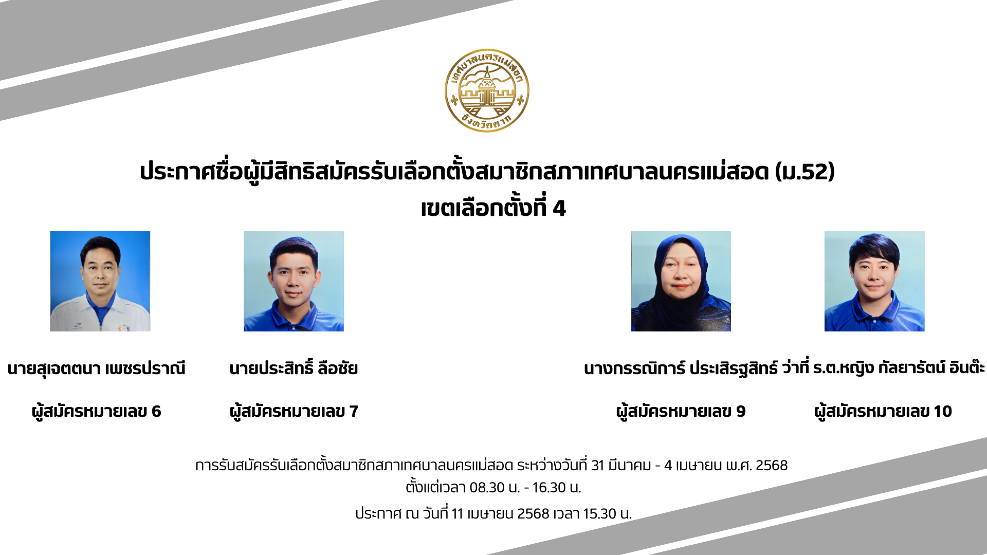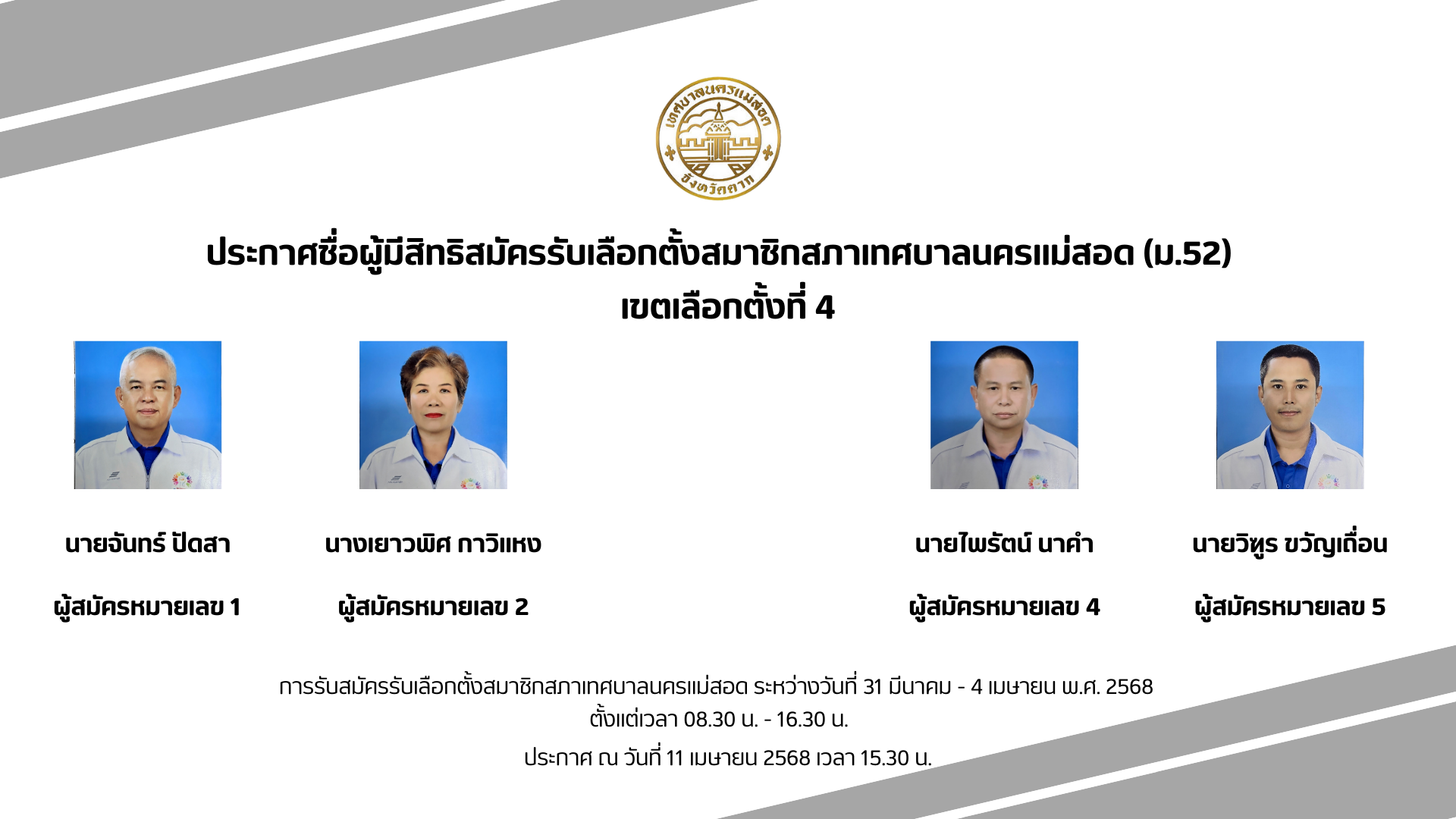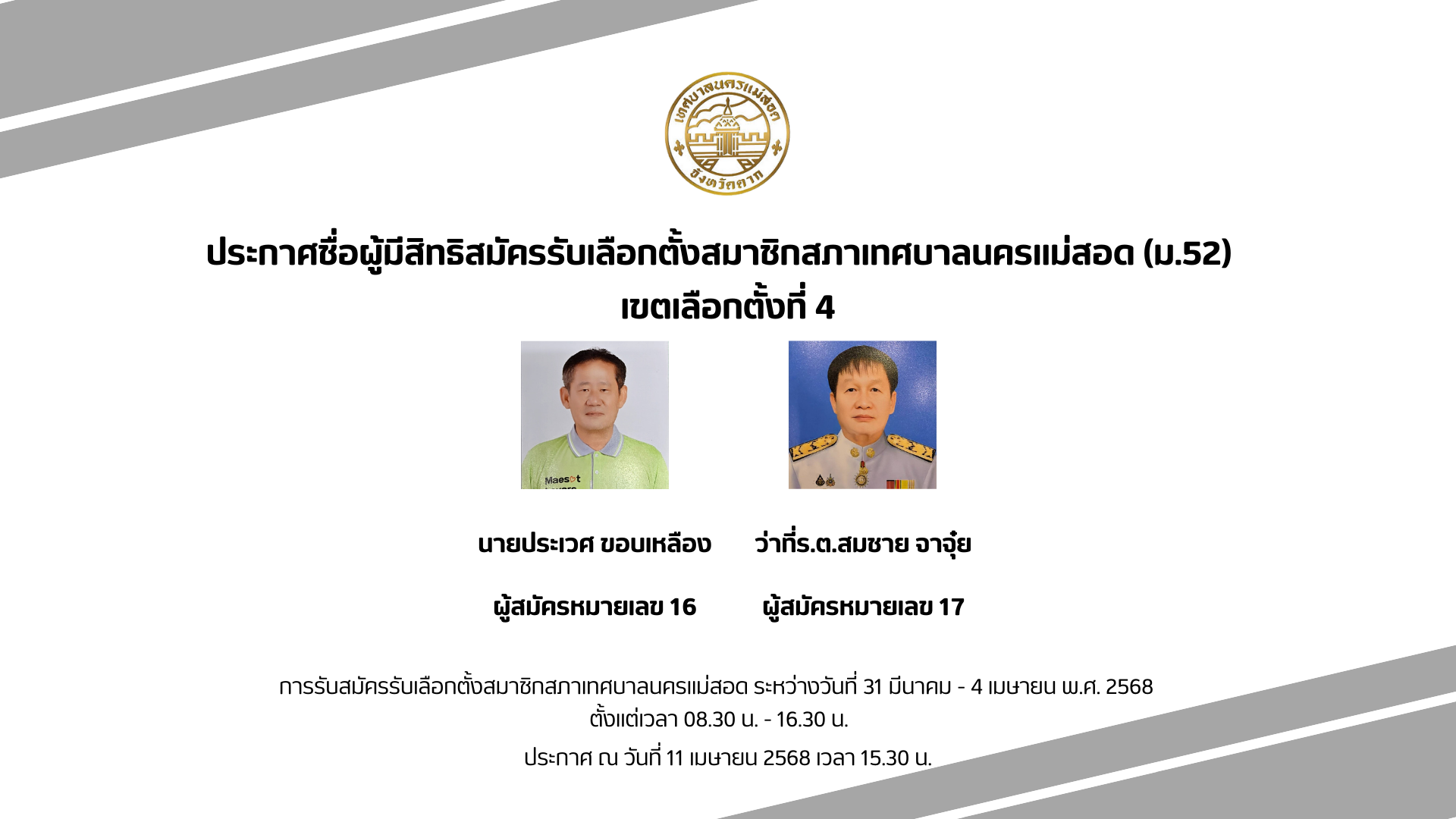 ประกาศชื่อผู้มีสิทธิสมัครรับเลือกตั้งสมาชิกสภาเทศบาลนครแม่สอด (ม.52) เขตเลือกตั้งที่ 1-4