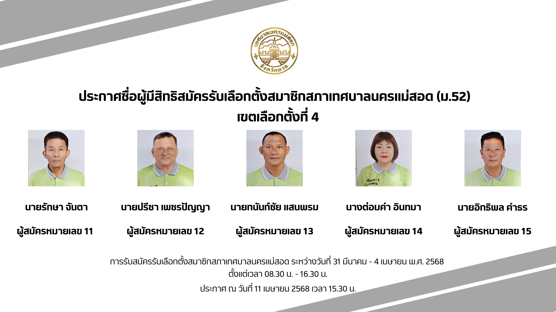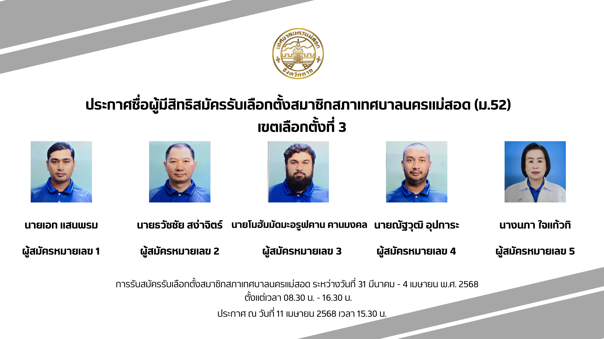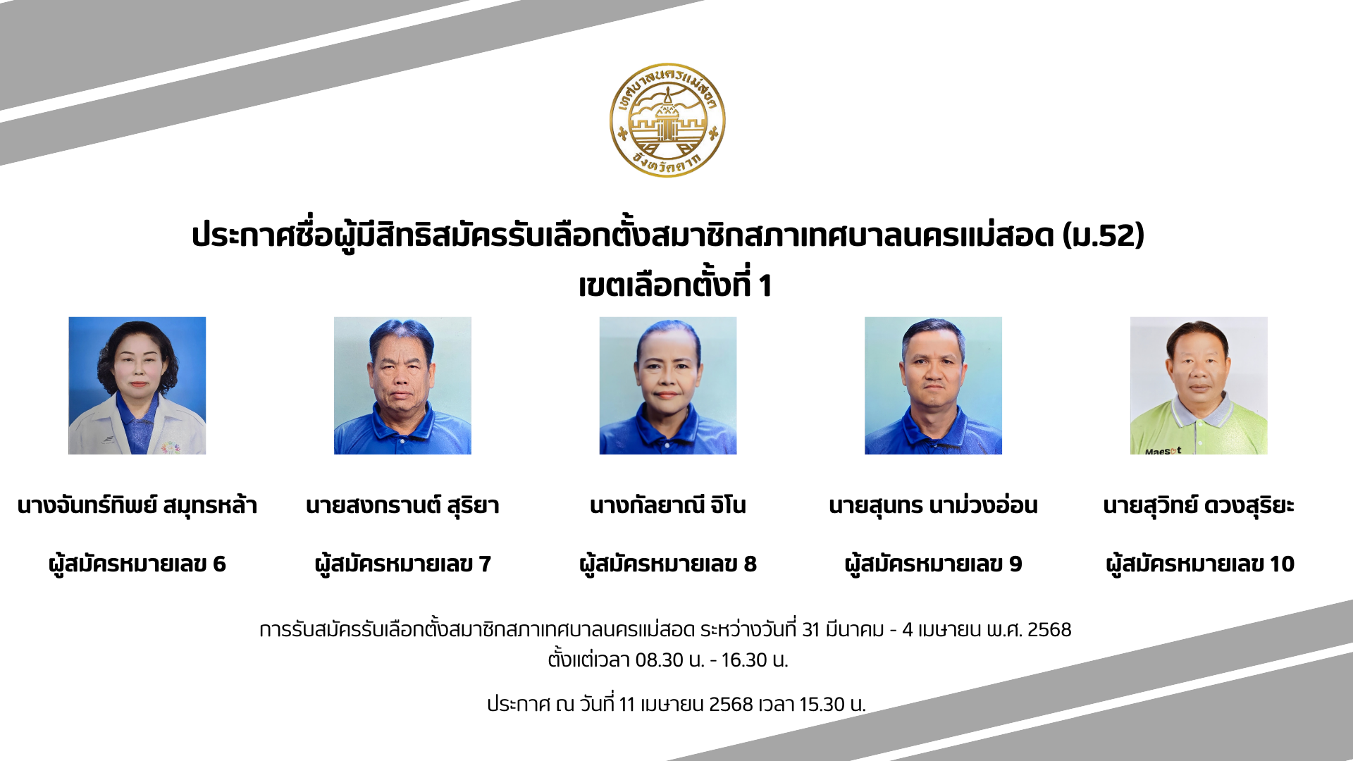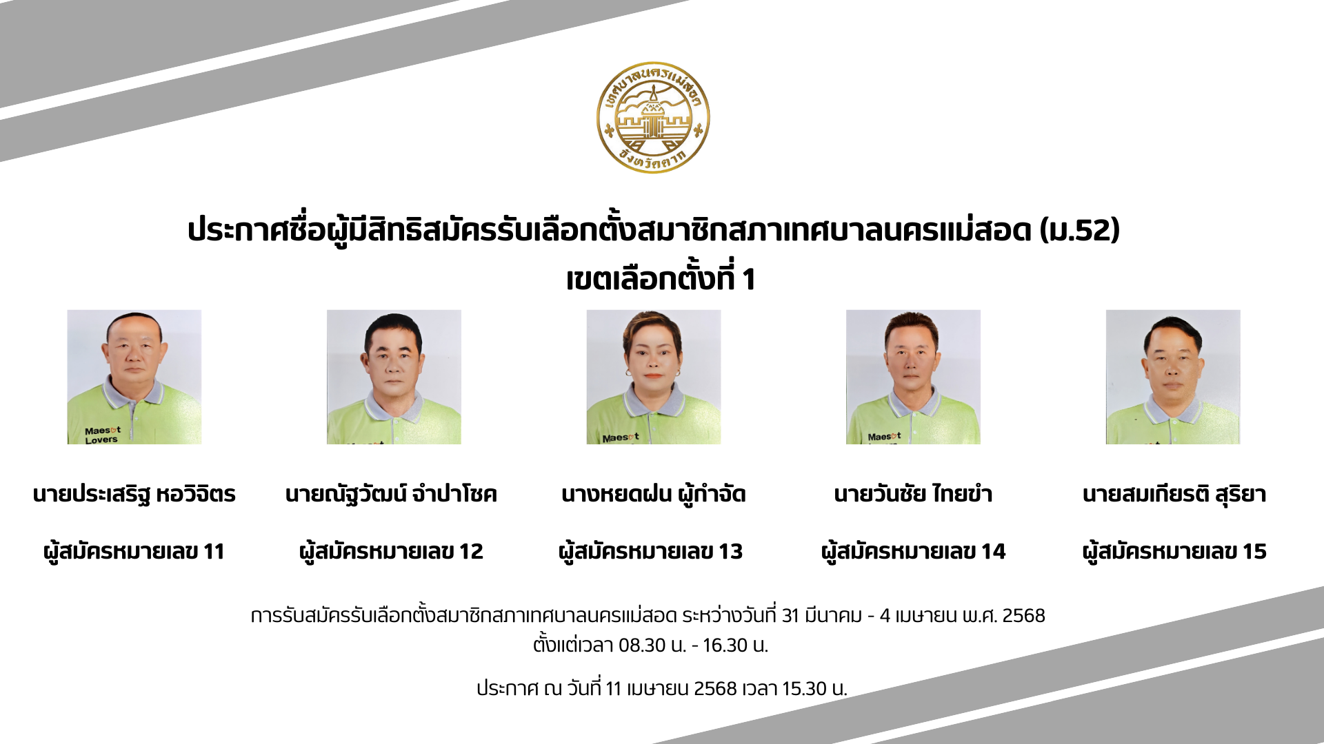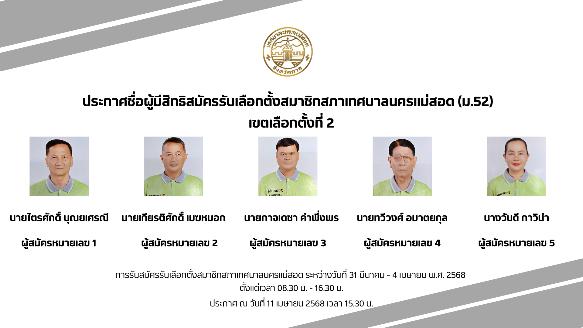 ประกาศชื่อผู้มีสิทธิสมัครรับเลือกตั้งสมาชิกสภาเทศบาลนครแม่สอด (ม.52) เขตเลือกตั้งที่ 1-4