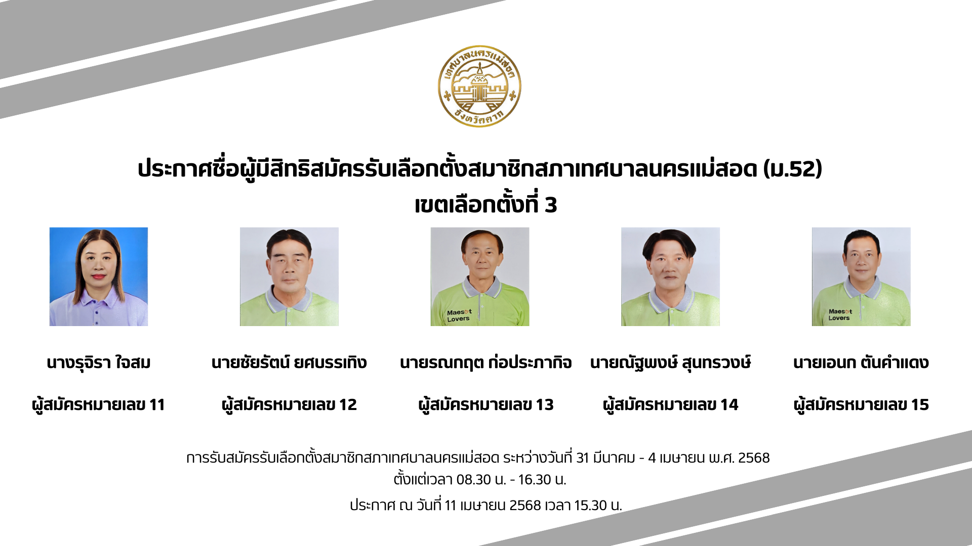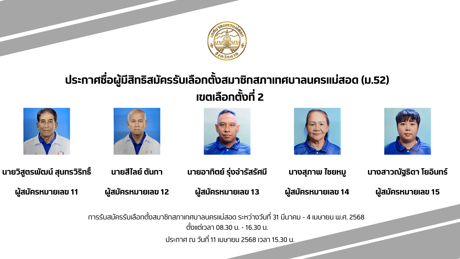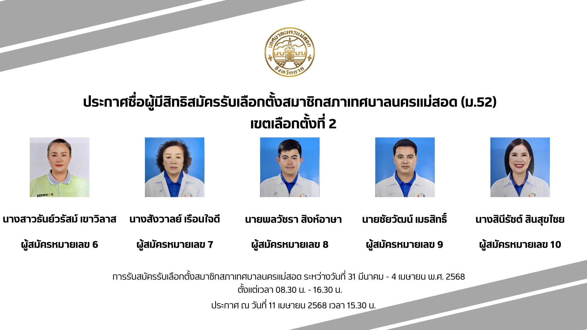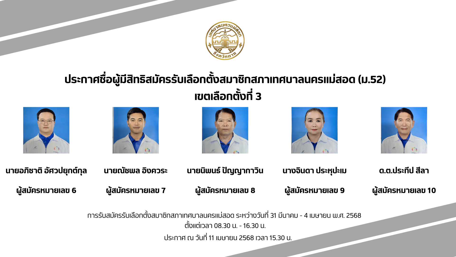 ประกาศชื่อผู้มีสิทธิสมัครรับเลือกตั้งสมาชิกสภาเทศบาลนครแม่สอด (ม.52) เขตเลือกตั้งที่ 1-4