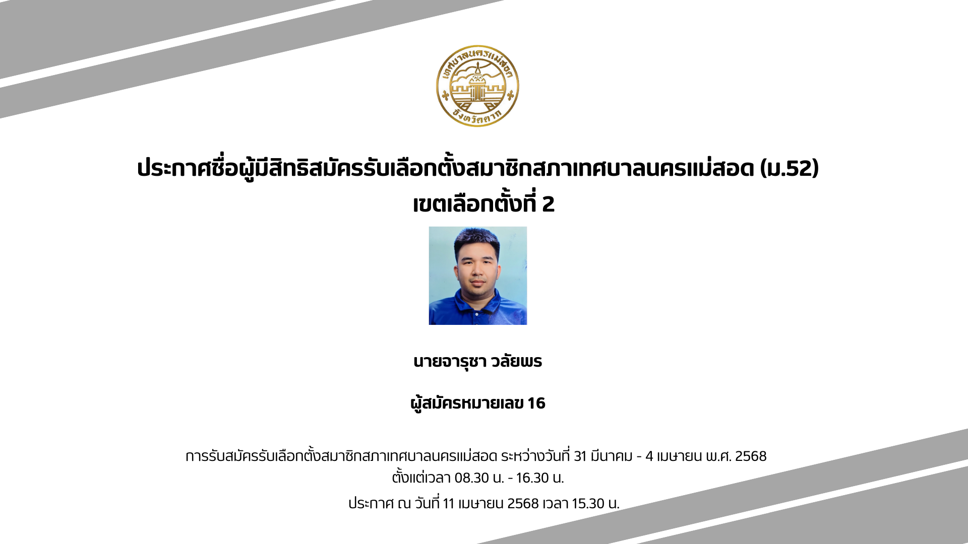 ประกาศชื่อผู้มีสิทธิสมัครรับเลือกตั้งนายกเทศมนตรีนครแม่สอด (ม.52)