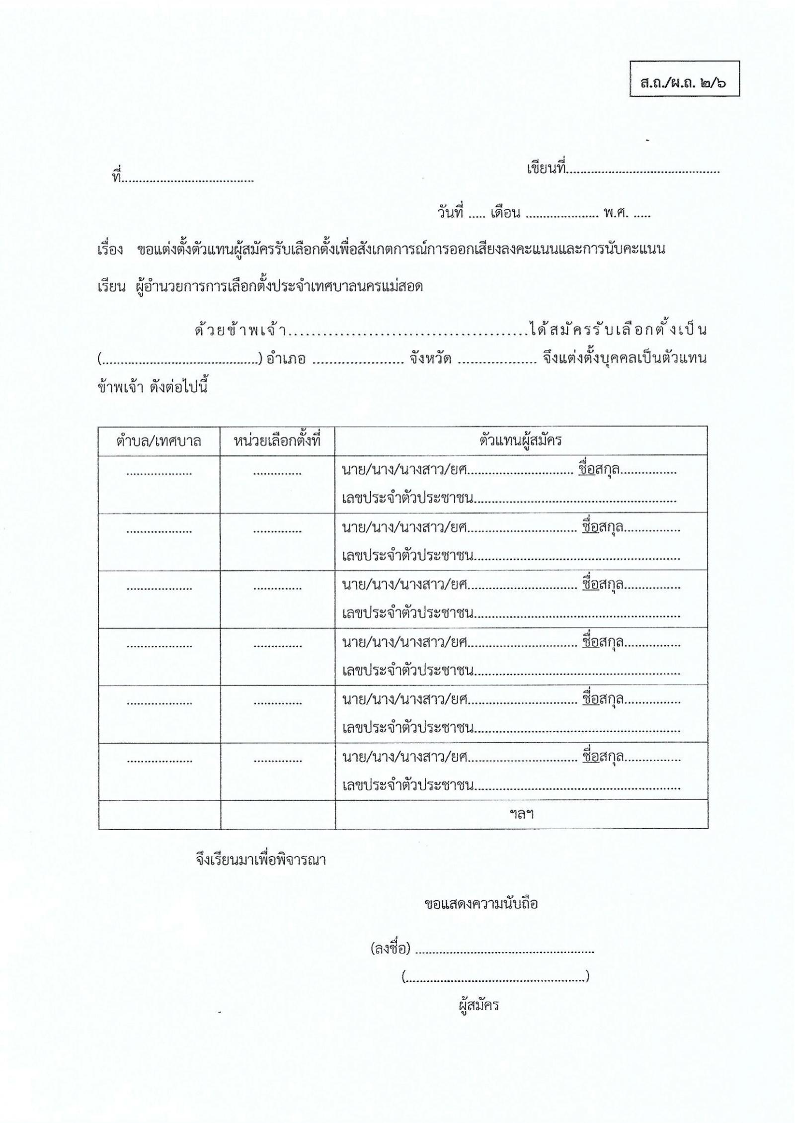 แบบฟอร์มการขอแต่งตั้งตัวแทนผู้สมัครรับเลือกตั้งเพื่อสังเกตการณ์การออกเสียงลงคะแนนและการนับคะแนน