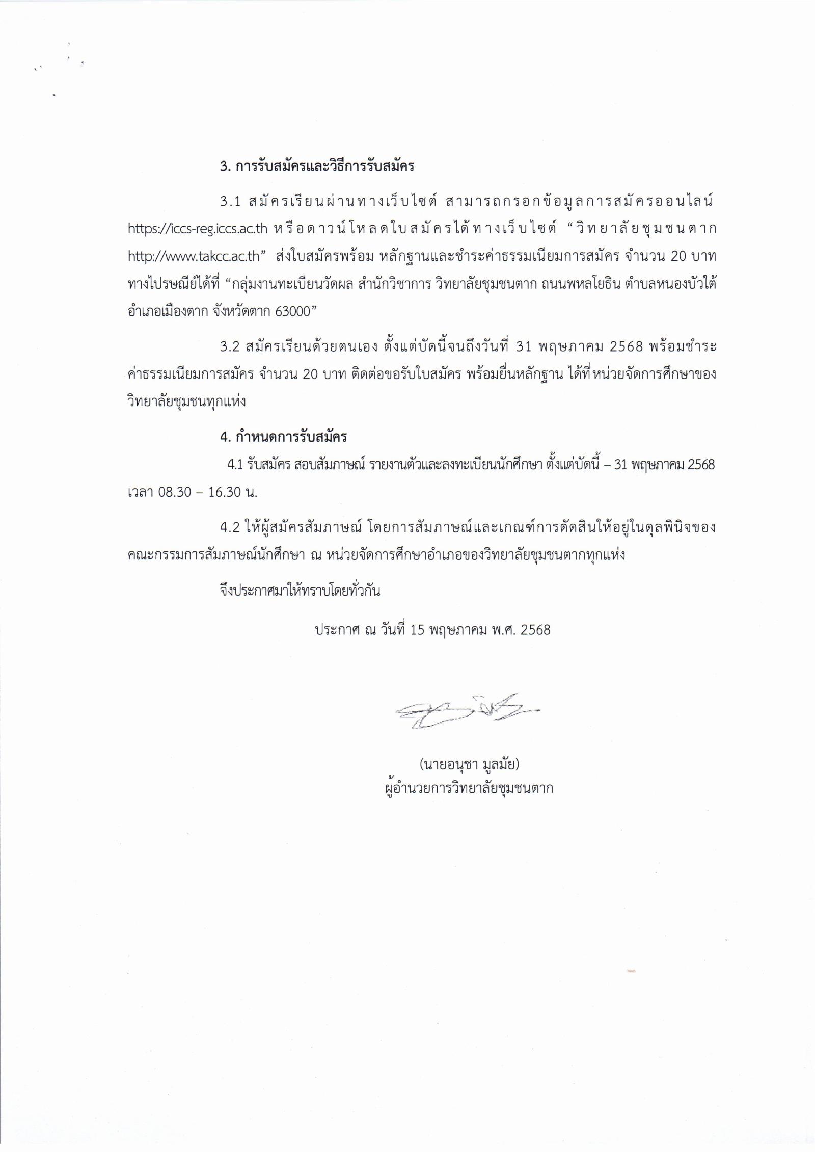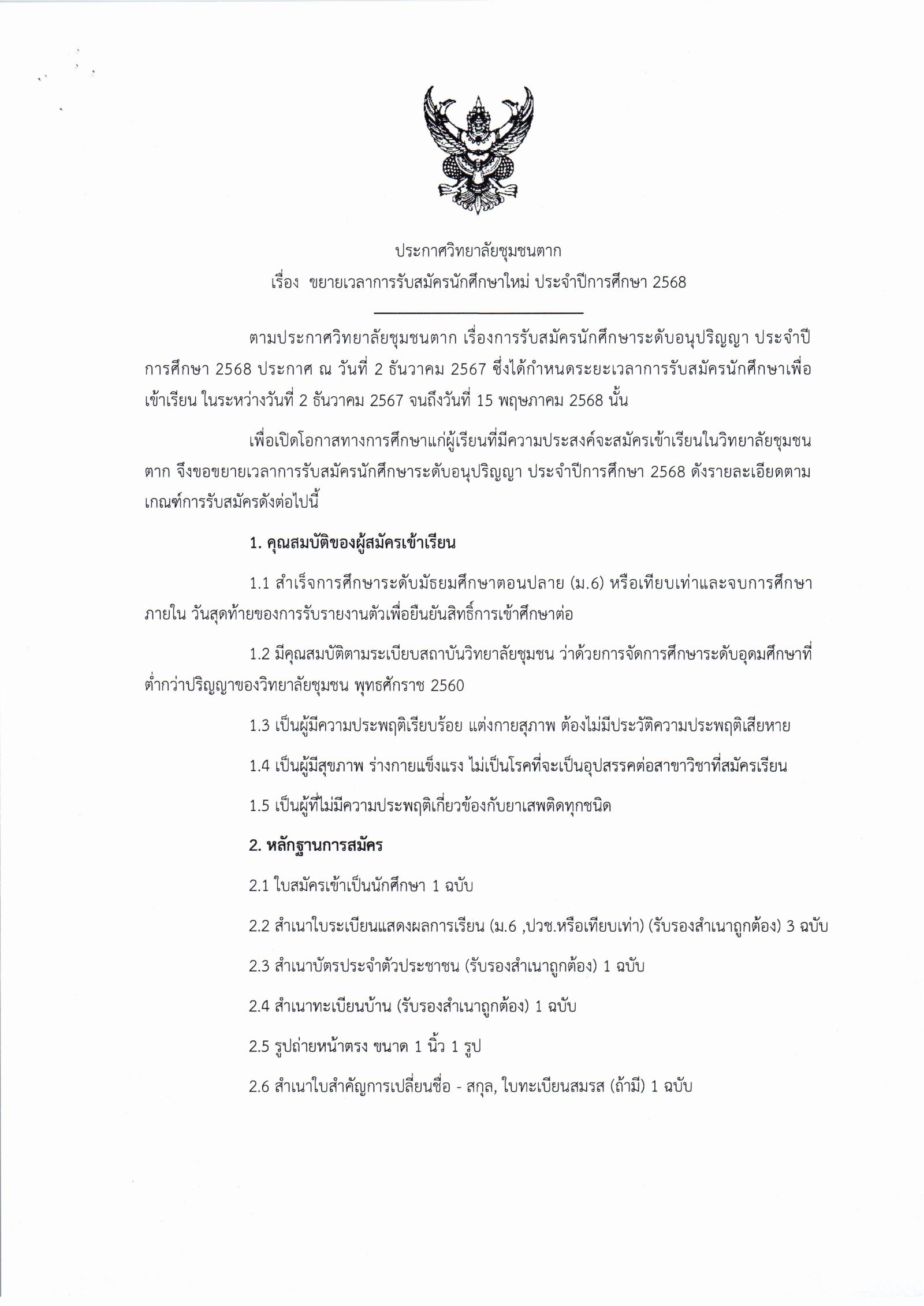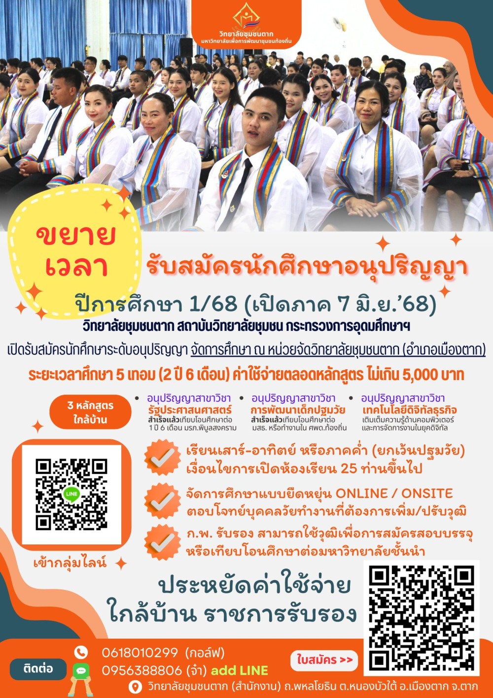 เทศบาลนครแม่สอด ขอประชาสัมพันธ์ วิทยาลัยชุมชนตากขยายระยะเวลาการรับสมัครนักศึกษาระดับอนุปริญญา ปีการศึกษา 2568