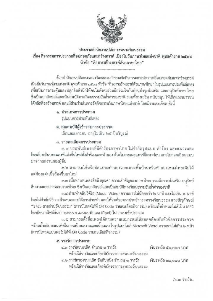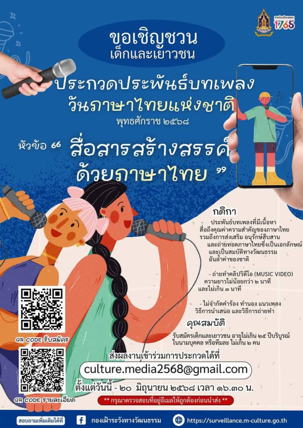 ประชาสัมพันธ์เชิญชวนเด็กและเยาวชน อายุไม่เกิน 25 ปี สมัครเข้าร่วมกิจกรรมประกวดสื่อปลอดภัยและสร้างสรรค์ เนื่องในวันภาษาไทยแห่งชาติ พุทธศักราช 2568