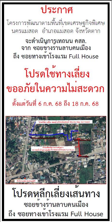 โครงการพัฒนาพื้นที่เขตพัฒนาเศรษฐกิจพิเศษนครแม่สอด อำเภอแม่สอด จังหวัดตาก นั้น เทศบาลนครแม่สอด จะเข้าดำเนินการเทถนน คสล. จากซอยข้างร้านลาบคนเมือง ถึง ซอยทางเข้าโรงแรม Full House