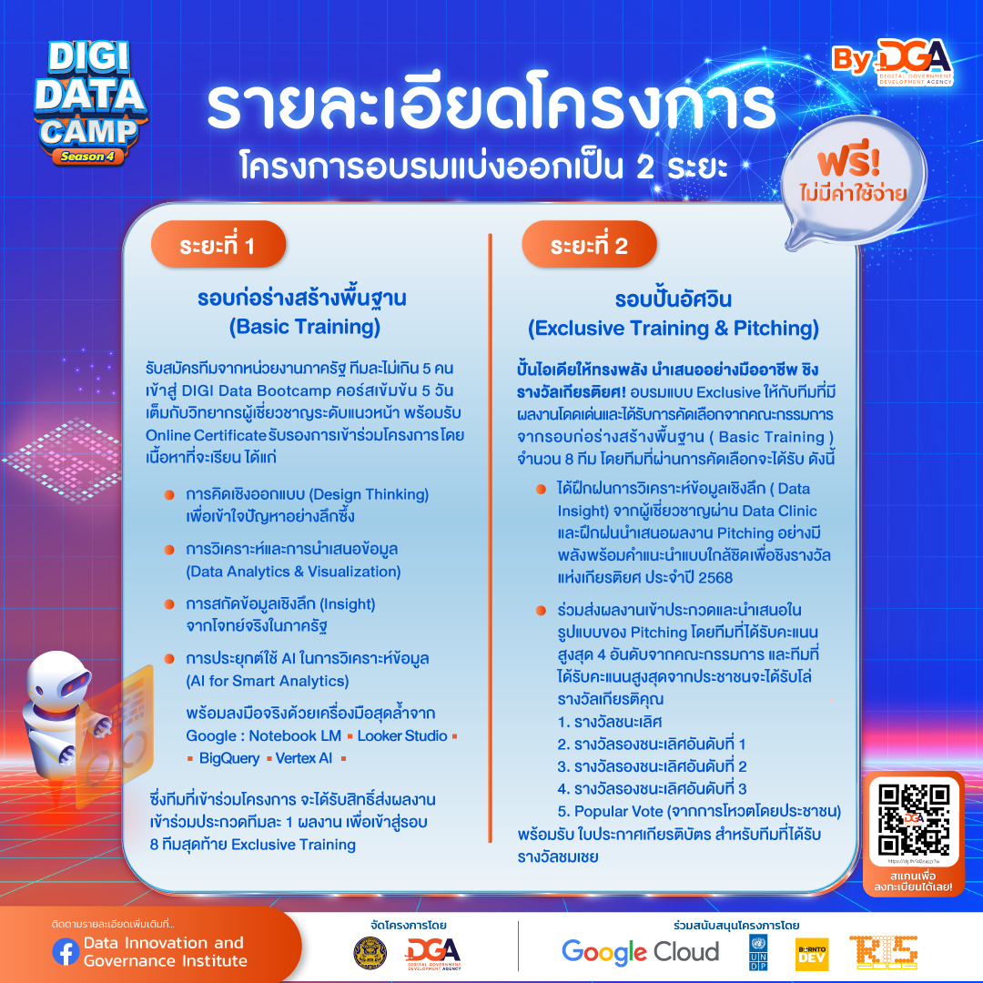 รับสมัครทีมจากหน่วยงานภาครัฐ ทีมละไม่เกิน 5 คน เข้าสู่ DIGI Data Bootcamp คอร์สเข้มข้น 5 วันเต็มกับวิทยากรผู้เชี่ยวชาญระดับแนวหน้า พร้อมรับ Online Certificate รับรองการเข้าร่วมโครงการ โดยเนื้อหาที่จะเรียน ได้แก่