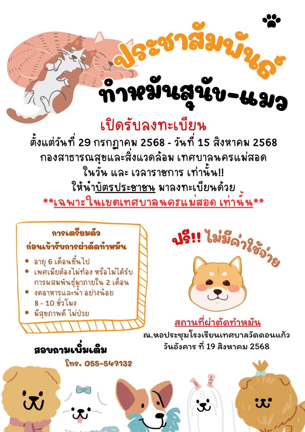 เทศบาลนครแม่สอด เปิดรับลงทะเบียนทำหมันสุนัข-แมว ตั้งแต่วันที่ 29 กรกฎาคม 2568 - วันที่ 15 สิงหาคม 2568 กองสาธารณสุขและสิ่งแวดล้อม เทศบาลนครแม่สอด ในวัน และ เวลาราชการ เท่านั้น