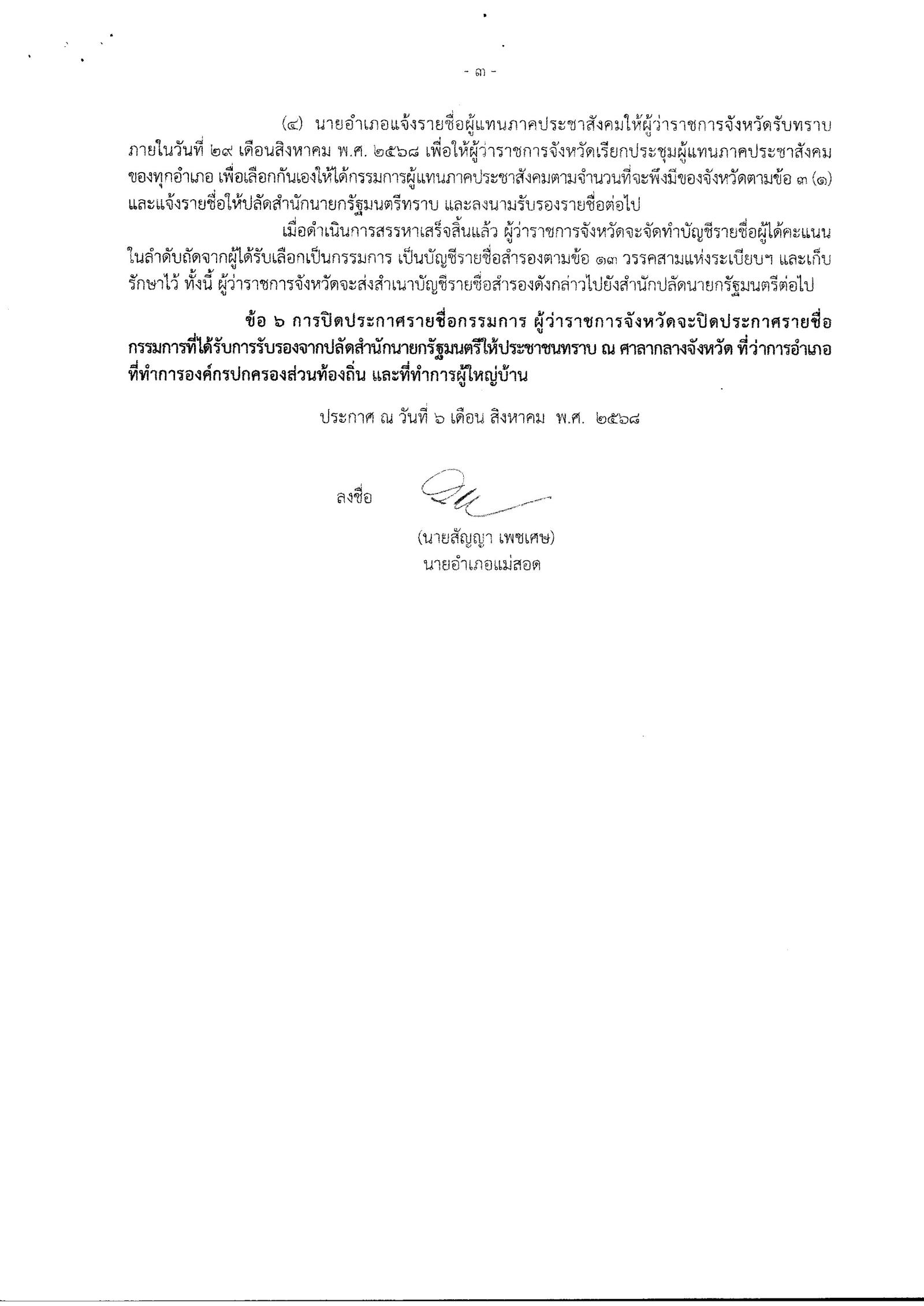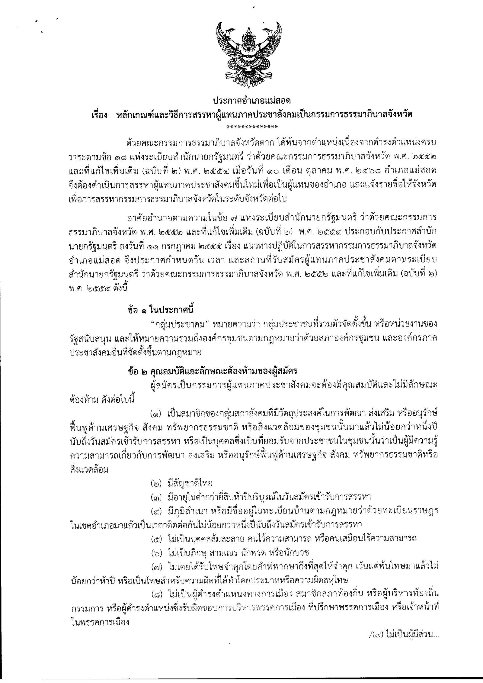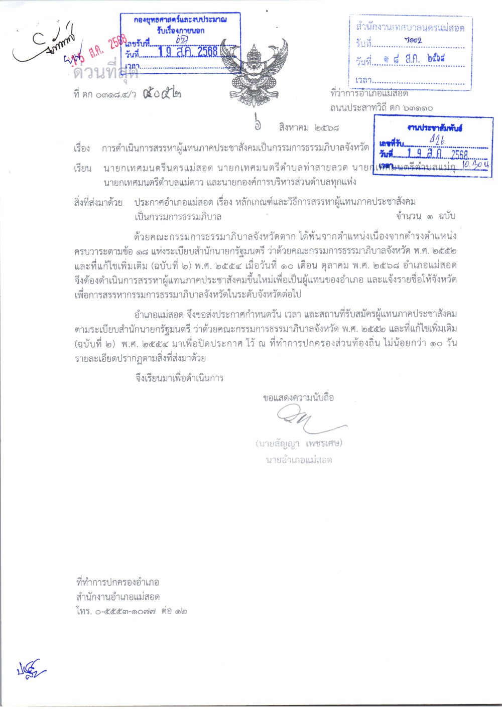 ด้วยคณะกรรมการธรรมาภิบาลจังหวัดตาก ได้พ้นจากตำแหน่งเนื่องจากดำรงตำแหน่งครบวาระตามข้อ 18 แห่งระเบียบสำนักนายกรัฐมนตรี ว่าด้วยคณะกรรมการธรรมาภิบาลจังหวัด พ.ศ. 2552และที่แก้ไขเพิ่มเติม (ฉบับที่ 2) พ.ศ. 2554 เมื่อวันที่ 10 เดือน ตุลาคม พ.ศ. 2568 อำเภอแม่สอด จึงต้องดำเนินการสรรหาผู้แทนภาคประชาสังคมขึ้นใหม่เพื่อเป็นผู้แทนของอำเภอ และแจ้งรายชื่อให้จังหวัด เพื่อการสรรหากรรมการธรรมาภิบาลจังหวัดในระดับจังหวัดต่อไป อำเภอแม่สอด จึงขอส่งประกาศกำหนดวัน เวลา และสถานที่รับสมัครผู้แทนภาคประชาสังคมตามระเบียบสำนักนายกรัฐมนตรี ว่าด้วยคณะกรรมการธรรมาภิบาลจังหวัด พ.ศ. 2552 และที่แก้ไขเพิ่มเติม(ฉบับที่ 2) พ.ศ. 2554 มาเพื่อปิดประกาศ ไว้ ณ ที่ทำการปกครองส่วนท้องถิ่น ไม่น้อยกว่า 10 วันรายละเอียดประกาศหลักเกณฑ์ปรากฏตามภาพด้านล่างนี้