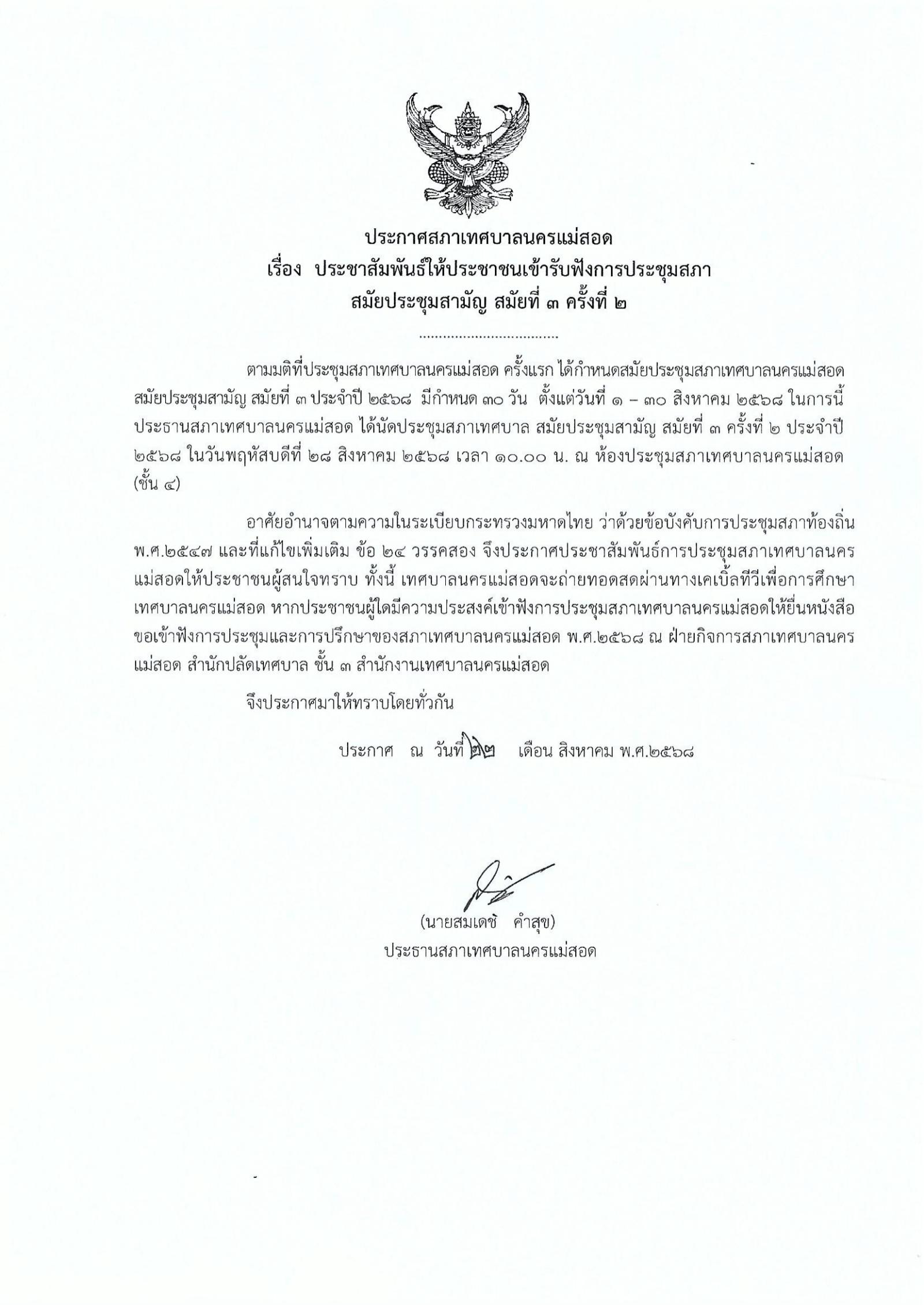 ตามมติที่ประชุมสภาเทศบาลนครแม่สอด ครั้งแรก ได้กำหนดสมัยประชุมสภาเทศบาลนครแม่สอด สมัยประชุมสามัญ สมัยที่ 3 ประจำปี 2568 มีกำหนด 30 วัน ตั้งแต่วันที่ 1 - 30 สิงหาคม 2568 ในการนี้ประธานสภาเทศบาลนครแม่สอด ได้นัดประชุมสภาเทศบาล สมัยประชุมสามัญ สมัยที่ 3 ครั้งที่ 2 ประจำปี 2568 ในวันพฤหัสบดีที่ 28 สิงหาคม 2568 เวลา10.00 น. ณ ห้องประชุมสภาเทศบาลนครแม่สอดอาศัยอำนาจตามความในระเบียบกระทรวงมหาดไทย ว่าด้วยข้อบังคับการประชุมสภาท้องถิ่นพ.ศ.2547 และที่แก้ไขเพิ่มเติม ข้อ 24 วรรคสอง จึงประกาศประชาสัมพันธ์การประชุมสภาเทศบาลนครแม่สอดให้ประชาชนผู้สนใจทราบ ทั้งนี้ เทศบาลนครแม่สอดจะถ่ายทอดสดผ่านทางเคเบิ้ลทีวีเพื่อการศึกษาเทศบาลนครแม่สอด หากประชาชนผู้ได้มีความประสงค์เข้าฟังการประชุมสภาเทศบาลนครแม่สอด ให้ยื่นหนังสือขอเข้าฟังการประชุมและการปรึกษาของสภาเทศบาลนครแม่สอด พ.ศ.2568 ณ ฝ่ายกิจการสภาเทศบาลนครแม่สอด สำนักปลัดเทศบาล ชั้น 3 สำนักงานเทศบาลนครแม่สอด