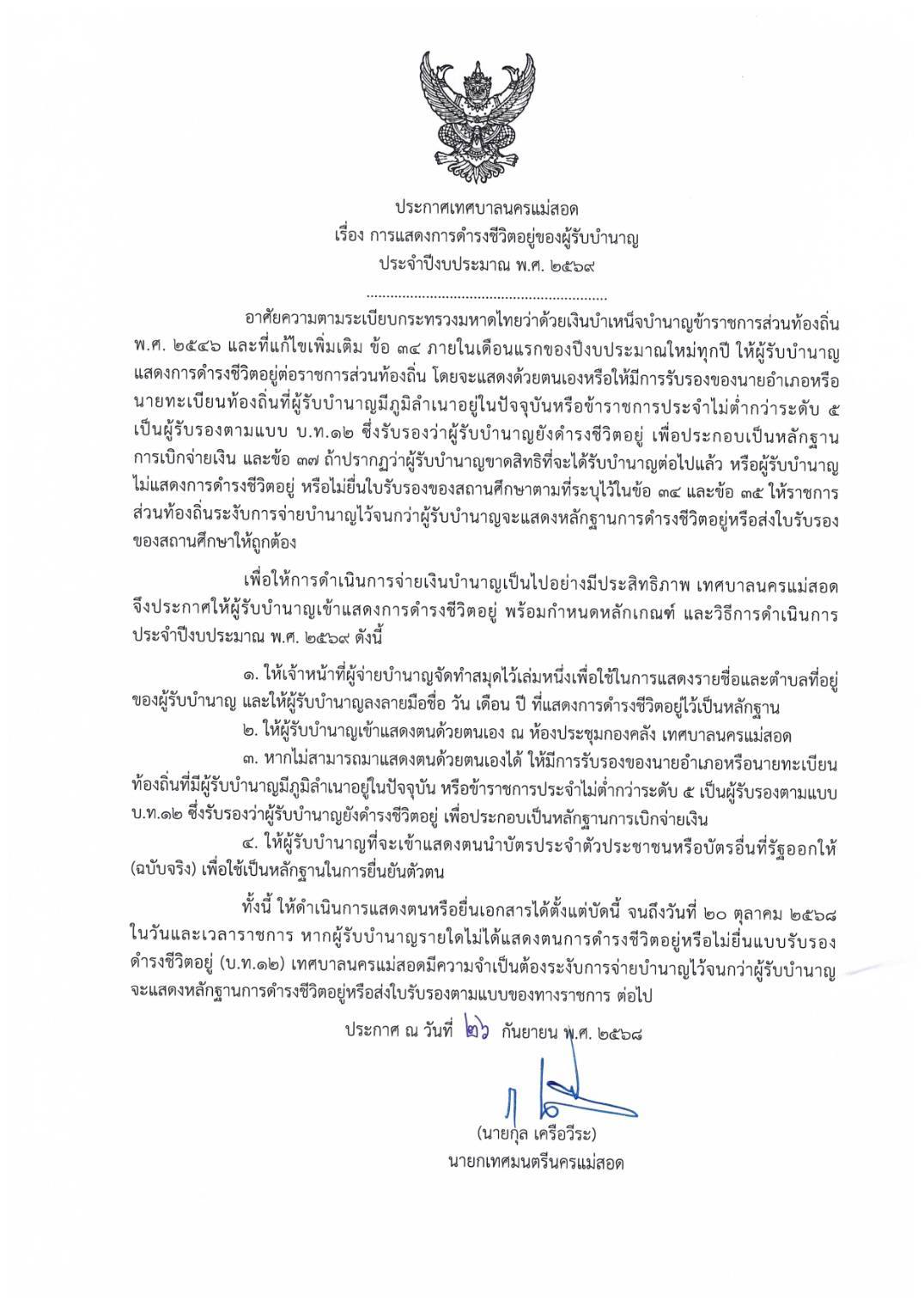 เทศบาลนครแม่สอด ประกาศการแสดงการดำรงชีวิตอยู่ของผู้รับบำนาญ ประจำปีงบประมาณ พ.ศ. 2569
