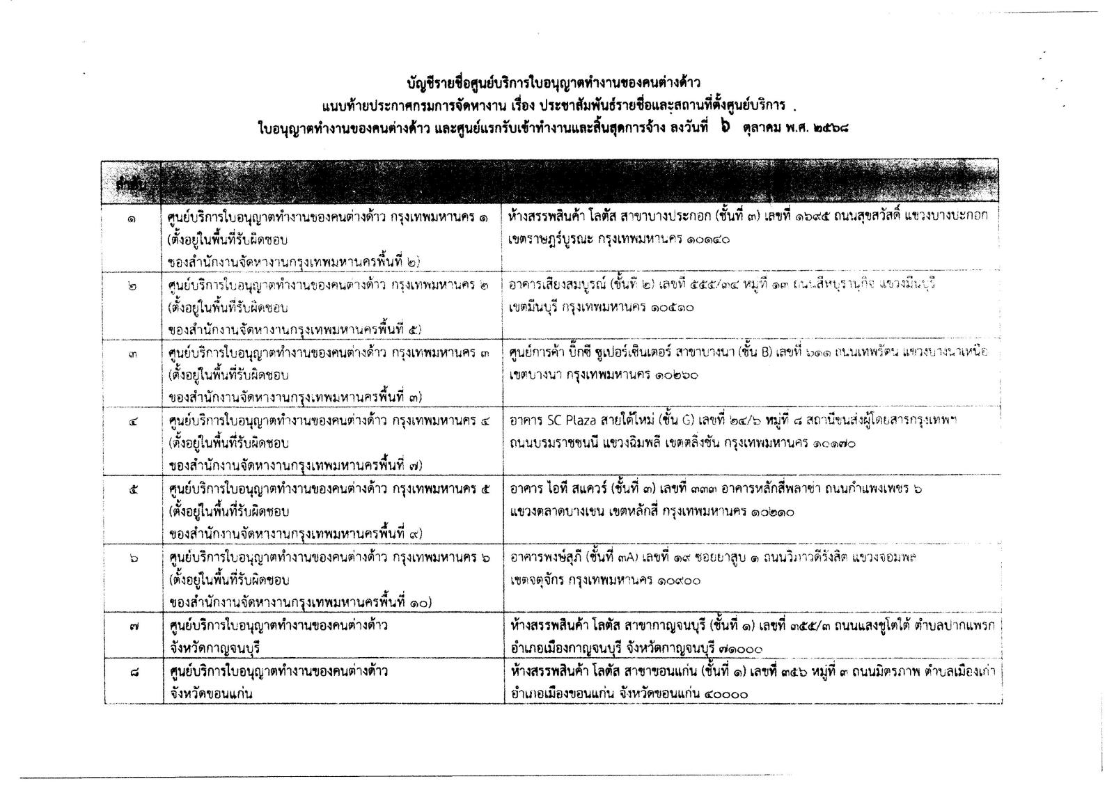 ด้วยกรมการจัดหางานได้ปรับเปลี่ยนรูปแบบและวิธีการดำเนินการให้บริการด้านการอนุญาตทำงานของคนต่างด้าว เพื่อปรับปรุงประสิทธิภาพ และคุณภาพการให้บริการด้านการทำงานของคนต่างด้าว เกี่ยวกับการขออนุญาตทำงานและการแจ้งการทำงานของคนต่างด้าว ผ่านช่องทางอิเล็กทรอนิกส์ของกรมการจัดหางานให้มีความสะดวก รวดเร็ว ทันสมัย โปร่งใส และตรวจสอบได้ ซึ่งมีกำหนดเปิดให้บริการในวันที่ 13 ตุลาคม 2568 เป็นต้นไป สำนักงานจัดหางานจังหวัดตาก จึงขอประชาสัมพันธ์ช่องทางอิเล็กทรอนิกส์สำหรับติดต่ดต่อกรมการจัดหางาน เพื่อขอรับบริการเกี่ยวกับการขออนุญาตทำงานและการแจ้งการทำงานของคนต่างด้าว และประชาสัมพันธ์รายชื่อและสถานที่ตั้งศูนย์บริการใบอนุญาตทำงานของคนต่างด้าว และศูนย์แรกรับเข้าทำงานและสิ้นสุดการจ้าง รายละเอียดตามสื่อด้านล่างนี้