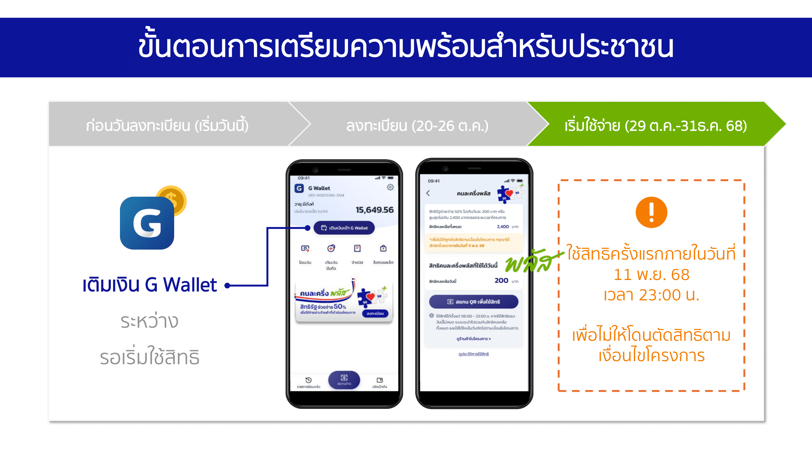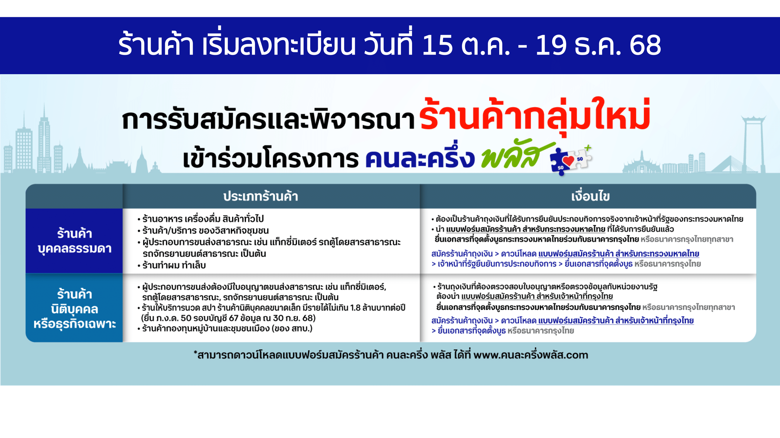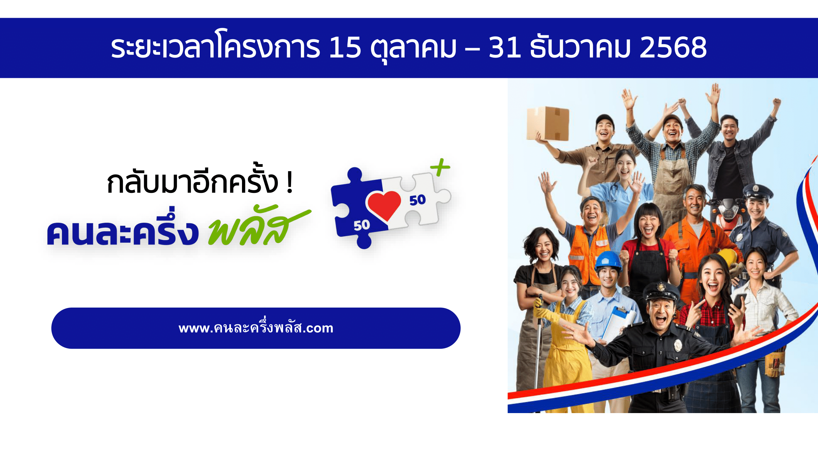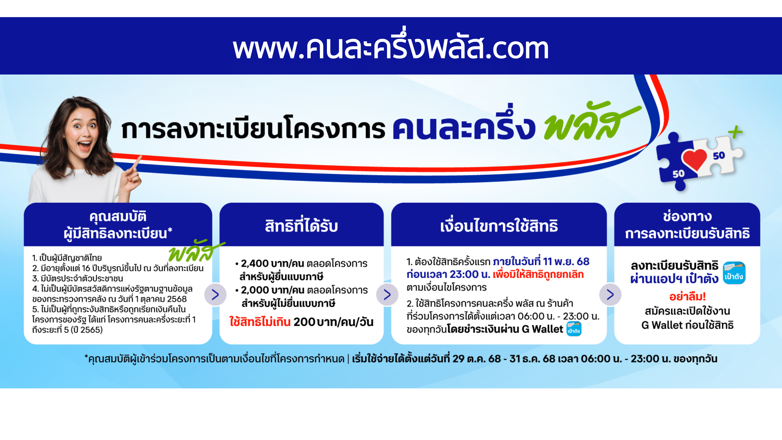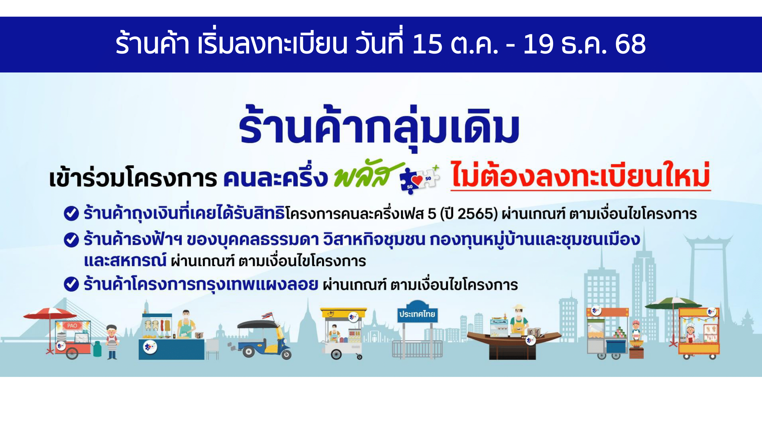 โครงการ “คนละครึ่ง พลัส” หนึ่งในนโยบายเรือธงกระตุ้นเศรษฐกิจของรัฐบาล เพื่อช่วยเหลือประชาชนในการลดรายจ่าย ลดค่าครองชีพ และช่วยสร้างรายได้สำหรับผู้ประกอบการ ร้านค้า โครงการเริ่มตั้งแต่วันที่ 15 ตุลาคม - 31 ธันวาคม 2568 ลงทะเบียนร้านค้าตั้งแต่วันที่ 15 ตุลาคม - 19 ธันวาคม 2568 ผ่านแอปพลิเคชัน “ถุงเงิน” สำหรับประชาชนลงทะเบียน ตั้งแต่วันที่ 20 ตุลาคม - 26 ตุลาคม 2568 เวลา 06.00 - 22.00 น. ผ่านแอปพลิเคชัน “เป๋าตัง” สามารถใช้สิทธิโครงการฯ ได้ตั้งแต่วันที่ 29 ตุลาคม - 31 ธันวาคม 2568 เวลา 06.00 - 23.00 น. โดยต้องใช้สิทธิครั้งแรกภายในวันที่ 11 พฤศจิกายน 2568 ก่อนเวลา 23.00 น. เพื่อไม่ให้ถูกตัดสิทธิตามเงื่อนไขโครงการ
