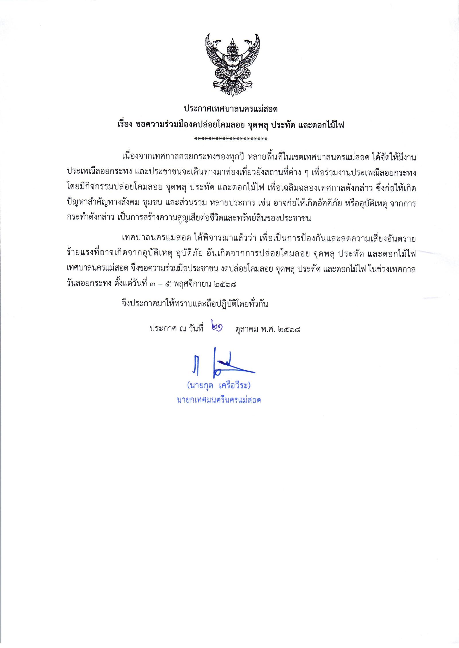 ประกาศเทศบาลนครแม่สอด เรื่อง ขอความร่วมมืองดปล่อยโคมลอย จุดพลุ ประทัด และดอกไม้ไฟ ในช่วงเทศกาลวันลอยกระทง ตั้งแต่วันที่ 3 - 5 พฤศจิกายน 2568