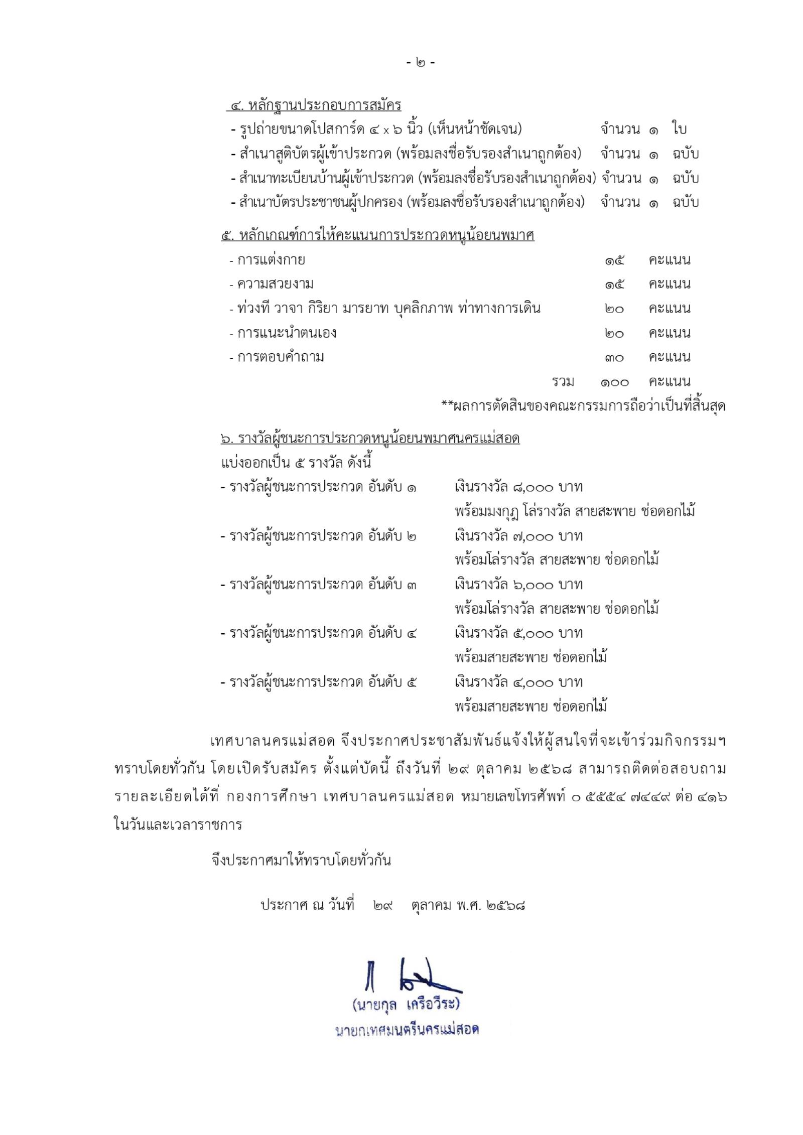 ประกาศเทศบาลนครแม่สอด เรื่อง แก้ไขหลักเกณฑ์การประกวดหนูน้อยนพมาศนครแม่สอด โครงการจัดงานประเพณีลอยกระทง ประจำปีงบประมาณ พ.ศ. 2569