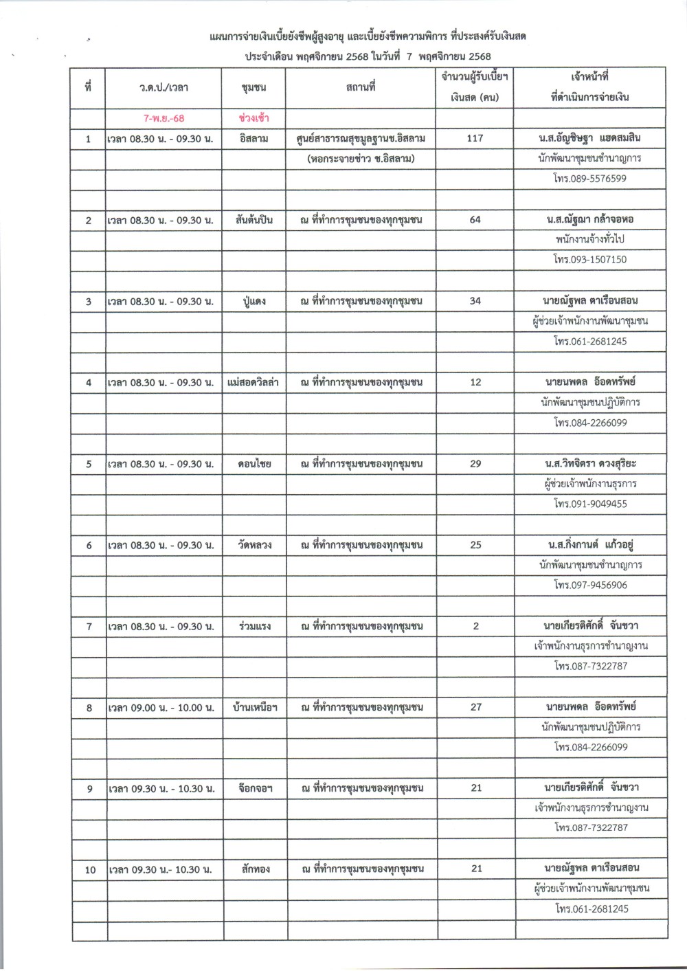 ด้วยกองสวัสดิการสังคม จะดำเนินการจ่ายเงินเบี้ยยังชีพผู้สูงอายุและเบี้ยความพิการประจำเดือนพฤศจิกายน 2568 ในวันศุกร์ ที่ 7 พฤศจิกายน 2568 ณ ที่ทำการชุมชนแต่ละชุมชน