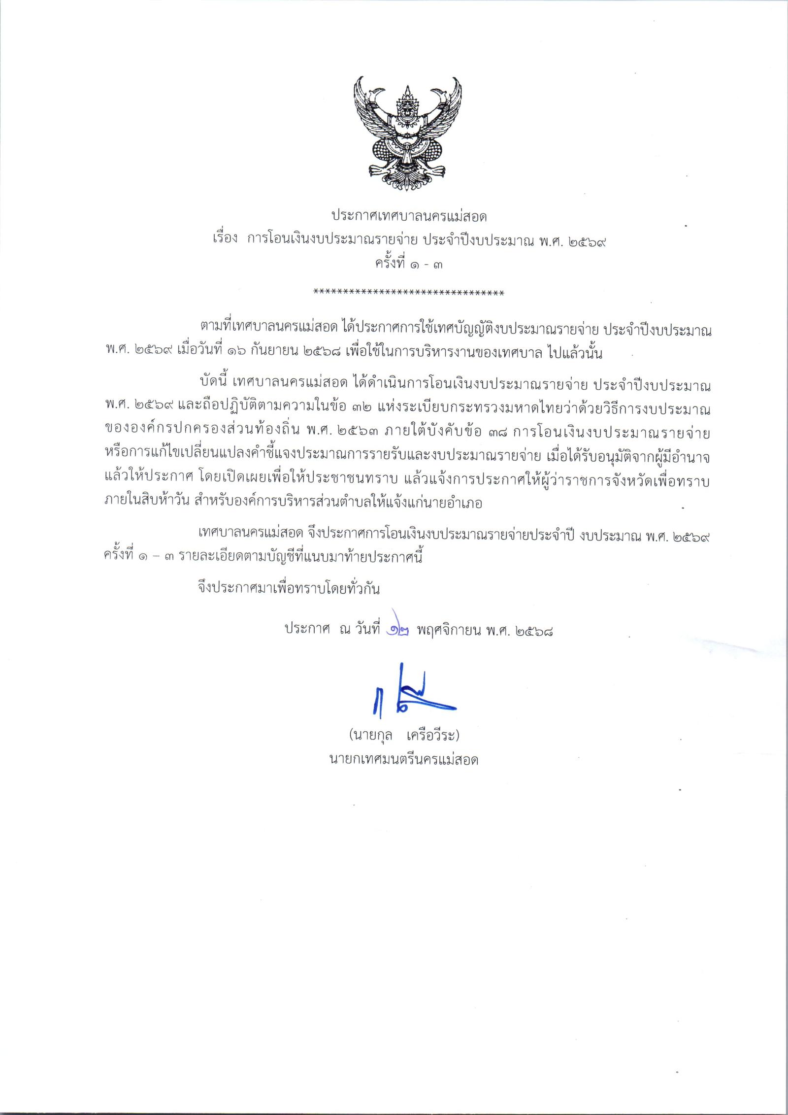 ประกาศเทศบาลนครแม่สอด เรื่อง การโอนเงินงบประมาณรายจ่าย ประจำปีงบประมาณ พ.ศ.2569 ครั้งที่ 1-3