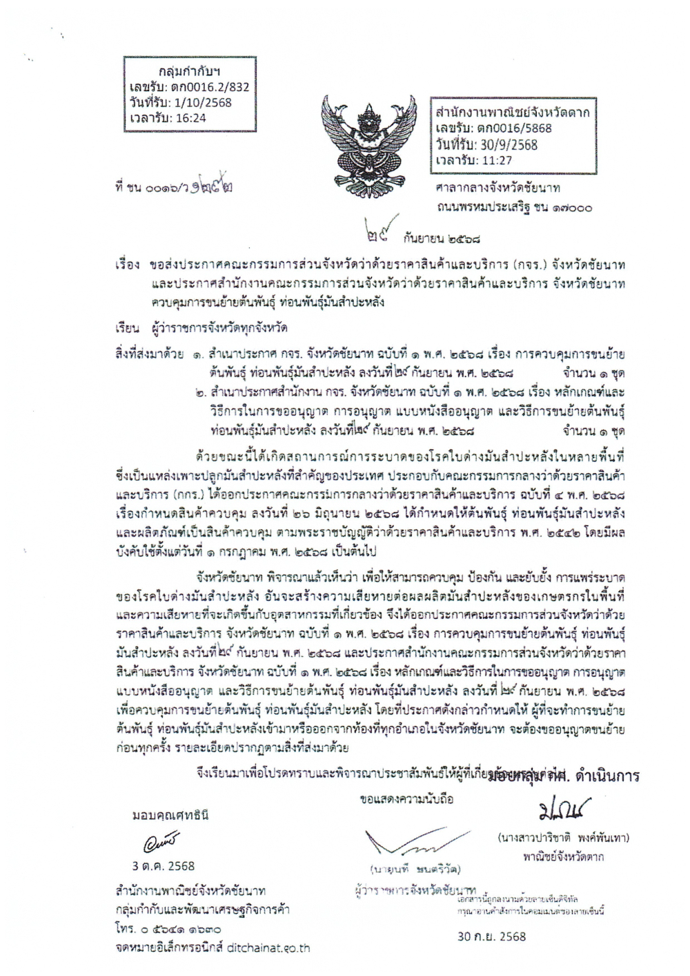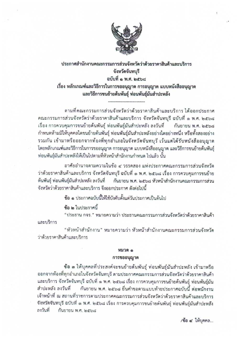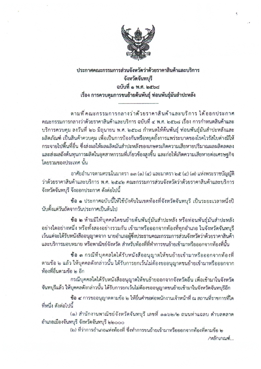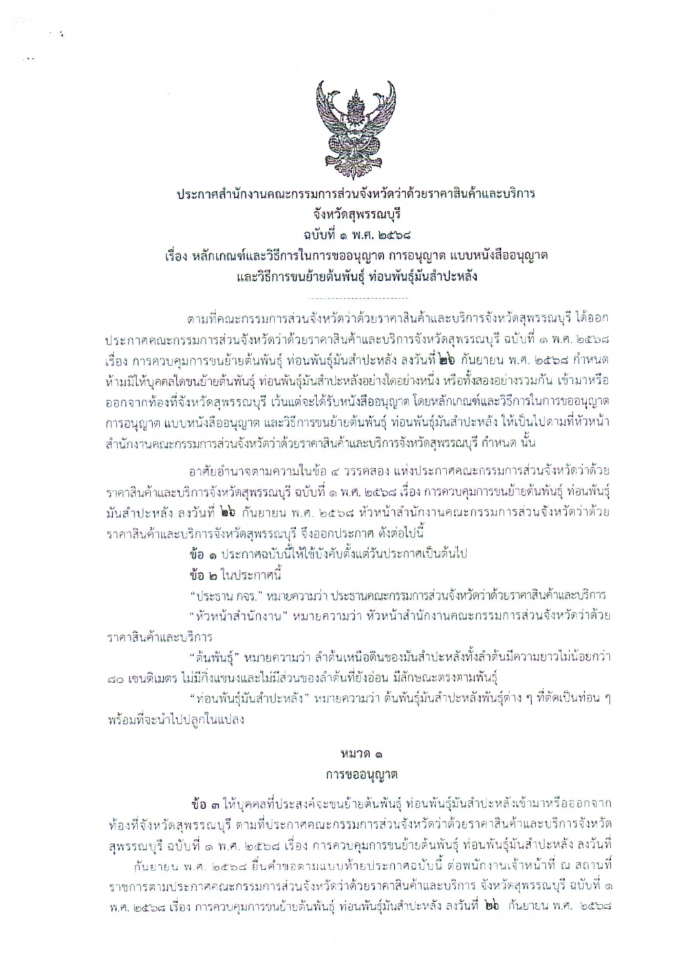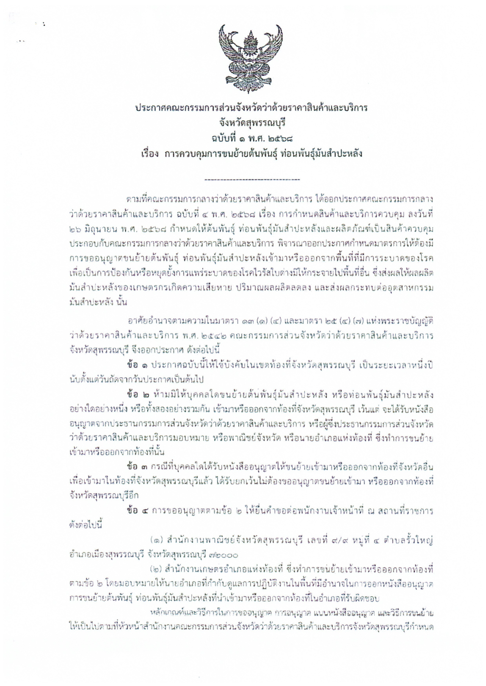 ปราจีนบุรี และจังหวัดสุพรรณบุรี ได้ออกประกาศคณะกรรมการส่วนจังหวัดว่าด้วยราคาสินค้าและบริการ ฉบับที่ 1 พ.ศ. 2568 เรื่อง การควบคุมการขนย้ายต้นพันธุ์ ท่อนพันธุ์มันสำปะหลัง และประกาศสำนักงานคณะกรรมการส่วนจังหวัดว่าด้วยราคาสินค้าและบริการ ฉบับที่ 1 พ.ศ. 2568 เรื่อง หลักเกณฑ์และวิธีการในการอนุญาต แบบหนังสืออนุญาต และวิธีการขนย้ายต้นพันธุ์ ท่อนพันธุ์มันสำปะหลังโดยกำหนดให้ผู้ที่จะทำการขนย้ายต้นพันธุ์ ท่อนพันธุ์มันสำปะหลัง อย่างใดอย่างหนึ่งหรือทั้งสองอย่างรวมกันเข้ามาหรือออกต้องขออนุญาตขนย้ายก่อนทุกครั้ง จึงแจ้งให้เกษตรกรผู้ปลูกมันลำปะหลังและผู้ที่เกี่ยวข้องรับทราบ รายละเอียดประกาศตามลิ้งค์ด้านล่างนี้