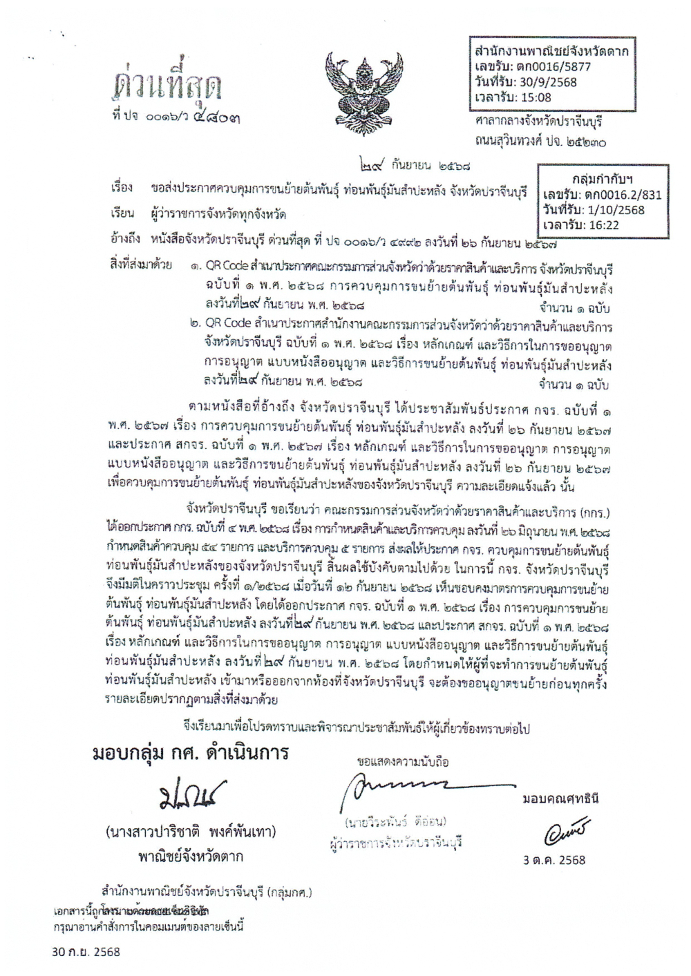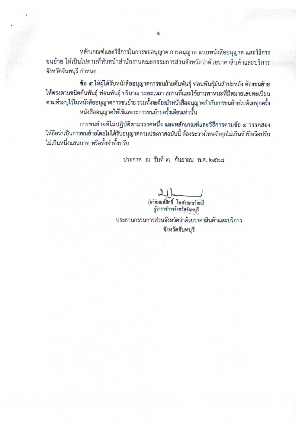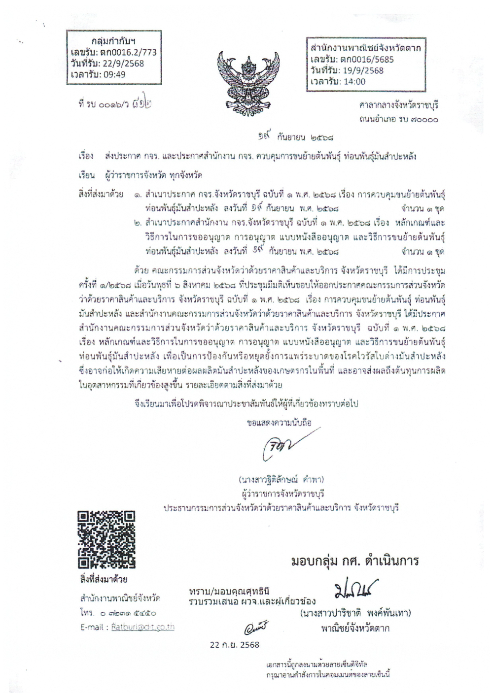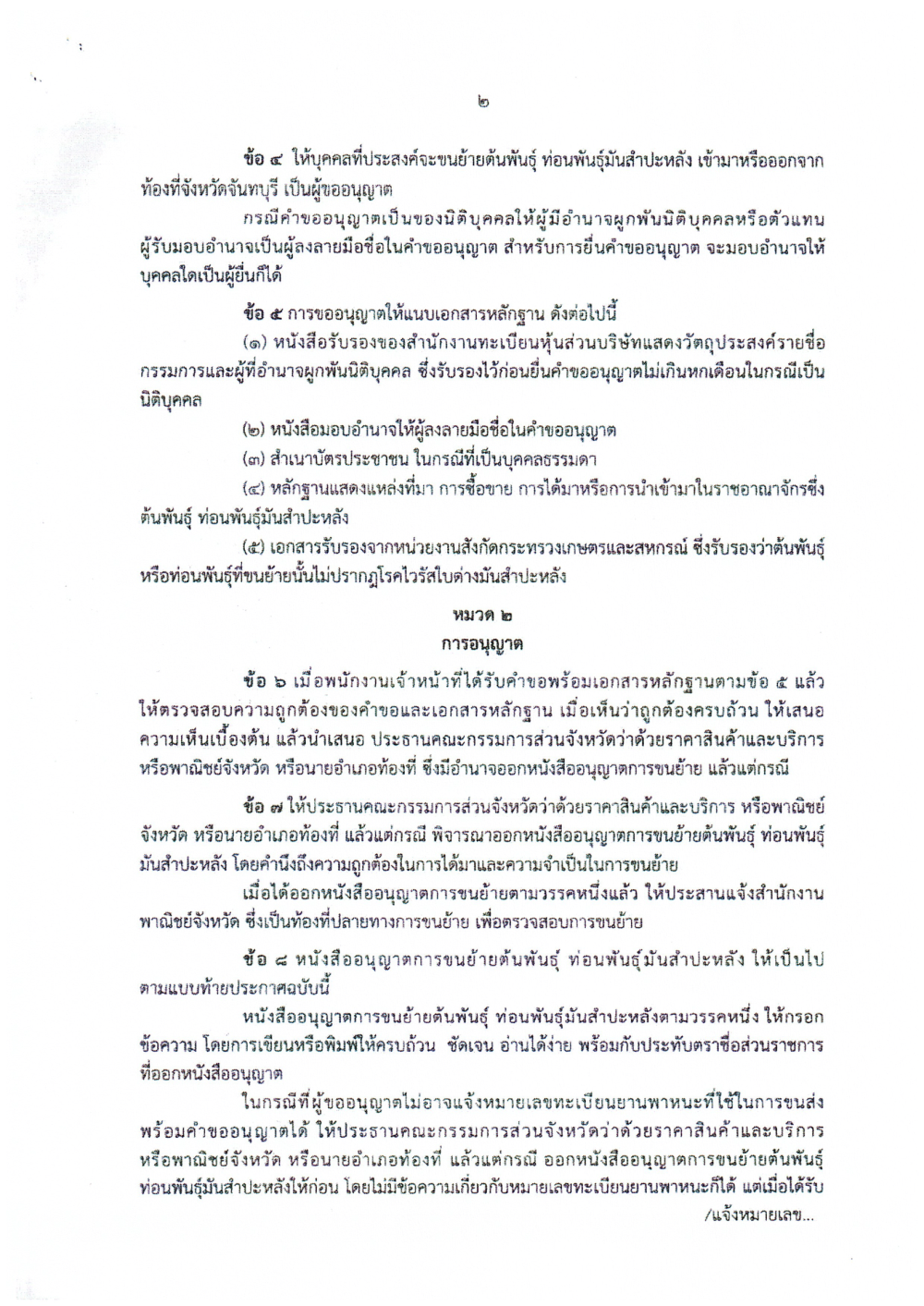 ปราจีนบุรี และจังหวัดสุพรรณบุรี ได้ออกประกาศคณะกรรมการส่วนจังหวัดว่าด้วยราคาสินค้าและบริการ ฉบับที่ 1 พ.ศ. 2568 เรื่อง การควบคุมการขนย้ายต้นพันธุ์ ท่อนพันธุ์มันสำปะหลัง และประกาศสำนักงานคณะกรรมการส่วนจังหวัดว่าด้วยราคาสินค้าและบริการ ฉบับที่ 1 พ.ศ. 2568 เรื่อง หลักเกณฑ์และวิธีการในการอนุญาต แบบหนังสืออนุญาต และวิธีการขนย้ายต้นพันธุ์ ท่อนพันธุ์มันสำปะหลังโดยกำหนดให้ผู้ที่จะทำการขนย้ายต้นพันธุ์ ท่อนพันธุ์มันสำปะหลัง อย่างใดอย่างหนึ่งหรือทั้งสองอย่างรวมกันเข้ามาหรือออกต้องขออนุญาตขนย้ายก่อนทุกครั้ง จึงแจ้งให้เกษตรกรผู้ปลูกมันลำปะหลังและผู้ที่เกี่ยวข้องรับทราบ รายละเอียดประกาศตามลิ้งค์ด้านล่างนี้