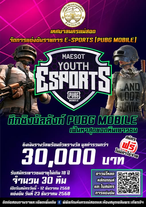 เทศบาลนครแม่สอด ขอเชิญเยาวชนผู้ที่สนใจเข้าร่วมแข่งขันรายการ E-SPORTS (PUBG MOBILE) ครั้งที่ 1 ประจำปีงบประมาณ 2569 ระดับเยาวชน อายุไม่เกิน 18 ปี ชิงเงินรางวัลพร้อมถ้วยรางวัล ภายใต้โครงการจัดกิจกรรมลานคนเก่ง