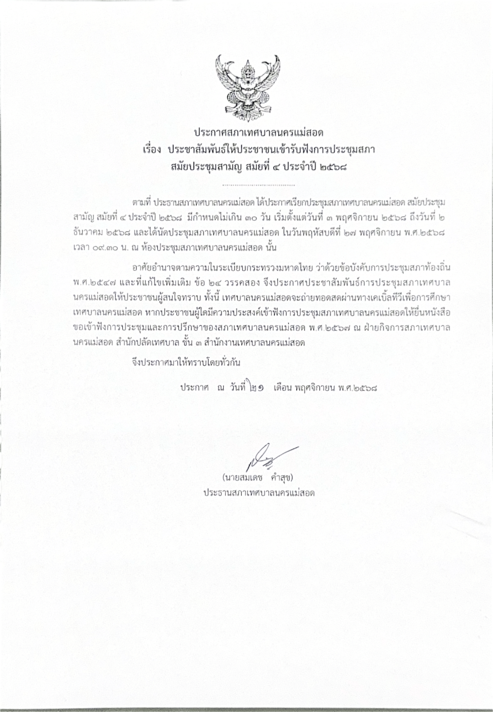 ตามที่ ประธานสภาเทศบาลนครแม่สอด ได้ประกาศเรียกประชุมสภาเทศบาลนครแม่สอด สมัยประชุมสามัญ สมัยที่ 4 ประจำปี 2568 มีกำหนดไม่เกิน 30 วัน เริ่มตั้งแต่วันที่ 3 พฤศจิกายน 2568 ถึงวันที่ 2 ธันวาคม 2568 และได้นัดประชุมสภาเทศบาลนครแม่สอด ในวันพฤหัสบดีที่ 27 พฤศจิกายน พ.ศ.2568 เวลา 09.30 น. ณ ห้องประชุมสภาเทศบาลนครแม่สอด เทศบาลนครแม่สอดจึงขอประชาสัมพันธ์ให้ประชาชนผู้สนใจทราบว่าเทศบาลนครแม่สอดจะถ่ายทอดสดผ่านทางเคเบิ้ลทีวีเพื่อการศึกษาเทศบาลนครแม่สอด และหากประชาชนผู้ใดมีความประสงค์เข้าฟังการประชุมสภาเทศบาลนครแม่สอดให้ยื่นหนังสือ ขอเข้าฟังการประชุมและการปรึกษาของสภาเทศบาลนครแม่สอด พ.ศ 2567 ณ ฝ่ายกิจการสภาเทศบาลนครแม่สอด สำนักปลัดเทศบาล ชั้น 3 สำนักงานเทศบาลนครแม่สอด จึงประกาศมาให้ทราบโดยทั่วกัน