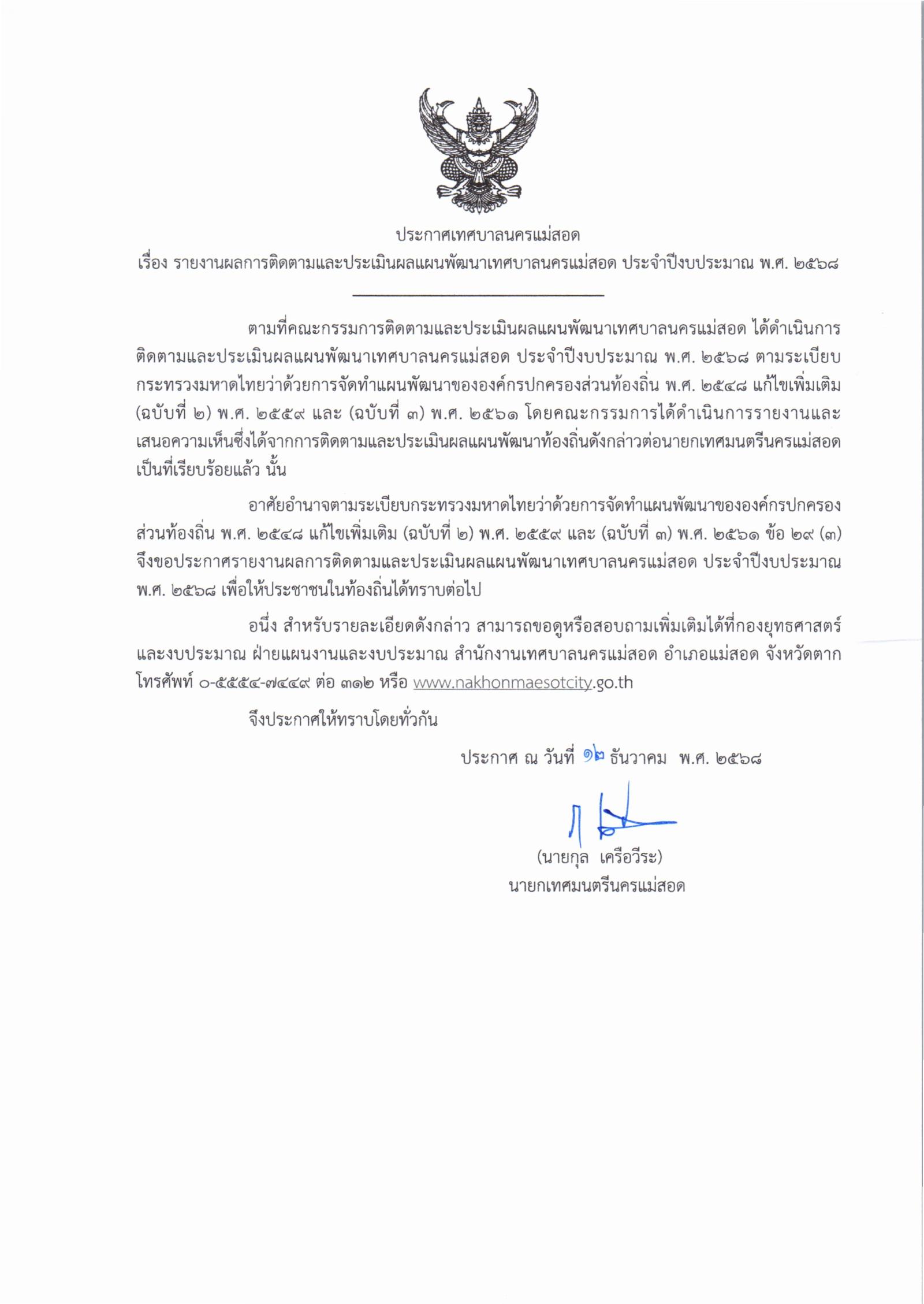 ประกาศเทศบาลนครแม่สอด เรื่อง รายงานผลการติดตามและประเมินผลแผนพัฒนาเทศบาลนครแม่สอด ประจำปีงบประมาณ พ.ศ.2568