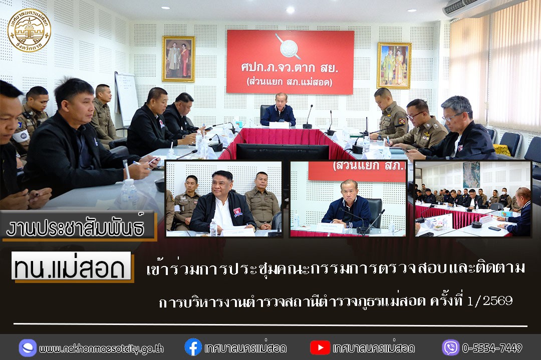 เมื่อวันพุธ ที่ 14 มกราคม 2569 เวลา 10.00 น. ณ ห้องประชุม (ชั้น 2) สถานีตำรวจภูธรแม่สอด อำเภอแม่สอด จังหวัดตาก นายกุล เครือวีระ นายกเทศมนตรีนครแม่สอด เข้าร่วมการประชุมคณะกรรมการตรวจสอบและติดตามการบริหารงานตำรวจสถานีตำรวจภูธรแม่สอด ครั้งที่ 1/2569 โดยมี นายบรรพต ก่อเกียรติเจริญ ประธานคณะกรรมการตรวจสอบและติดตามการบริหารงานตำรวจ สถานีตำรวจภูธรแม่สอด เป็นประธานในการประชุมฯ