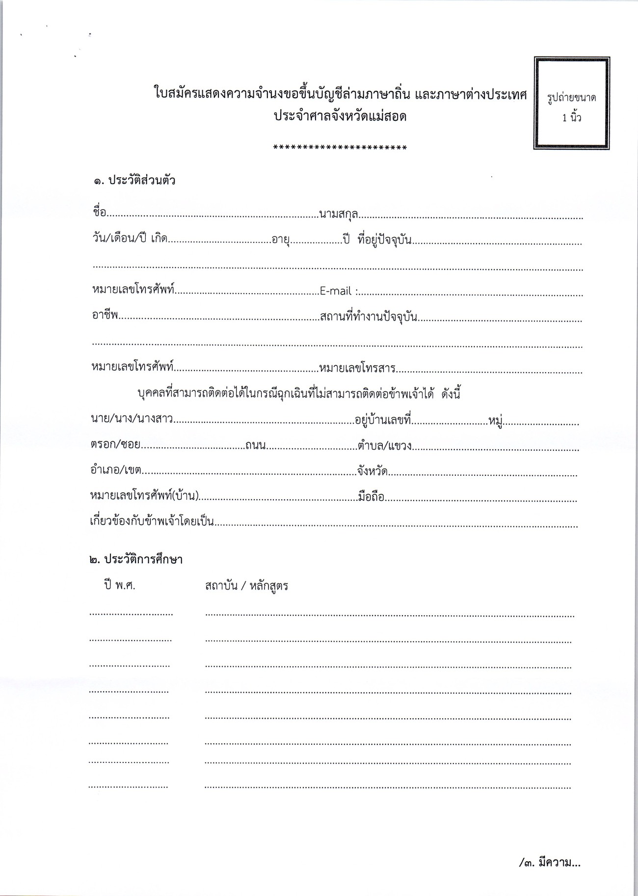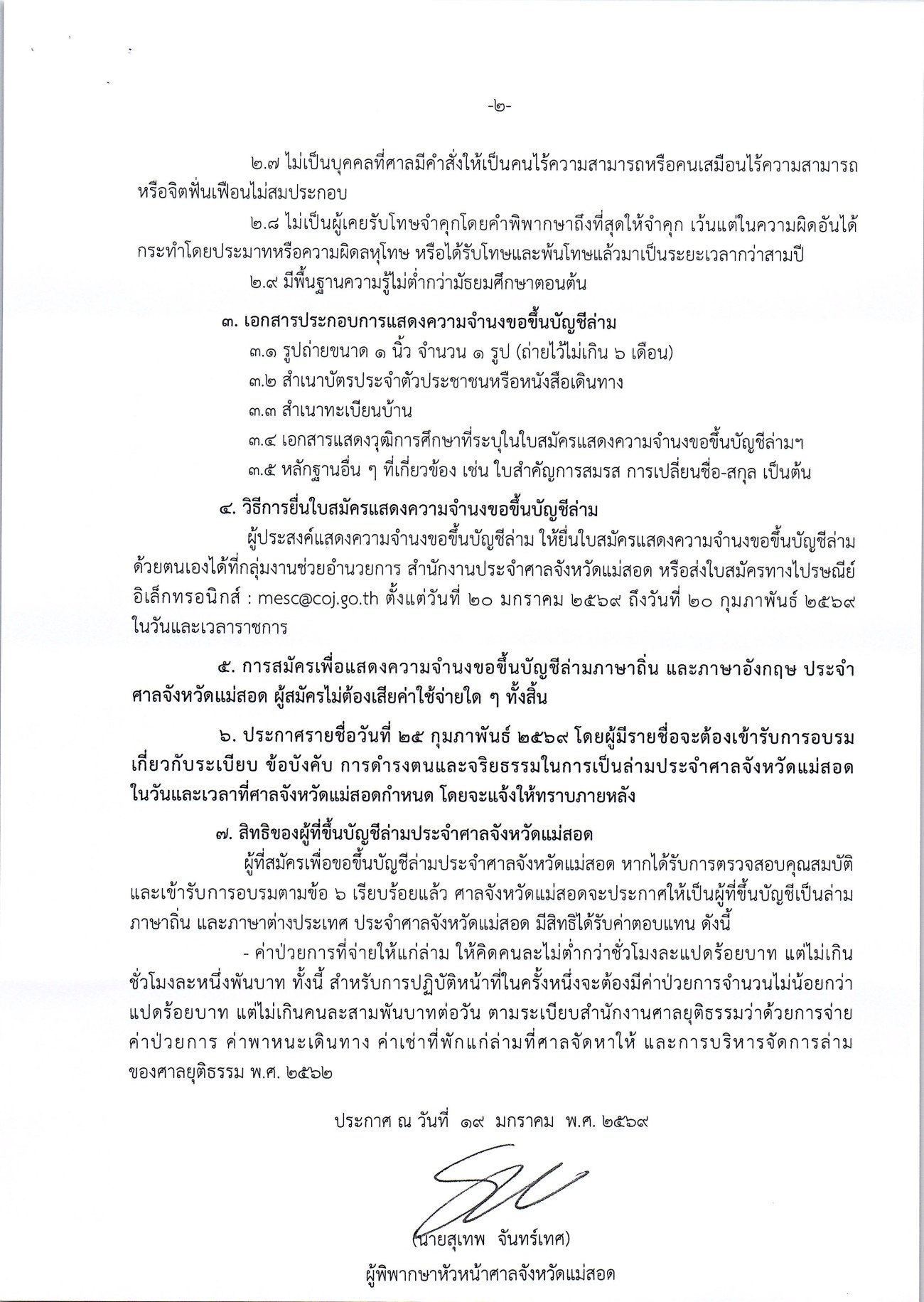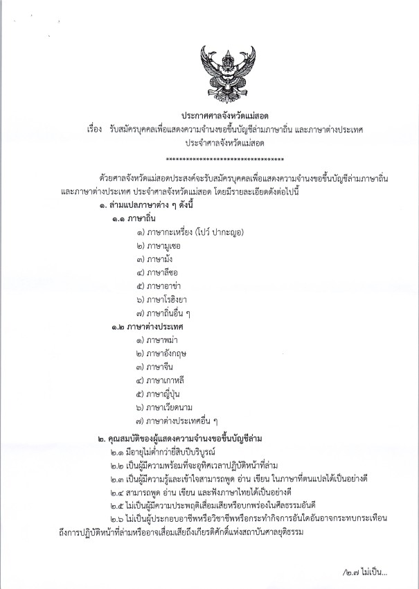 ประชาสัมพันธ์การรับสมัครบุคคลเพื่อแสดงความจำนงขอขึ้นบัญชีล่ามภาษาถิ่นและภาษาต่างประเทศประจำศาลจังหวัดแม่สอด