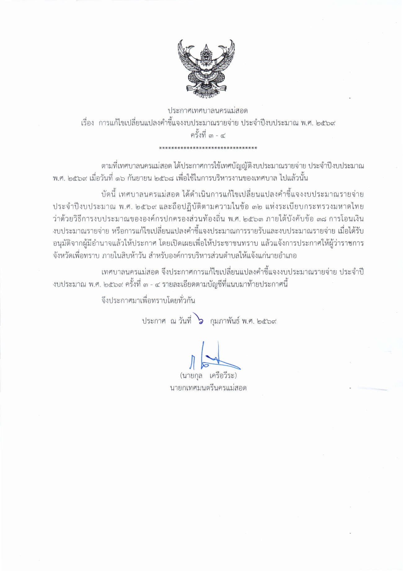 ประกาศเทศบาลนครแม่สอด เรื่อง การแก้ไขเปลี่ยนแปลงคำชี้แจงงบประมาณ พ.ศ.2569 ครั้งที่ 3-4