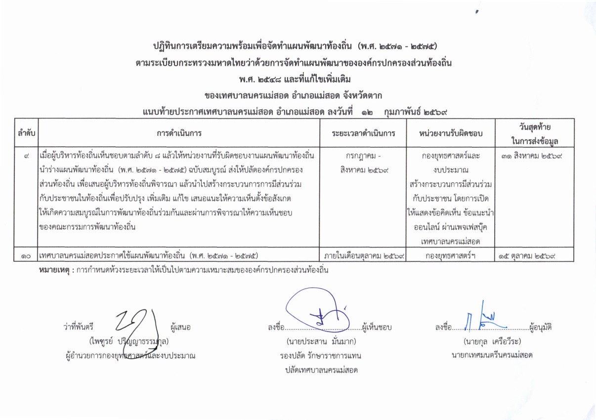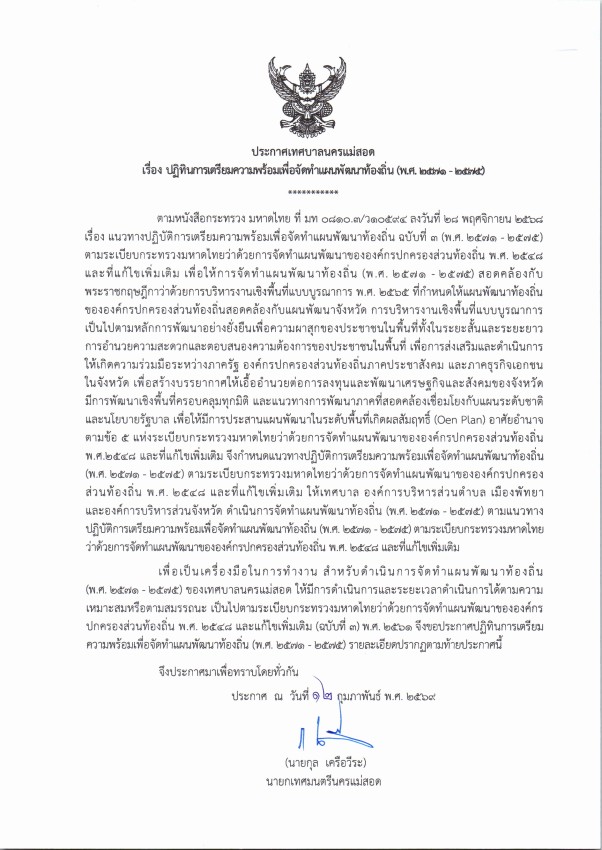 ประกาศเทศบาลนครแม่สอด เรื่อง ปฏิทินการเตรียมความพร้อมเพื่อจัดทำแผนพัฒนาท้องถิ่น (พ.ศ.2571-2575)
