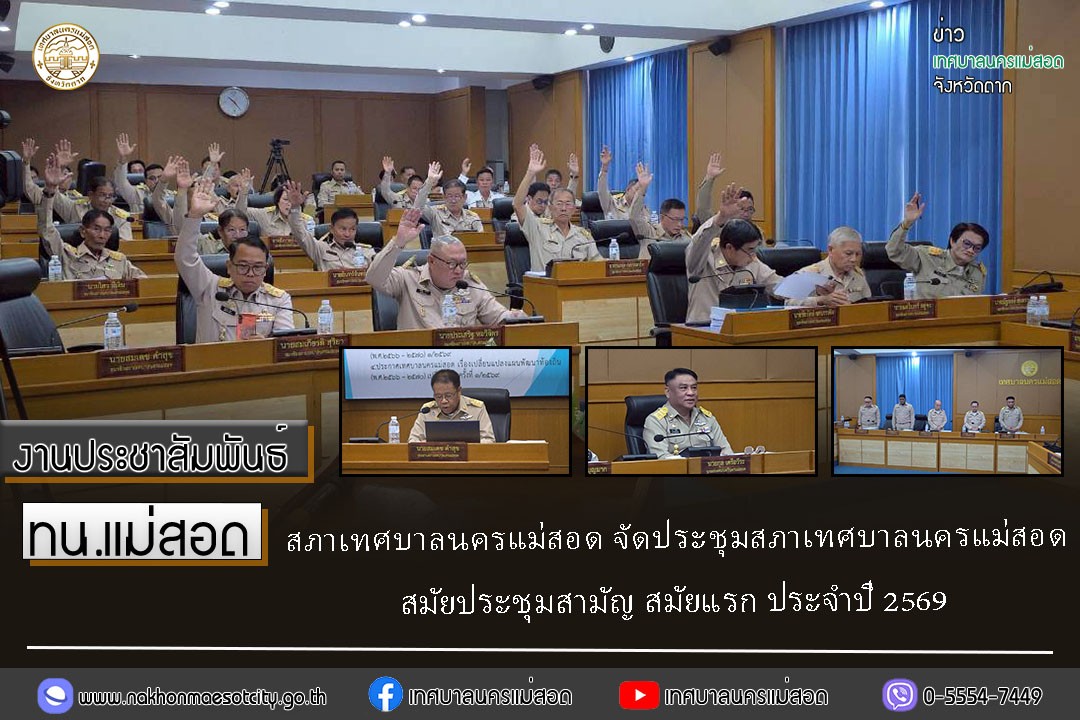 เมื่อวันจันทร์ ที่ 2 มีนาคม พ.ศ. 2569 เวลา 10.00 น. นายสมเดช คำสุข ประธานสภาเทศบาลนครแม่สอด และสมาชิกสภาเทศบาลนครแม่สอด เข้าร่วมการประชุมสภาเทศบาลนครแม่สอด สมัยประชุมสามัญ สมัยแรก ประจำปี 2569 โดยพร้อมเพรียงกัน ณ ห้องประชุมสภาเทศบาลนครแม่สอด (ชั้น 4) อาคารสำนักงานเทศบาลนครแม่สอด อำเภอแม่สอด จังหวัดตาก