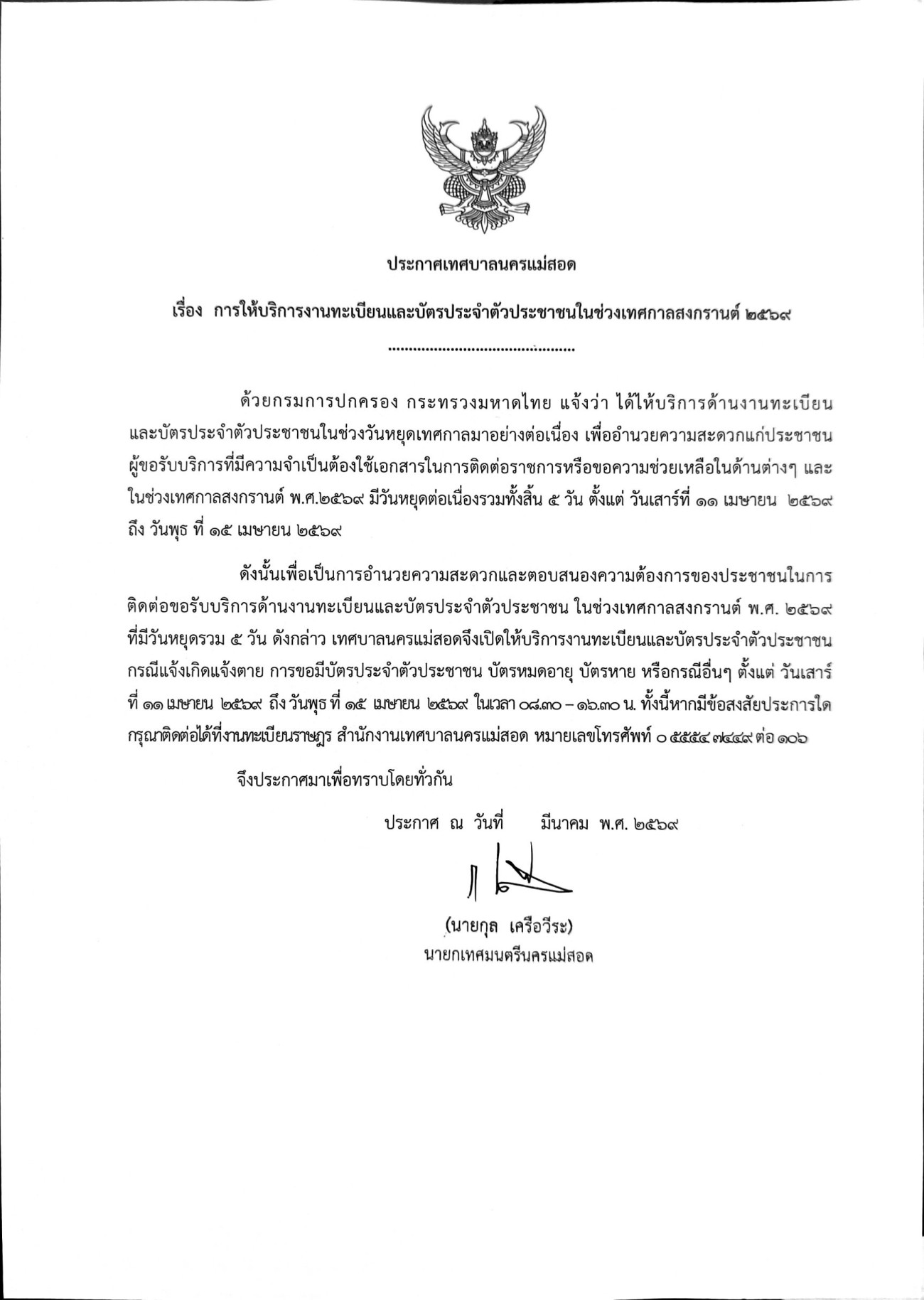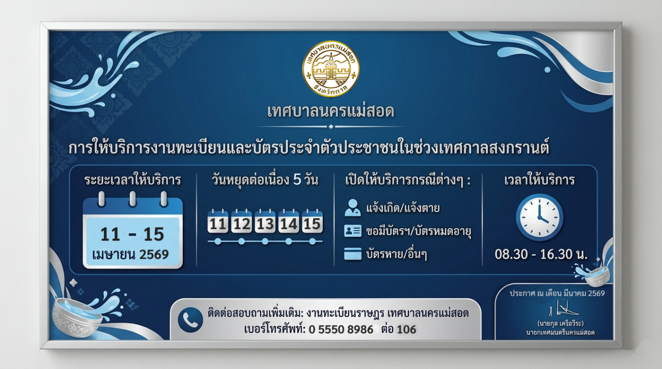 ประกาศเทศบาลนครแม่สอด เรื่องการให้บริการงานทะเบียนและบัตรประจำตัวประชาชนในช่วงเทศกาลสงกรานต์ พ.ศ.2569