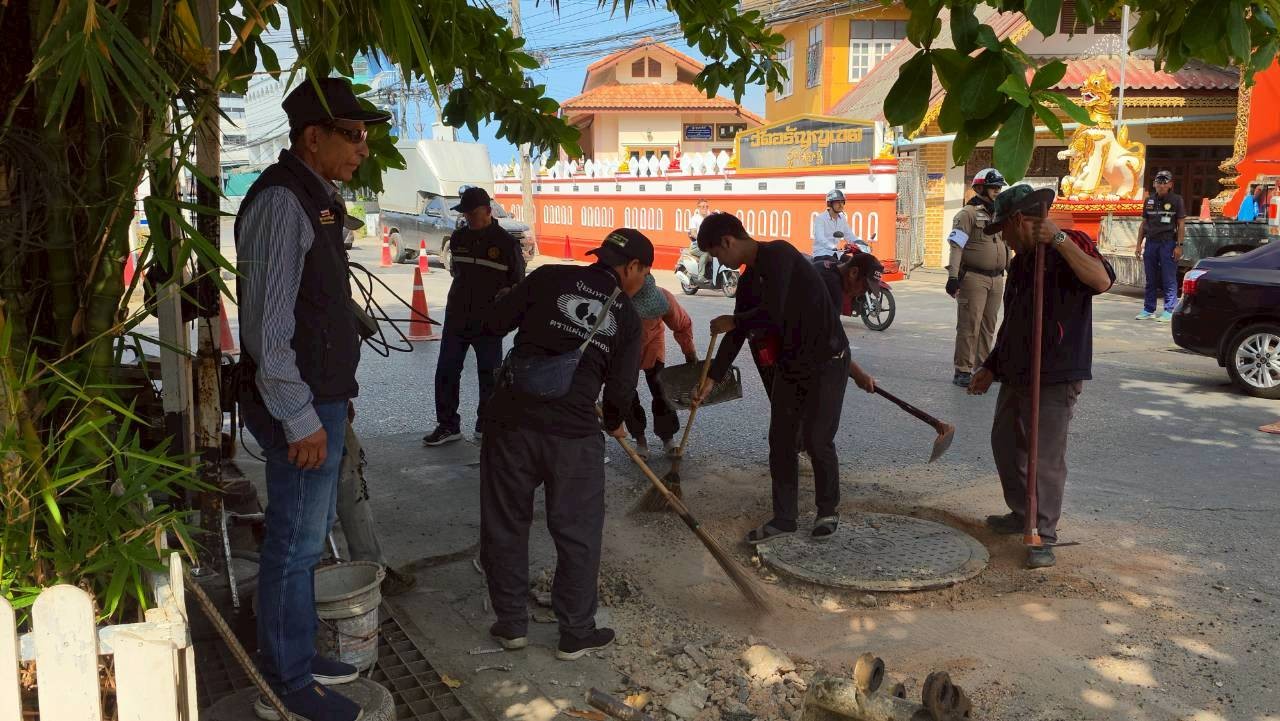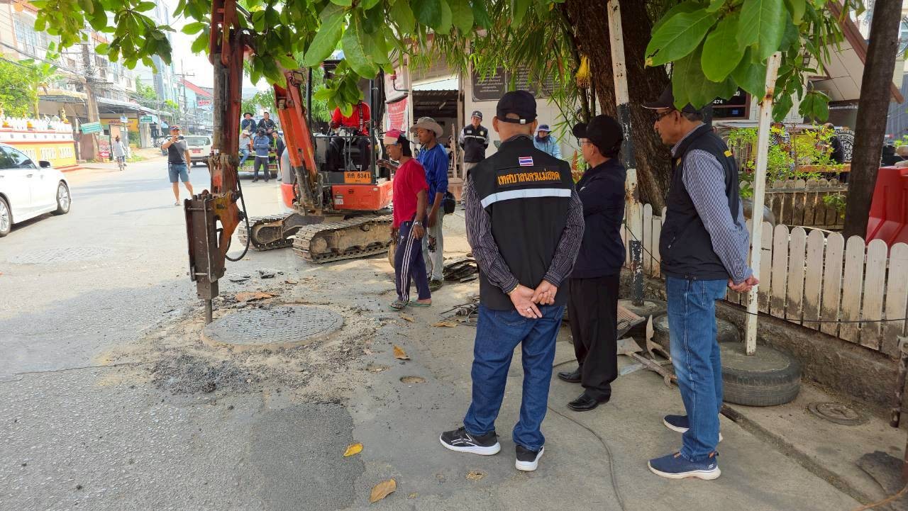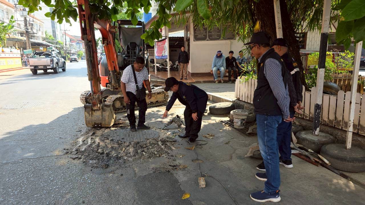 เทศบาลนครแม่สอด ลงพื้นที่ขุดปรับฝาท่อระบายน้ำหน้าวัดอรัญญเขต