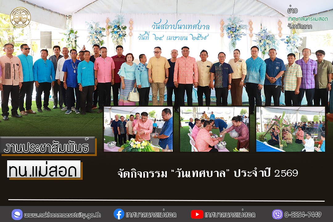 นายกุล เครือวีระ นายกเทศมนตรีนครแม่สอด พร้อมด้วย คณะผู้บริหาร สมาชิกสภาเทศบาลนครแม่สอด รองปลัดเทศบาลนครแม่สอด หัวหน้าส่วนราชการ ข้าราชการ และพนักงานสังกัดเทศบาลนครแม่สอด ร่วมกิจกรรม วันเทศบาล ประจำปี 2569 ในกิจกรรมมีพิธีสงฆ์สวดเจริญพระพุทธมนต์ และ พิธีทำบุญพระพิทักษ์ชายแดน เพื่อเป็นสิริมงคลแก่องค์กร บุคลากร และผู้ร่วมงาน โดยมี กิจกรรม รดน้ำขอพรคณะผู้บริหาร กิจกรรม 5 ส. ทำความสะอาดสถานที่ปฏิบัติงานของแต่ละกอง การจัดกิจกรรมวันเทศบาลครั้งนี้ เพื่อรำลึกถึงความเป็นมา ในการจัดตั้งเทศบาล ซึ่งเป็นหน่วยงานราชการส่วนท้องถิ่นมีหน้าที่บำบัดทุกข์บำรุงสุข แก่ประชาชนในท้องถิ่น ตลอดจนเป็นการเปิดโอกาสให้พนักงานเทศบาลได้มีส่วนร่วมในการจัดกิจกรรมฯ