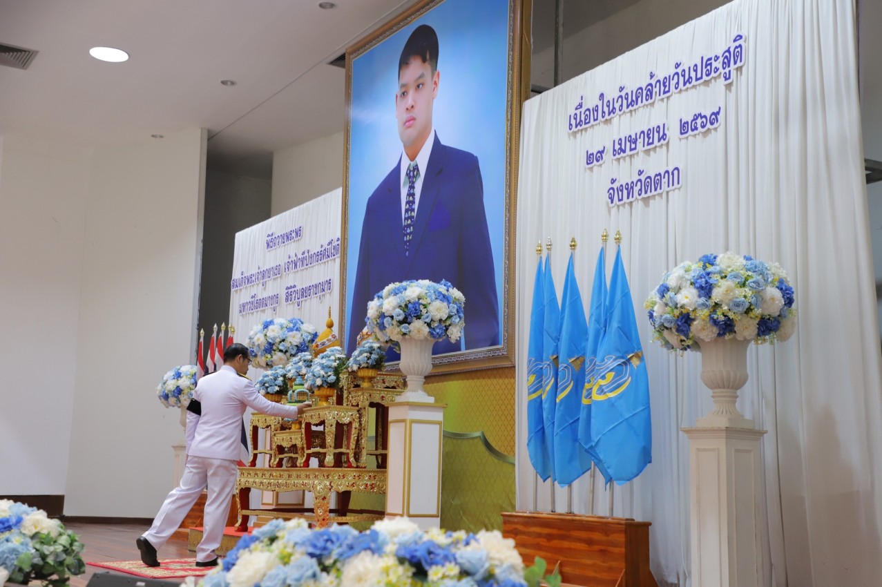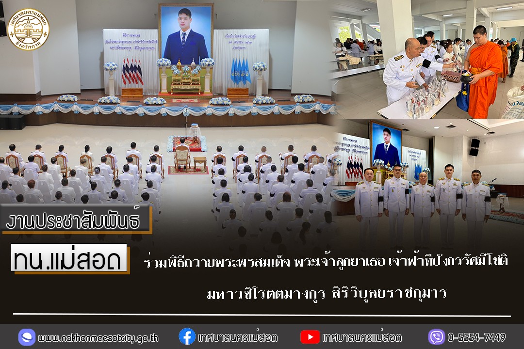 เมื่อวันพุธ ที่ 29 เมษายน 2569 เวลา 07.30 น. ณ หอประชุมจังหวัดตาก ศาลากลางจังหวัดตาก อำเภอเมือง จังหวัดตาก นายกุล เครือวีระ นายกเทศมนตรีนครแม่สอด มอบหมายให้ นายธีรรัตน์ ใจโปร่ง รองนายกเทศมนตรีนครแม่สอด พร้อมด้วย นายขวัญชัย พะยอม หัวหน้าฝ่ายวิเทศสัมพันธ์ กองยุทธศาสตร์และงบประมาณ และเจ้าหน้าที่กองยุทธศาสตร์และงบประมาณ ร่วมพิธีถวายพระพรสมเด็จพระเจ้าลูกยาเธอ เจ้าฟ้าทีปังกรรัศมีโชติ มหาวชิโรตตมางกูร สิริวิบูลยราชกุมาร โดยมี นายชูศักดิ์ รู้ยิ่ง ผู้ว่าราชการจังหวัดตาก เป็นประธานในพิธี ฯ เนื่องในโอกาสวันคล้ายวันประสูติ เพื่อแสดงความจงรักภักดีและน้อมรำลึกในพระกรุณาธิคุณ