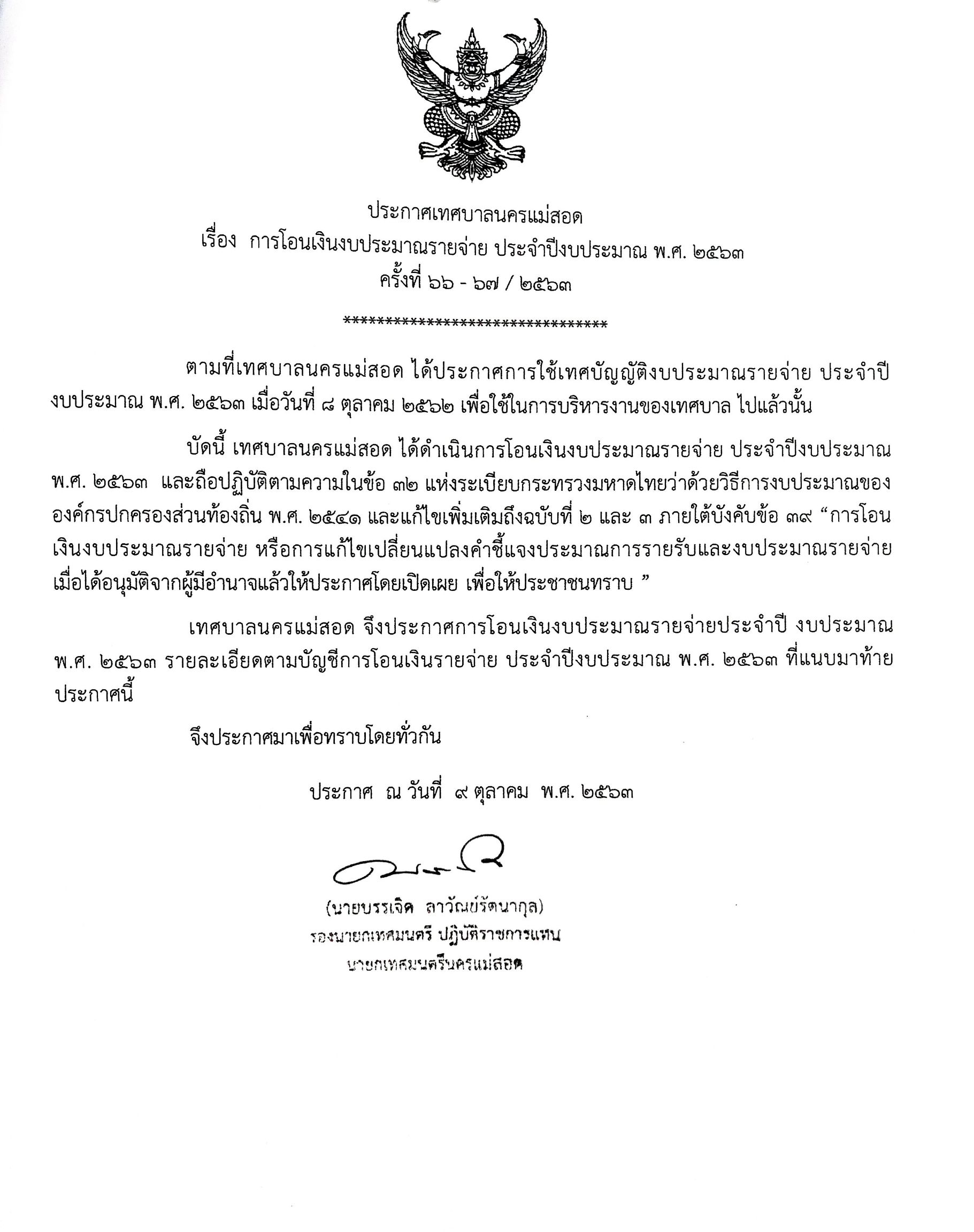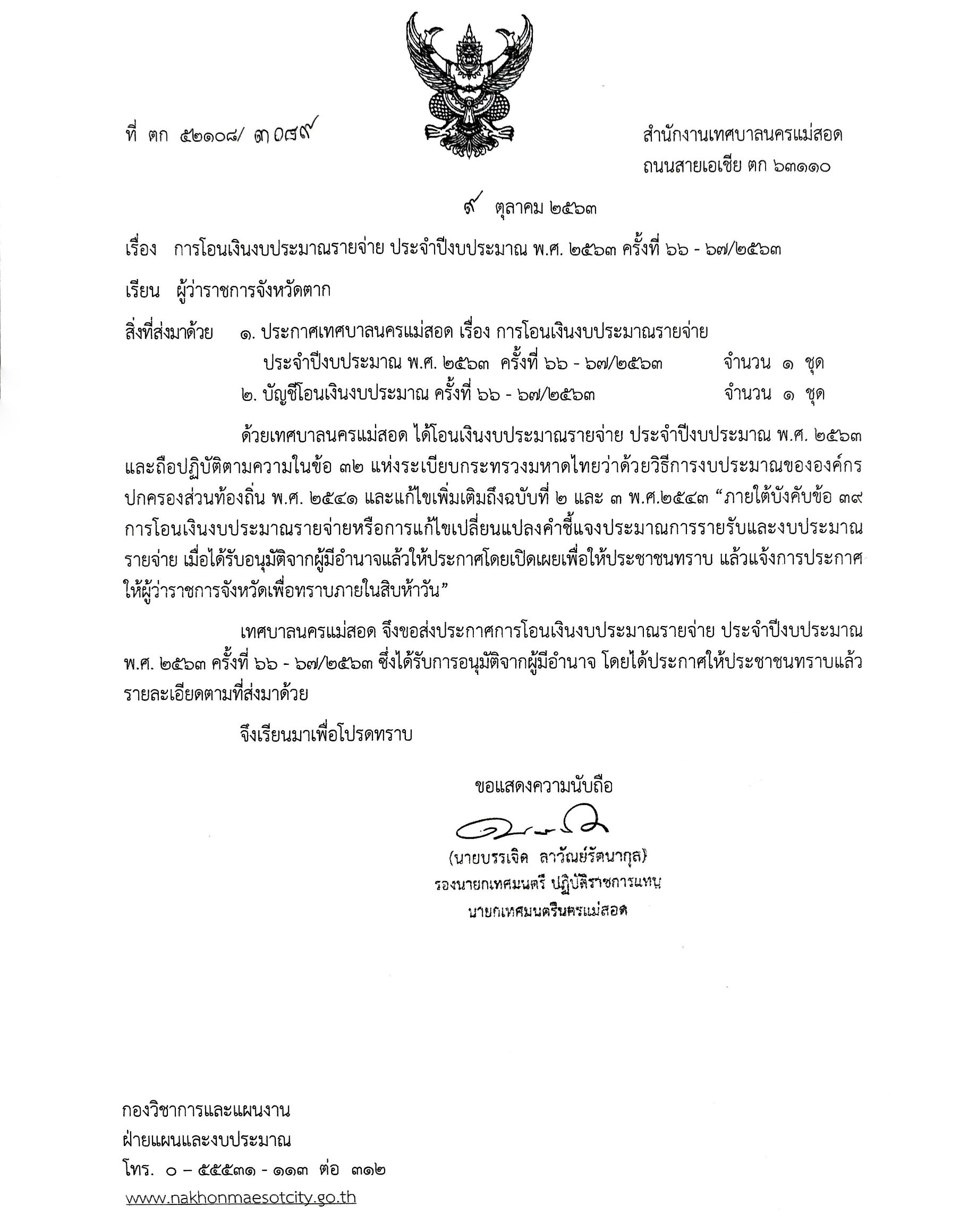 คู่มือการปฏิบัติงานการโอนเงินและเปลี่ยนแปลงคำชี้แจงงบประมาณประจำปี เทศบาลนครแม่สอด