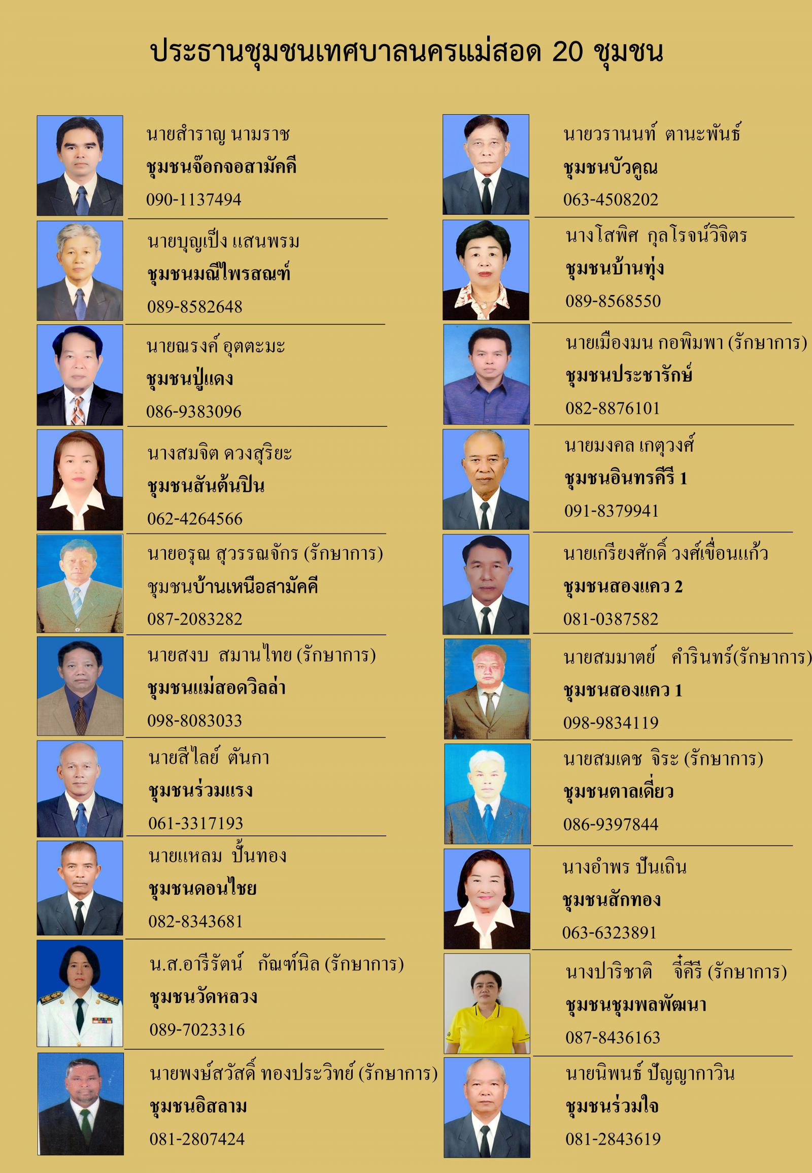 รายชื่อพร้อมเบอร์โทรศัพท์ประธานชุมชนเทศบาลนครแม่สอด 20 ชุมชน