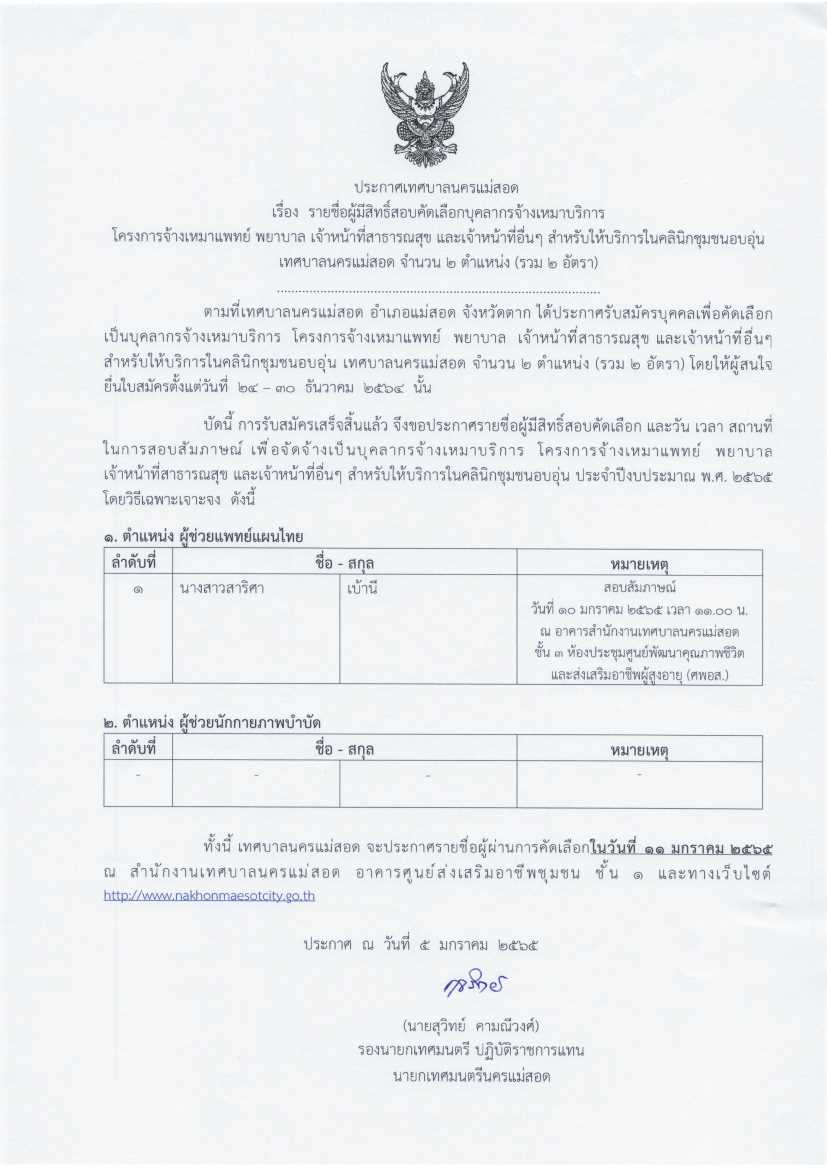 ประกาศเทศบาลนครแม่สอด เรื่อง รายชื่อผู้มีสิทธิ์สอบคัดเลือกเป็นบุคลากรจ้างเหมาบริการ โครงการจ้างเหมาแพทย์ พยาบาล เจ้าหน้าที่สาธารณสุข และเจ้าหน้าที่อื่นๆ สำหรับให้บริการในคลินิกชุมชนอบอุ่น เทศบาลนครแม่สอด จำนวน 2 ตำแหน่ง (รวม 2 อัตรา)