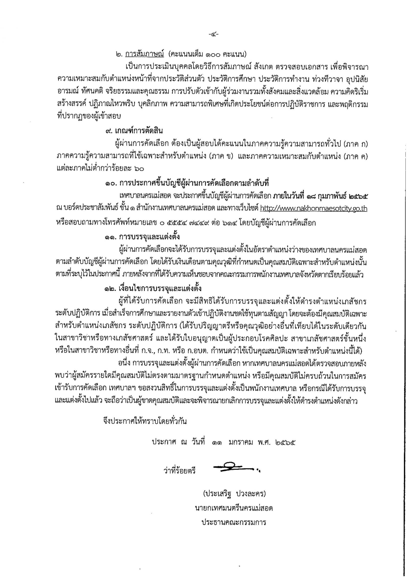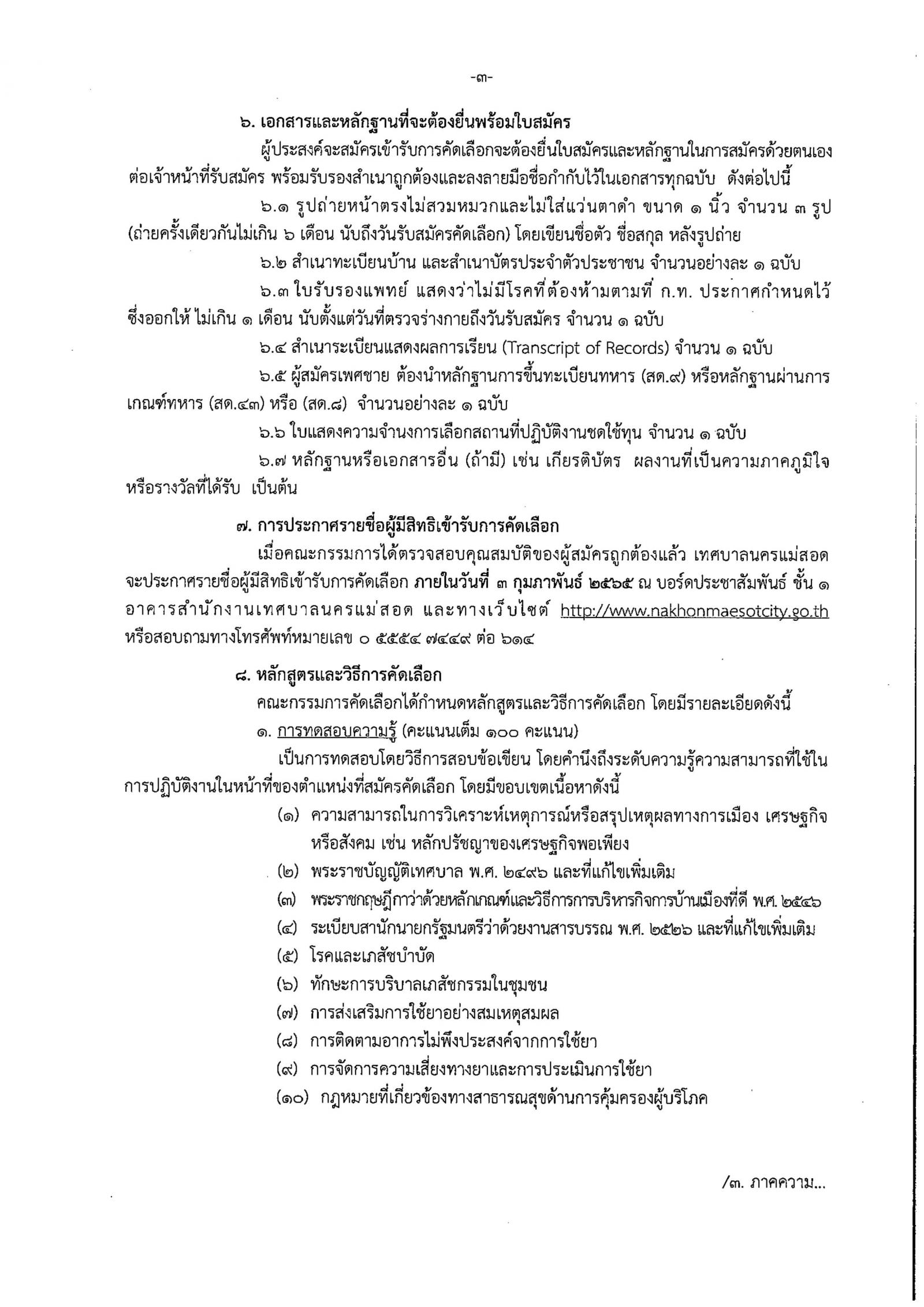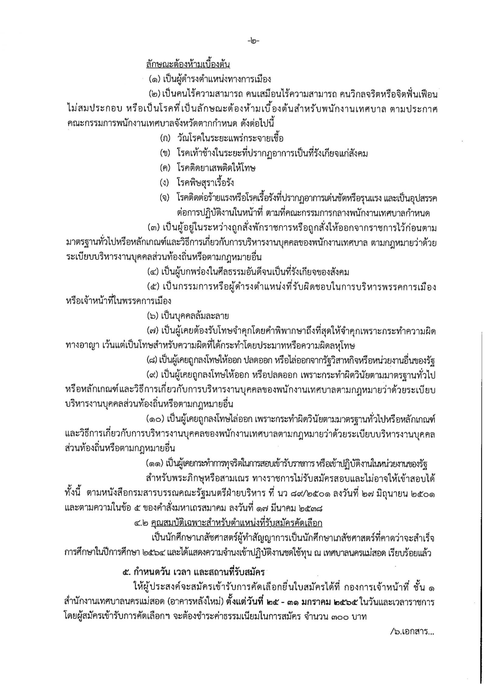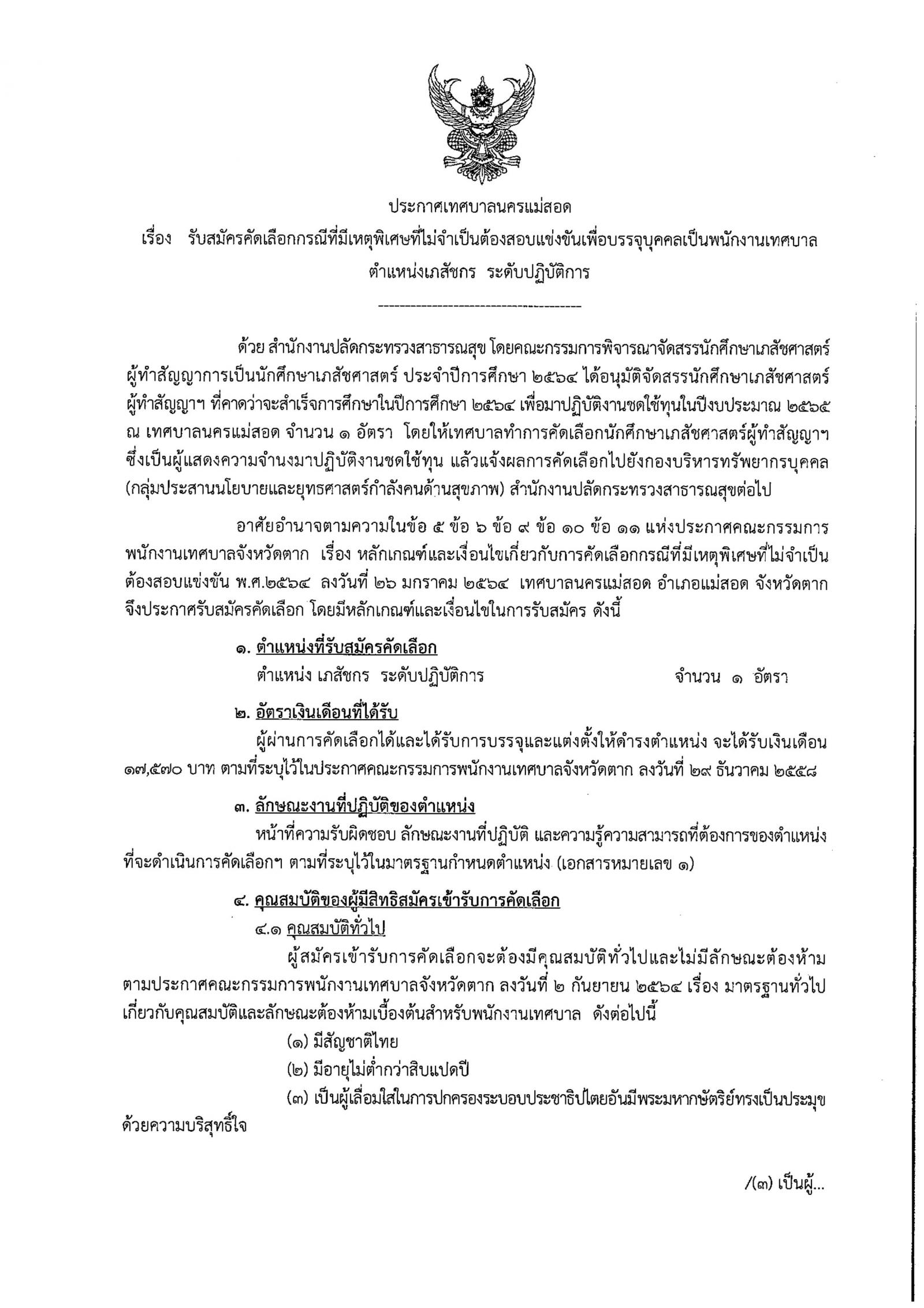 ประกาศเทศบาลนครแม่สอด เรื่อง รับสมครคัดเลือกกรณีที่มีเหตุพิเศษที่ไม่จำเป็นต้องสอบแข่งขันเพื่อบรรจุบุคคลเป็นพนักงานเทศบาลตำแหน่งเภสัชกร ระดับปฏิบัติการ