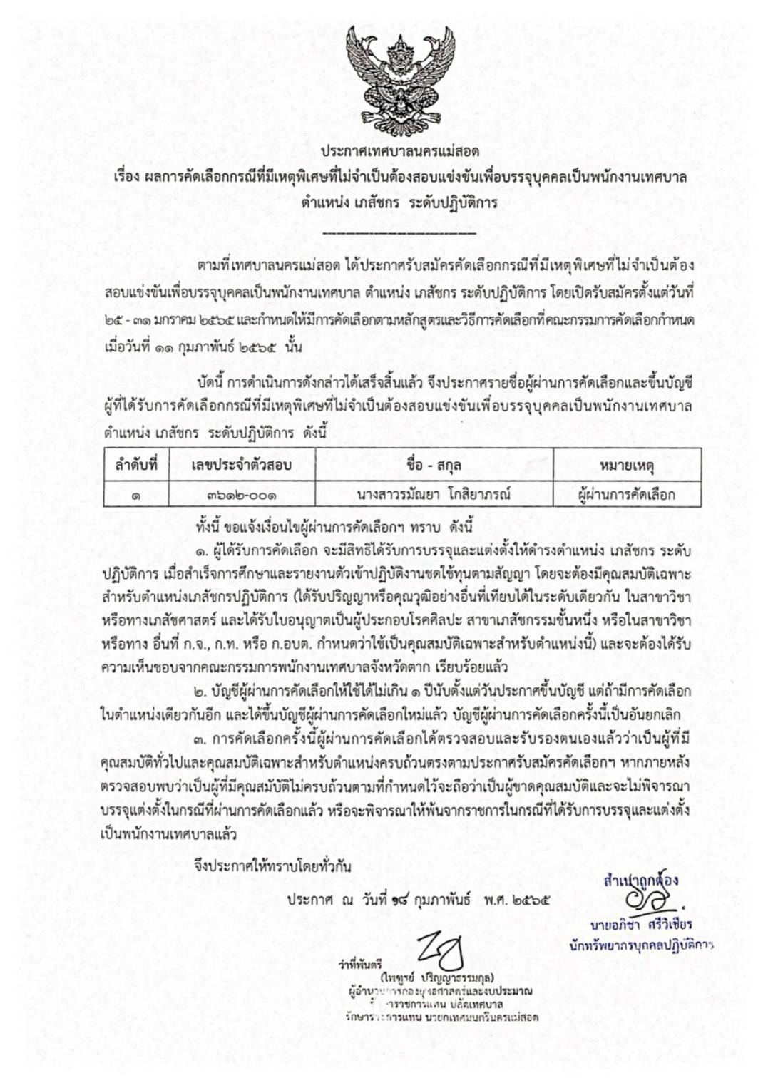 ประกาศเทศบาลนครแม่สอด เรื่อง ผลการคัดเลือกกรณีที่มีเหตุพิเศษที่ไม่จำเป็นต้องสอบแข่งขันเพื่อบรรจุบถคคลเป็นพนักงานเทศบาล ตำแหน่ง เภสัชกร ระดับปฏิบัติการ.pdf