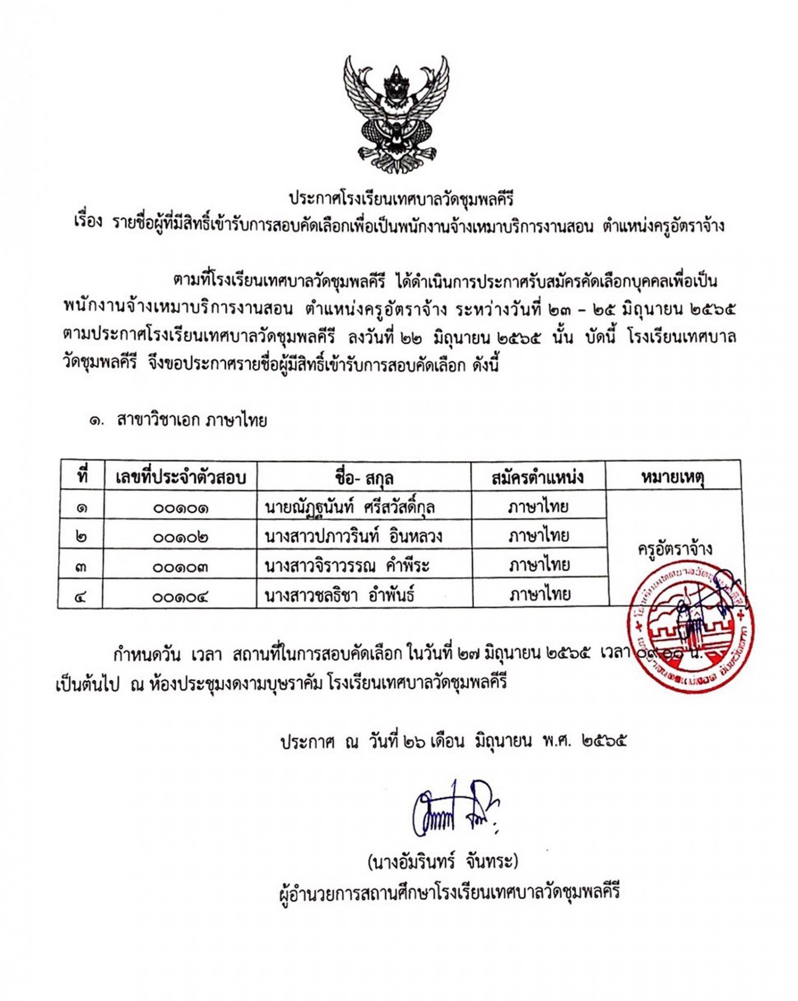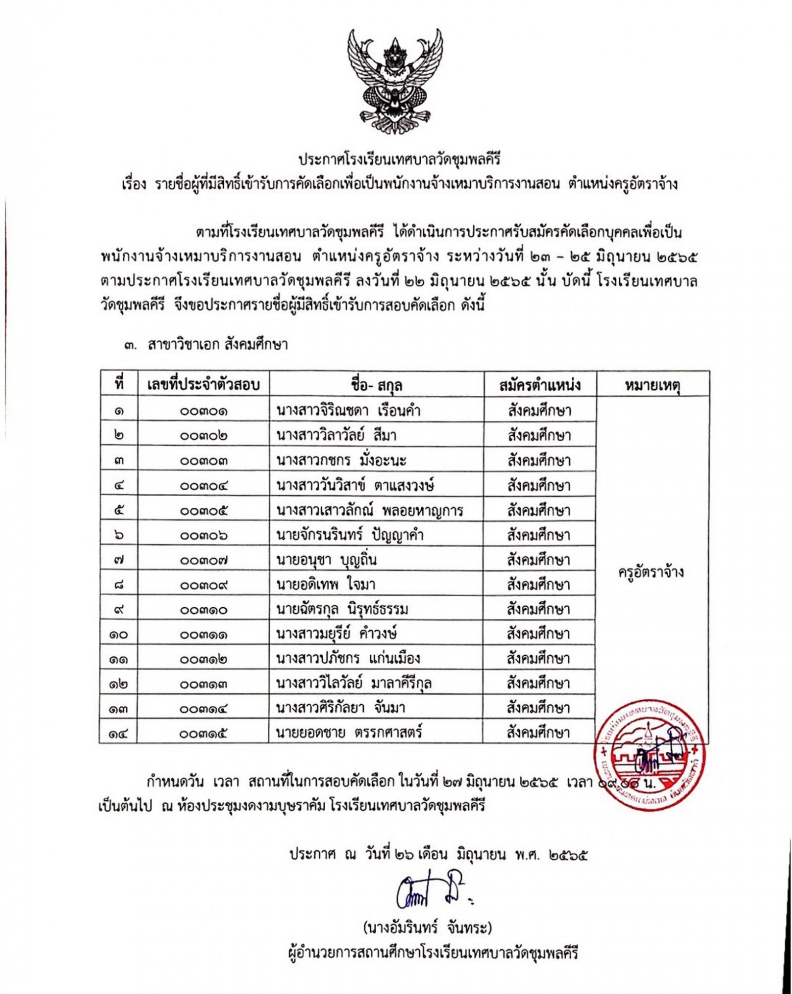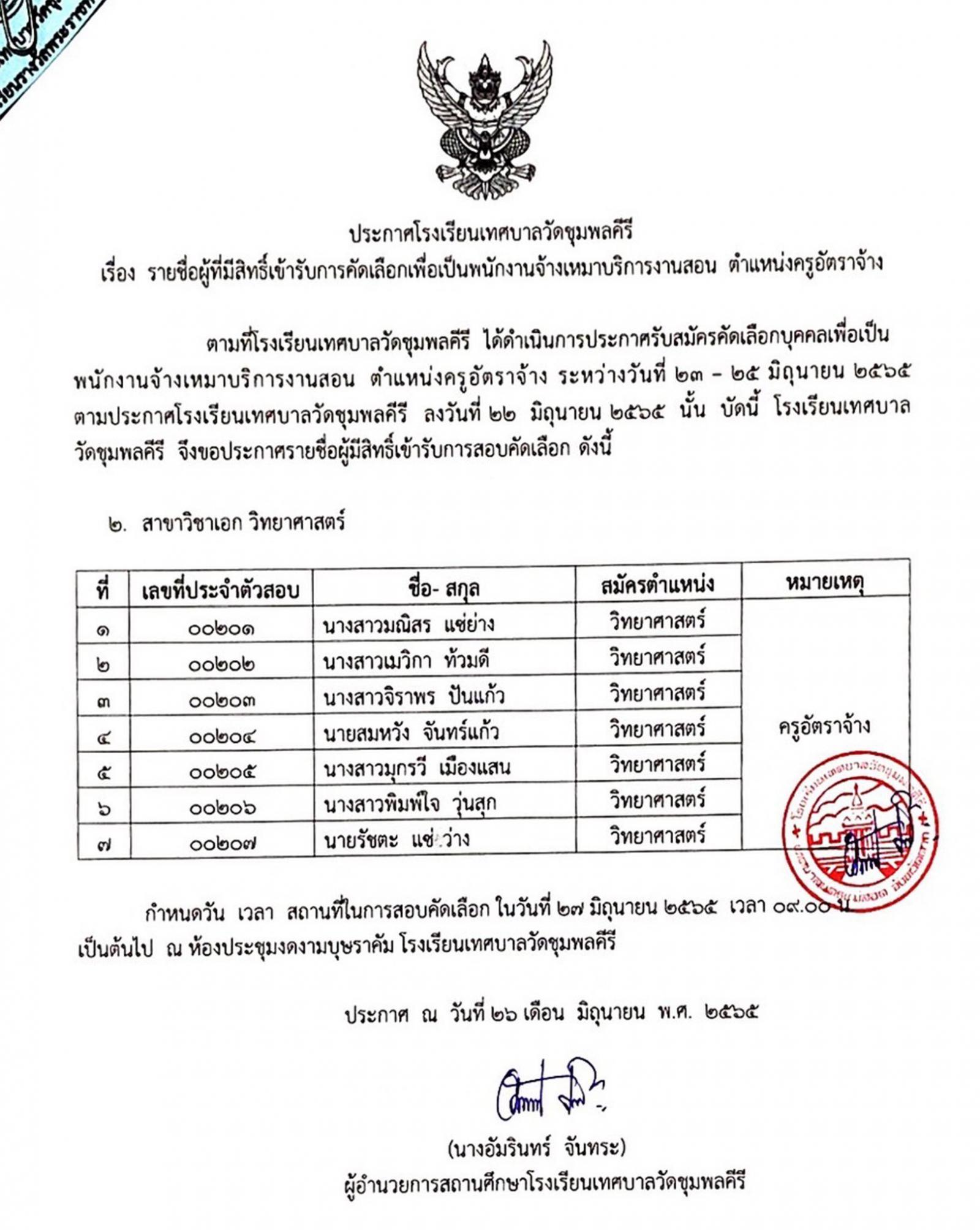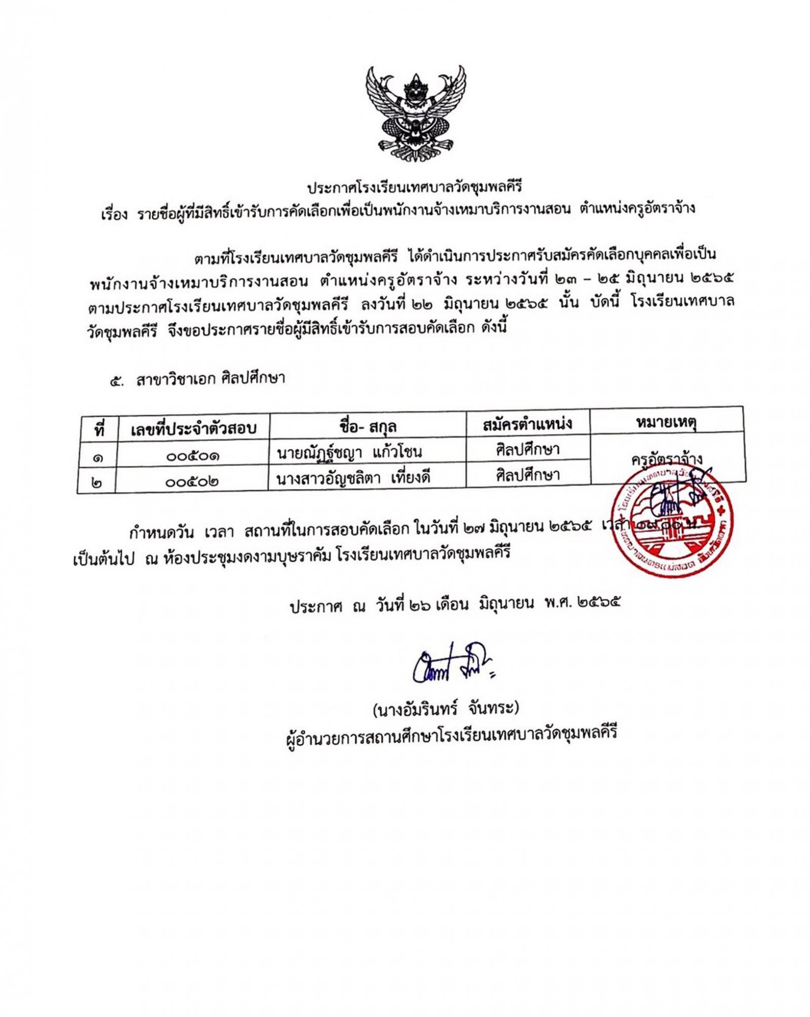 ประกาศโรงเรียนเทศบาลวัดชุมพลคีรี เรื่อง รายชื่อผู้มีสิทธิ์เข้ารับการคัดเลือกเพื่อเป็นพนักงานจ้างเหมาบริการงานสอน ตำแหน่งครูอัตราจ้าง