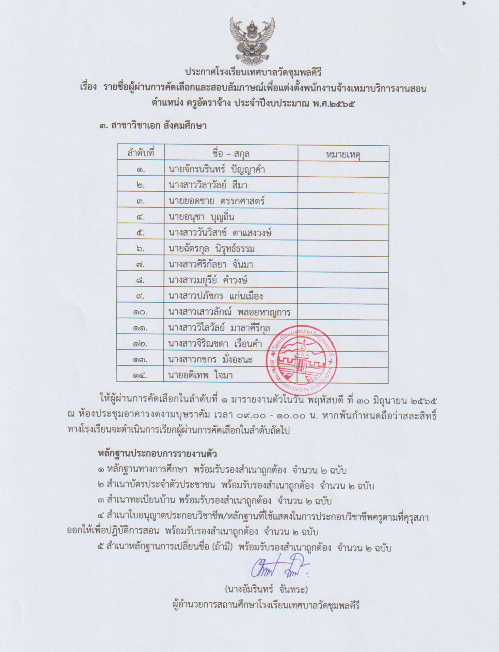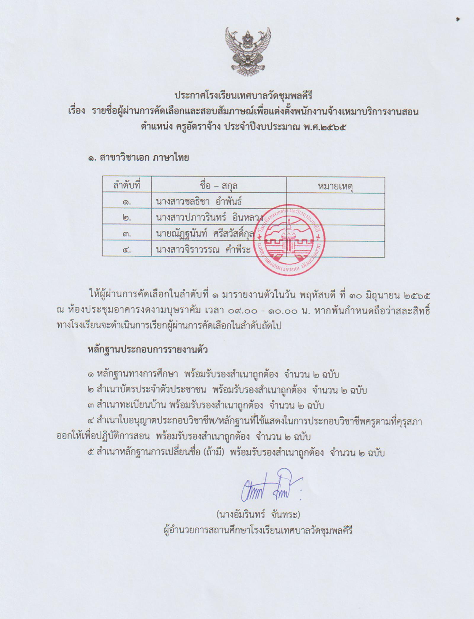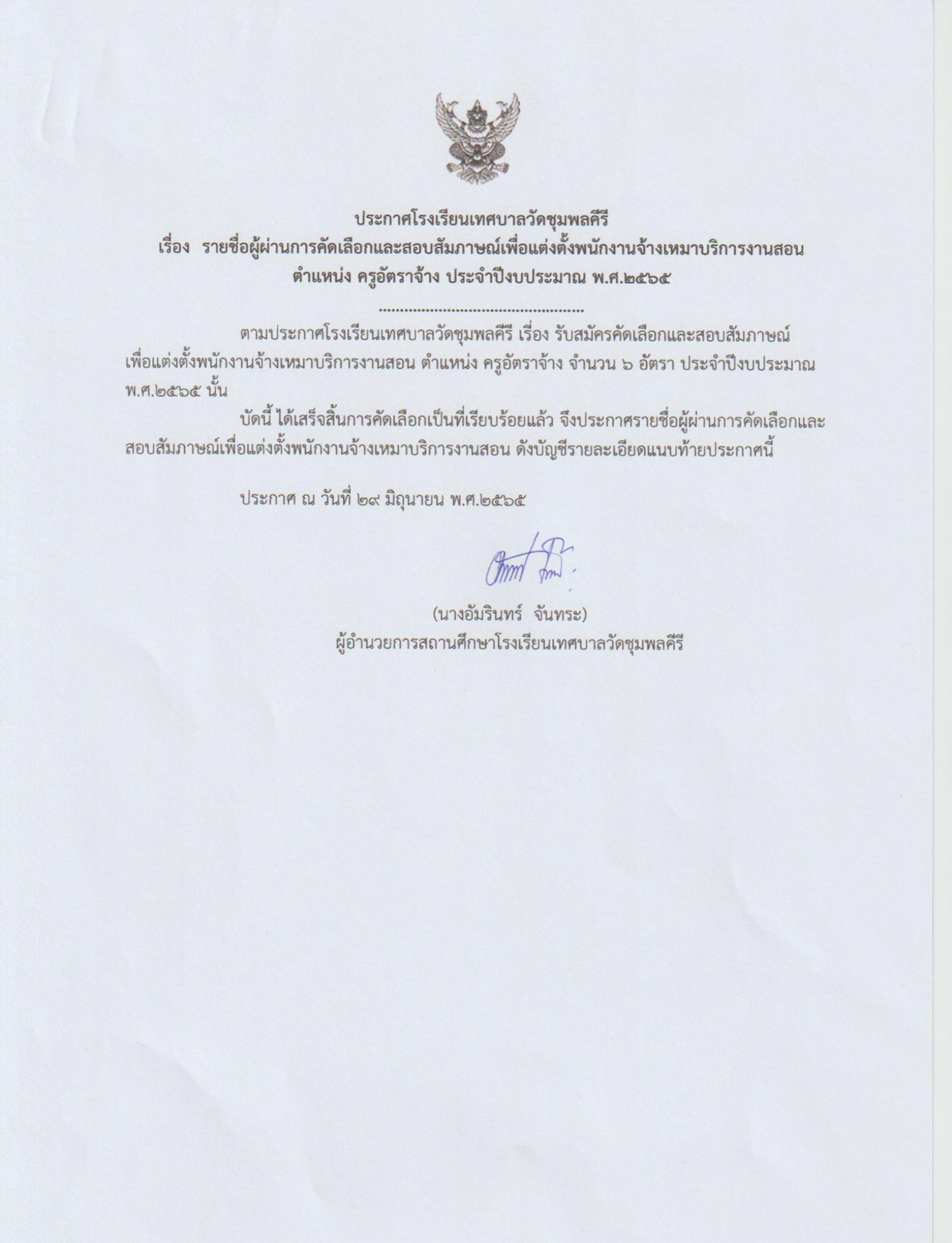 ประกาศโรงเรียนเทศบาลวัดชุมพลคีรี เรื่อง รายชื่อผู้ผ่านการคัดเลือกและสอบสัมภาษณ์เพื่อแต่งตั้งพนักงานจ้างเหมาบริการงานสอน ตำแหน่ง ครูอัตราจ้าง ประจำปีงบประมาณ พ.ศ.2565