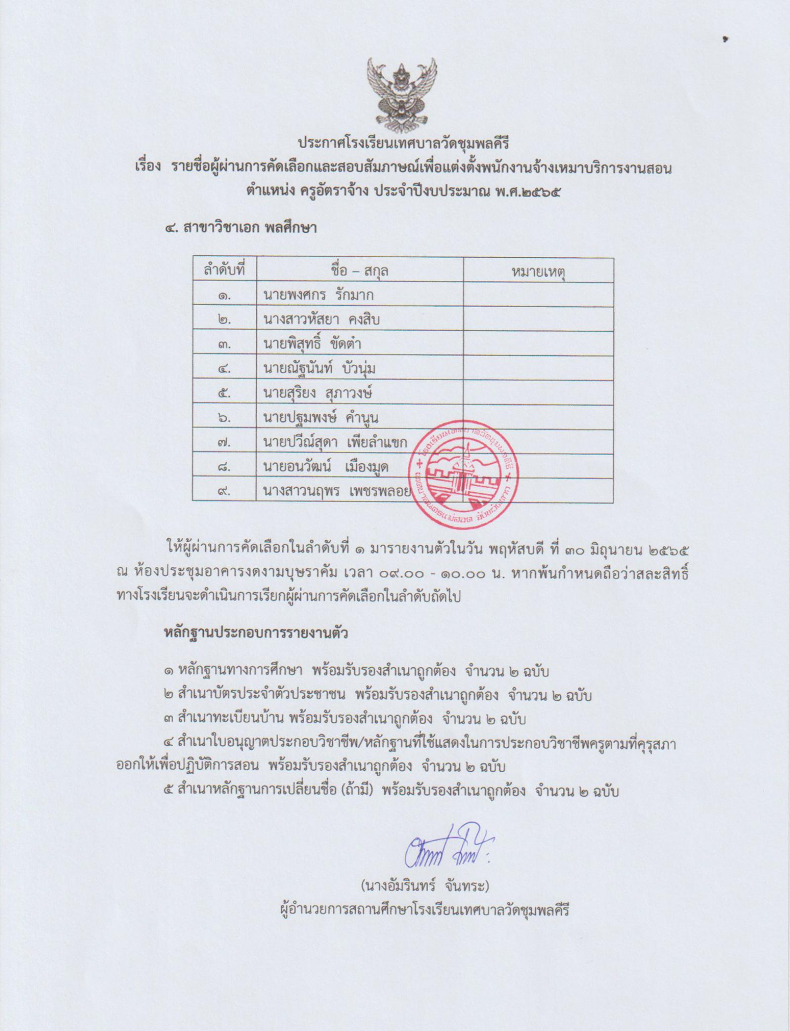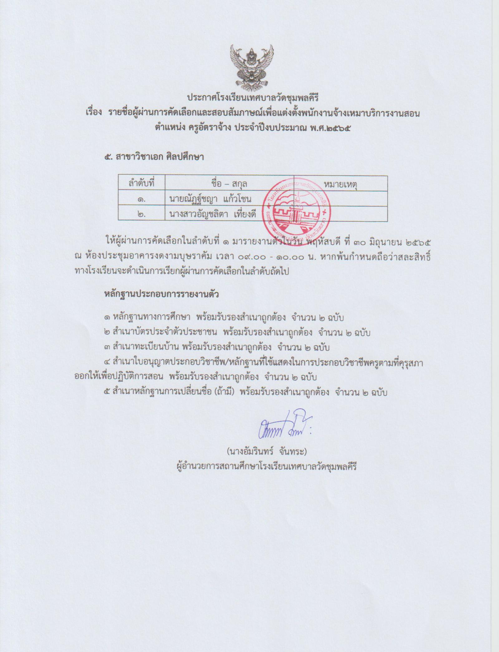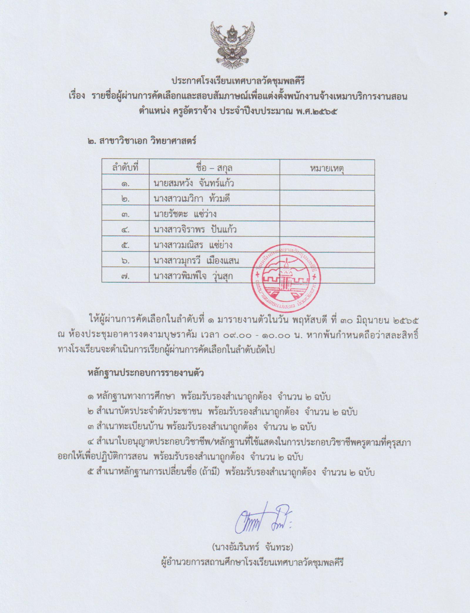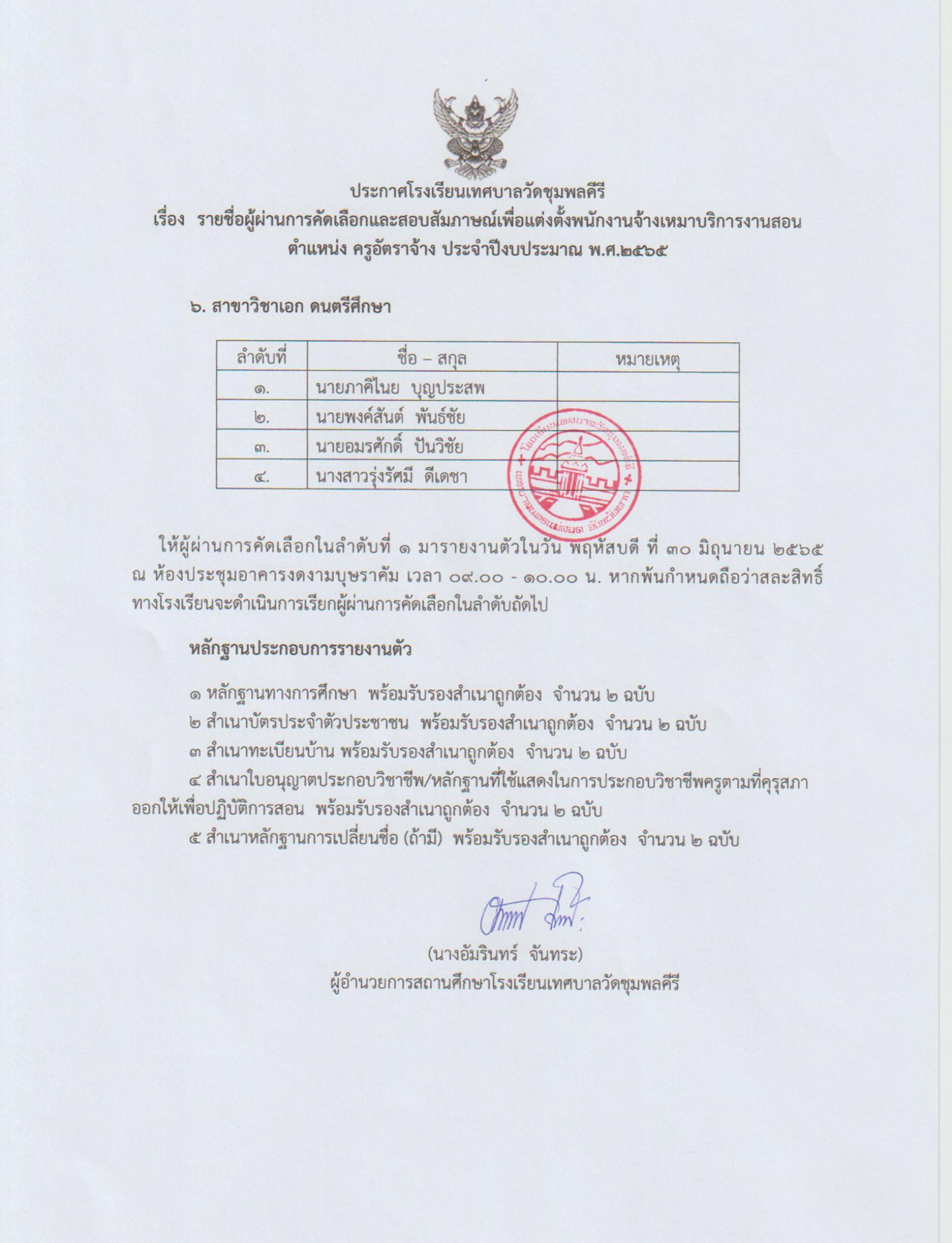 ประกาศโรงเรียนเทศบาลวัดชุมพลคีรี เรื่อง รายชื่อผู้ผ่านการคัดเลือกและสอบสัมภาษณ์เพื่อแต่งตั้งพนักงานจ้างเหมาบริการงานสอน ตำแหน่ง ครูอัตราจ้าง ประจำปีงบประมาณ พ.ศ.2565