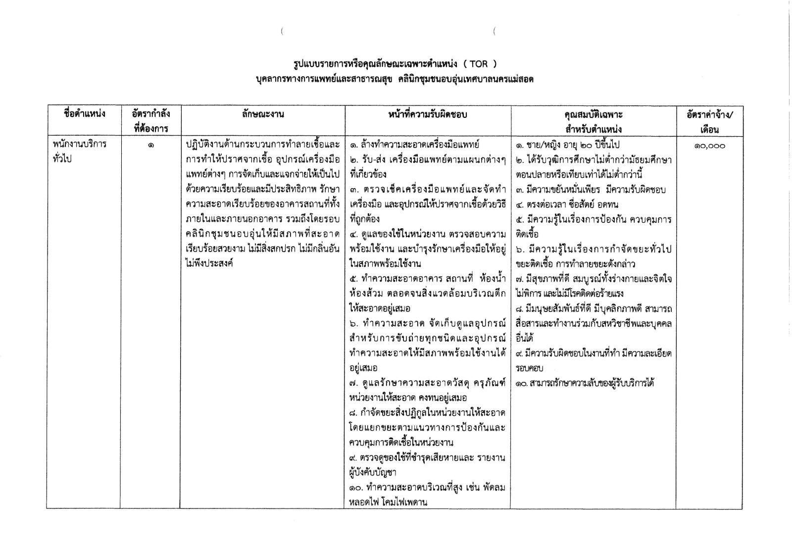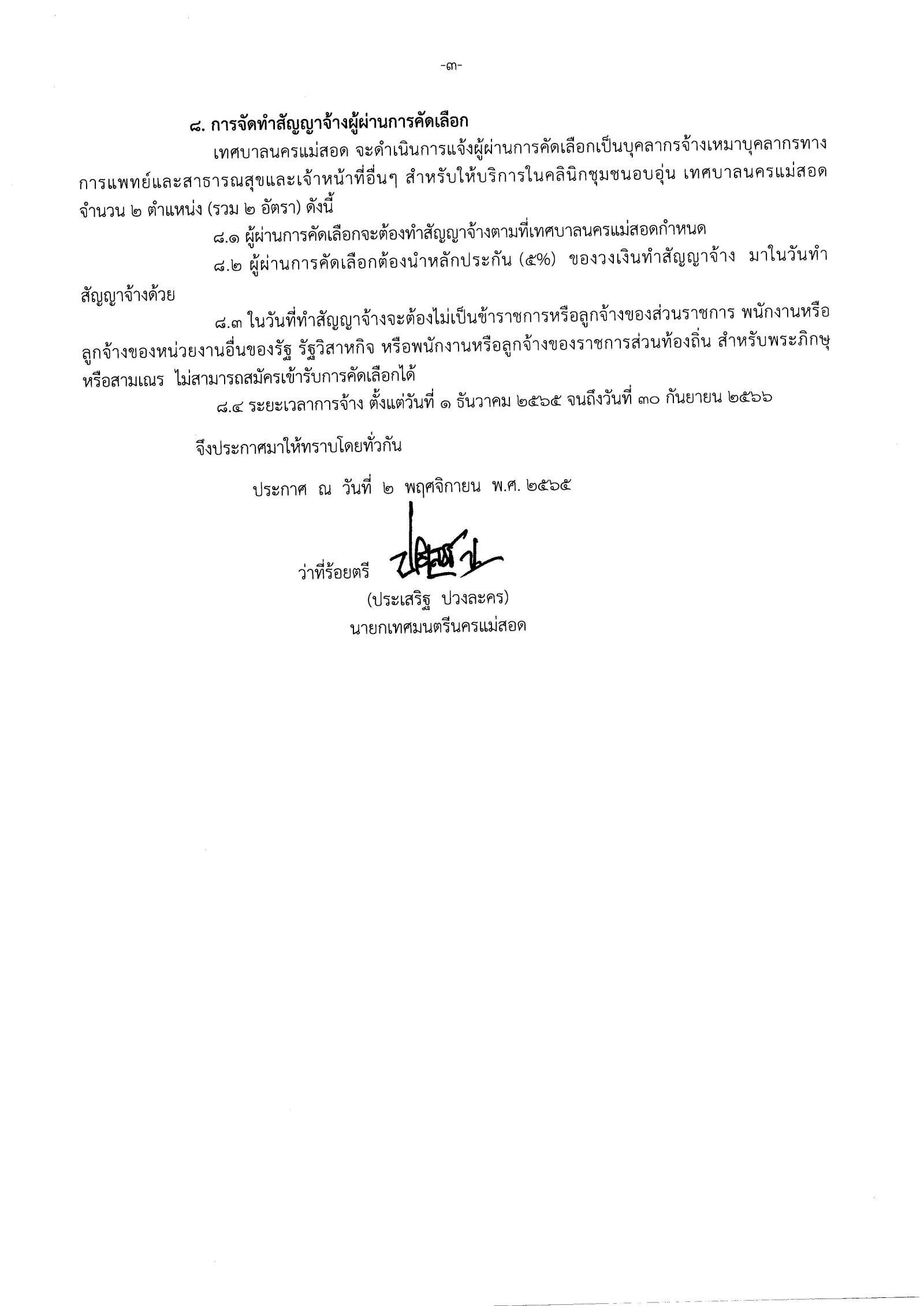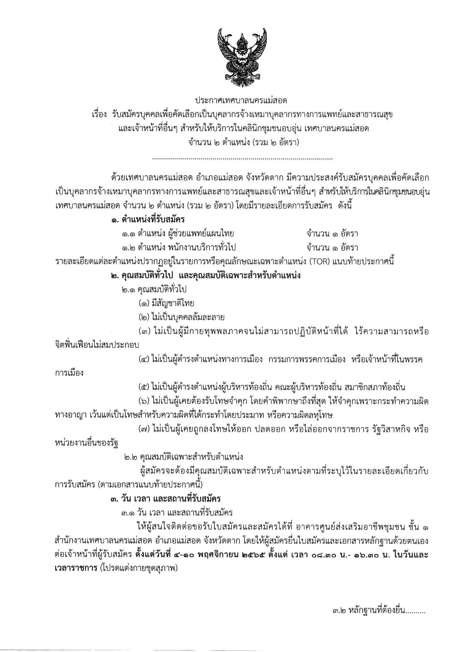 รับสมัครบุคคลเพื่อคัดเลือกเป็นบุคลากรจ้างเหมาบุคลากรทางการแพทย์และสาธารณสุขและเจ้าหน้าที่อื่นๆ สำหรับให้บริการในคลินิกชุมชนอบอุ่น เทศบาลนครแม่สอด จำนวน 2 ตำแหน่ง (รวม 2 อัตรา)