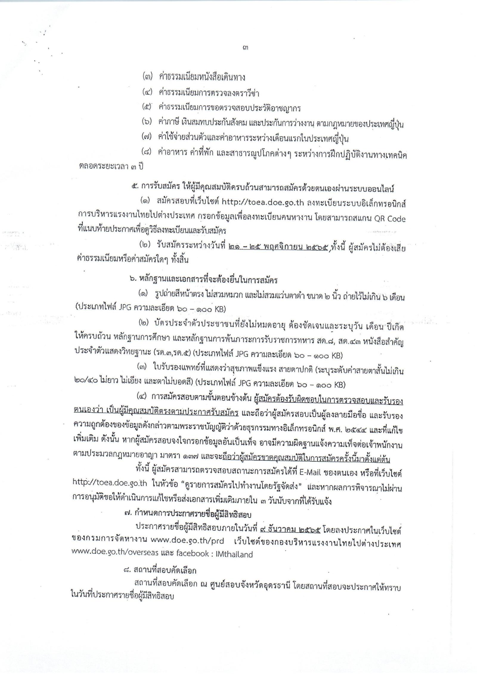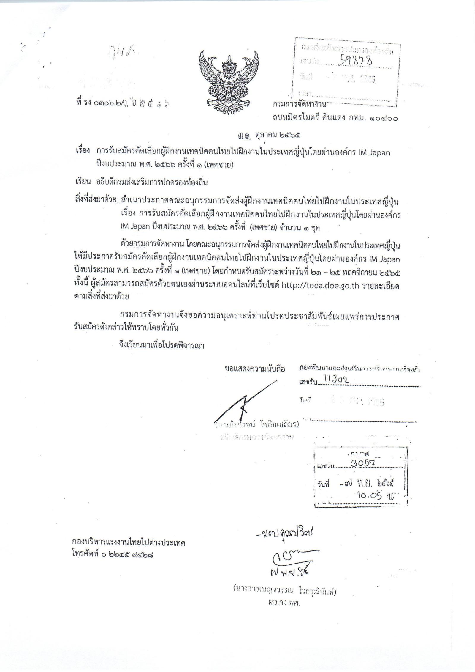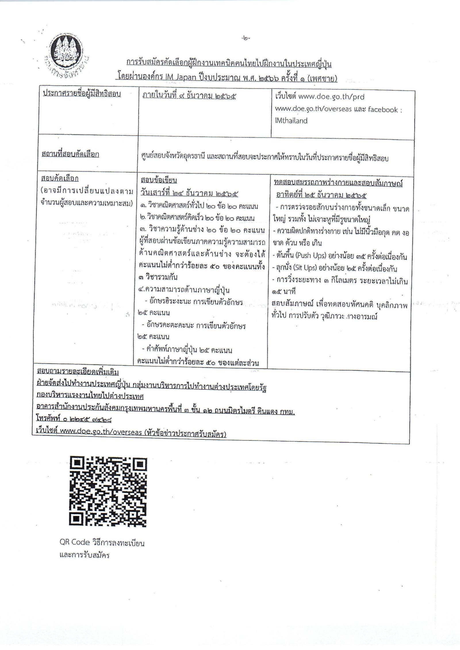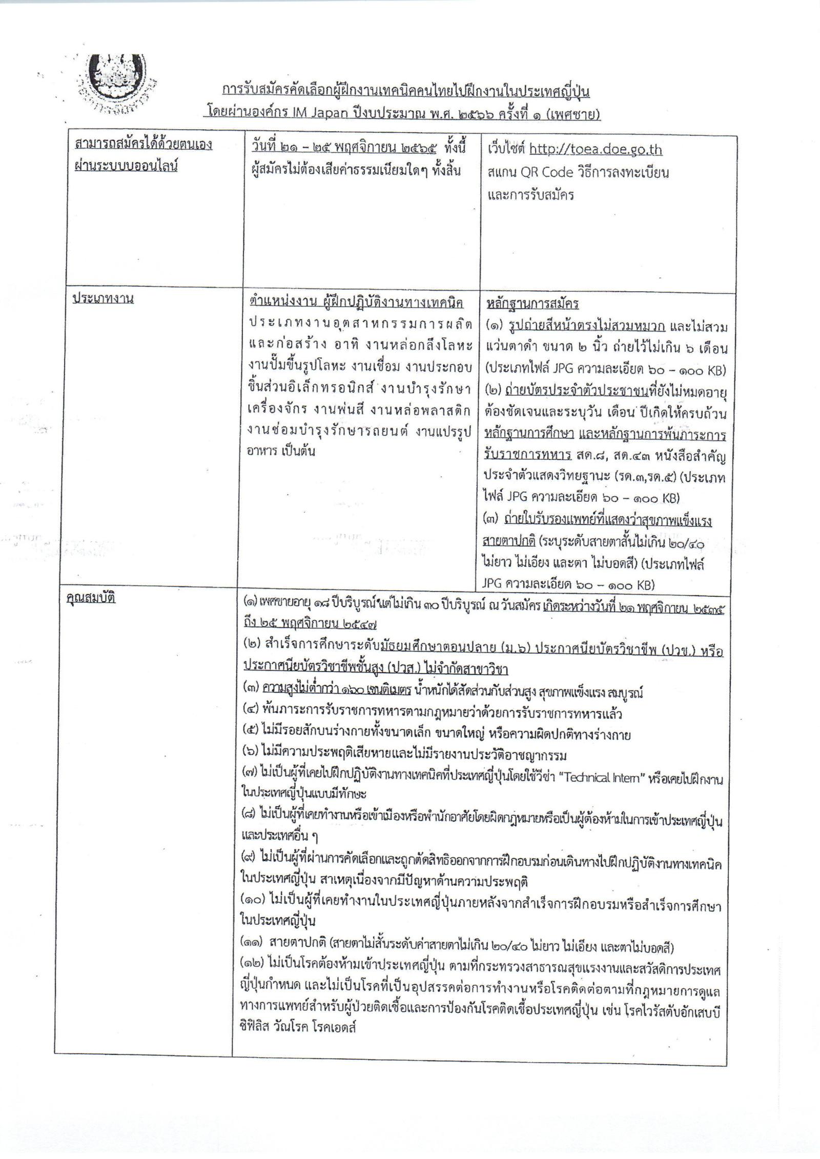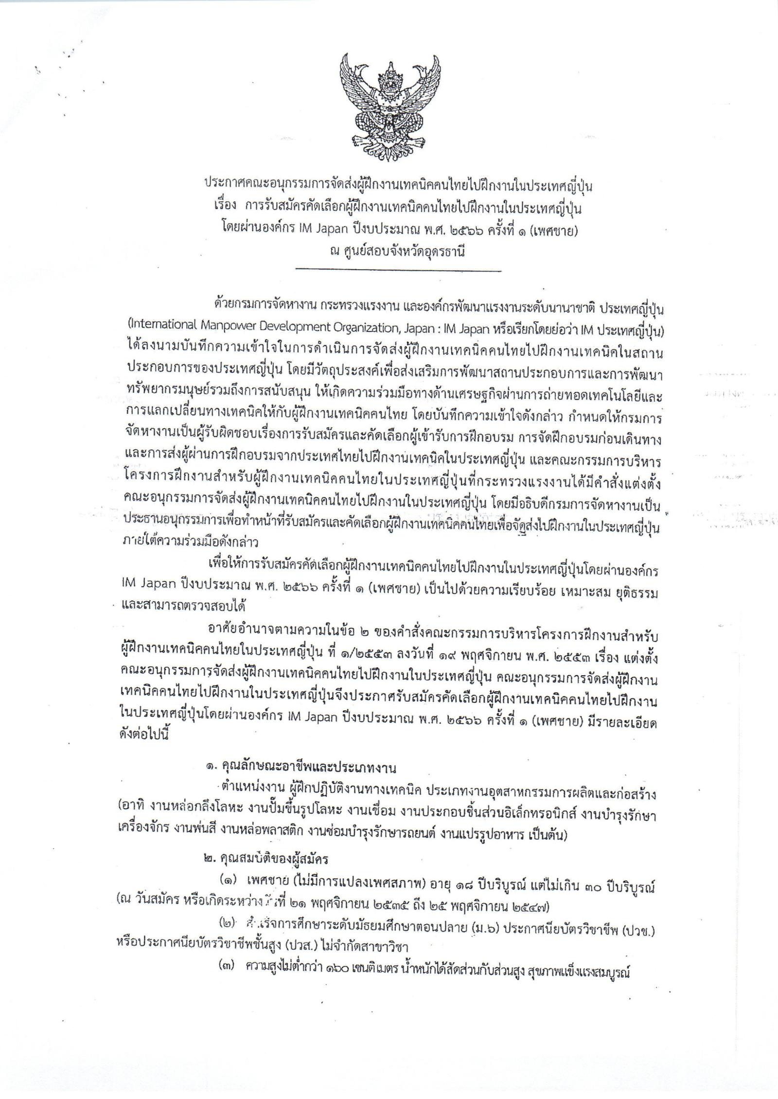 ประกาศรับสมัครคัดเลือกคนไทยไปฝึกงานทในประเทศญี่ปุ่นโดยผ่านองค์กร IM Japan ปีงบประมาณ พ.ศ. 2566 ครั้งที่ 1 (เพศชาย)