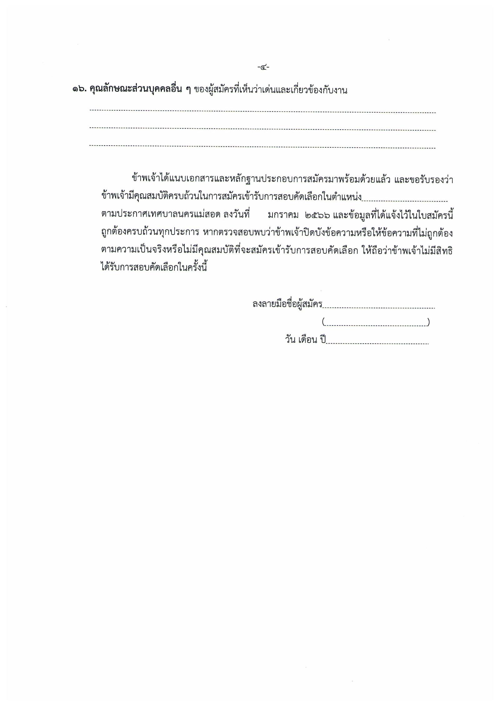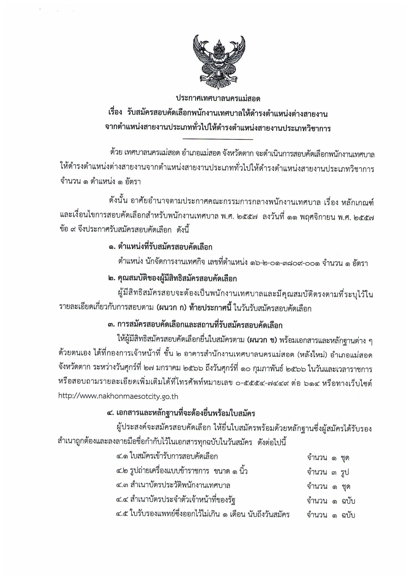 ประกาศเทศบาลนครแม่สอด เรื่อง รับสมัครสอบคัดเลือกพนักงานเทศบาลสายงานประเภททั่วไป เพื่อแต่งตั้งให้ดำรงตำแหน่งสายงานประเภทวิชาการ ระดับปฏิบัติการ