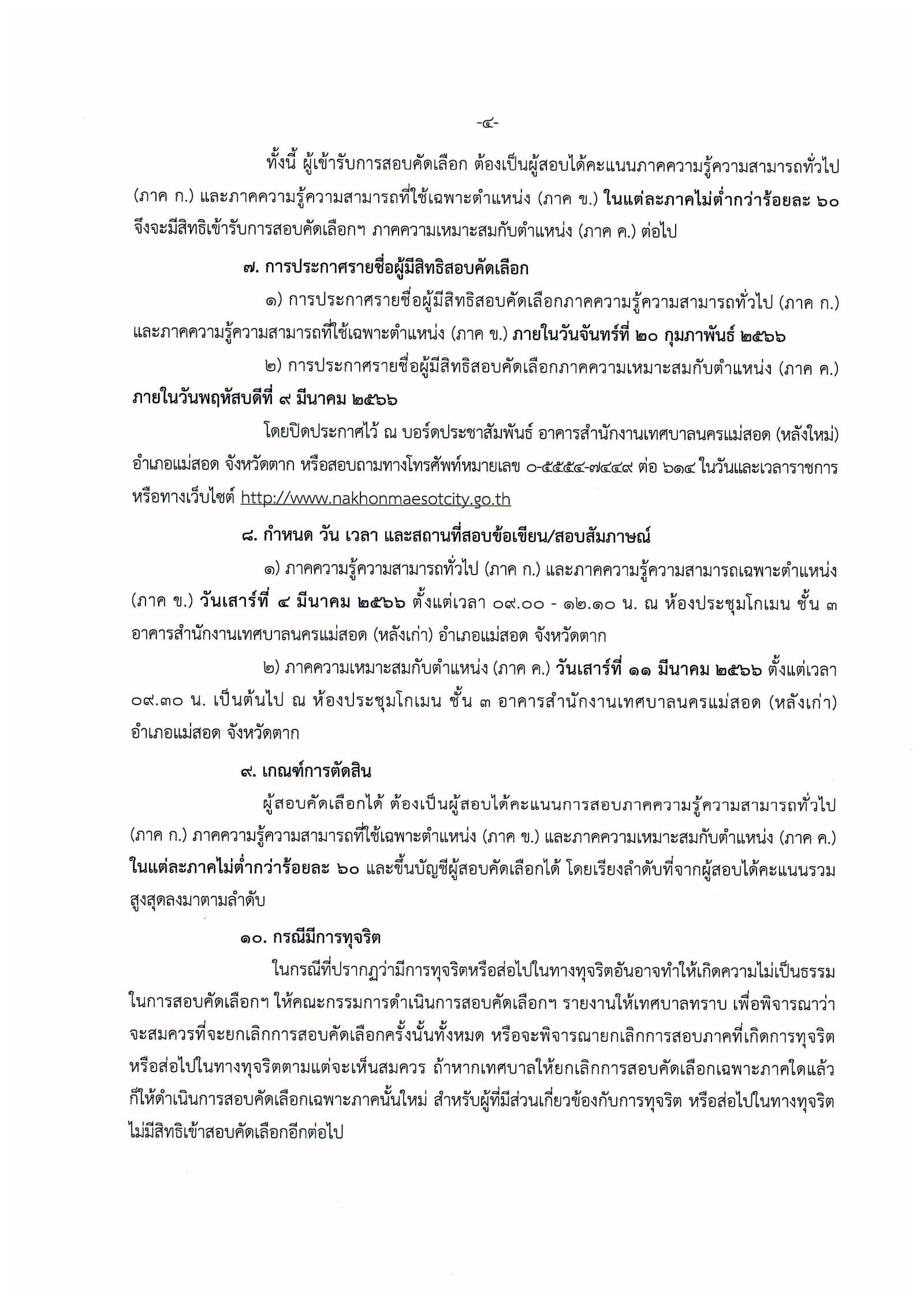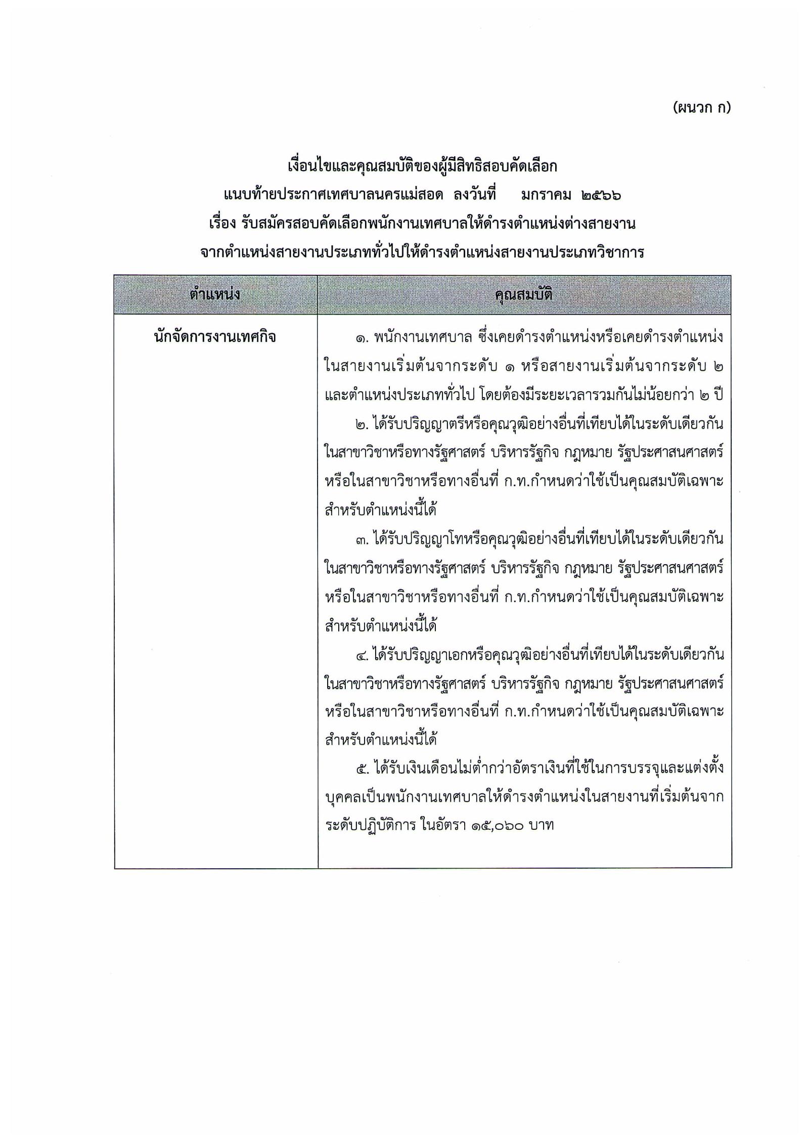 ประกาศเทศบาลนครแม่สอด เรื่อง รับสมัครสอบคัดเลือกพนักงานเทศบาลให้ดำรงตำแหน่งต่างสายงานจากตำแหน่งสายงานประเภททั่วไปให้ดำรงตำแหน่งสายงานประเภทวิชาการ ตำแหน่ง นักจัดการงานเทศกิจ จำนวน 1 อัตรา