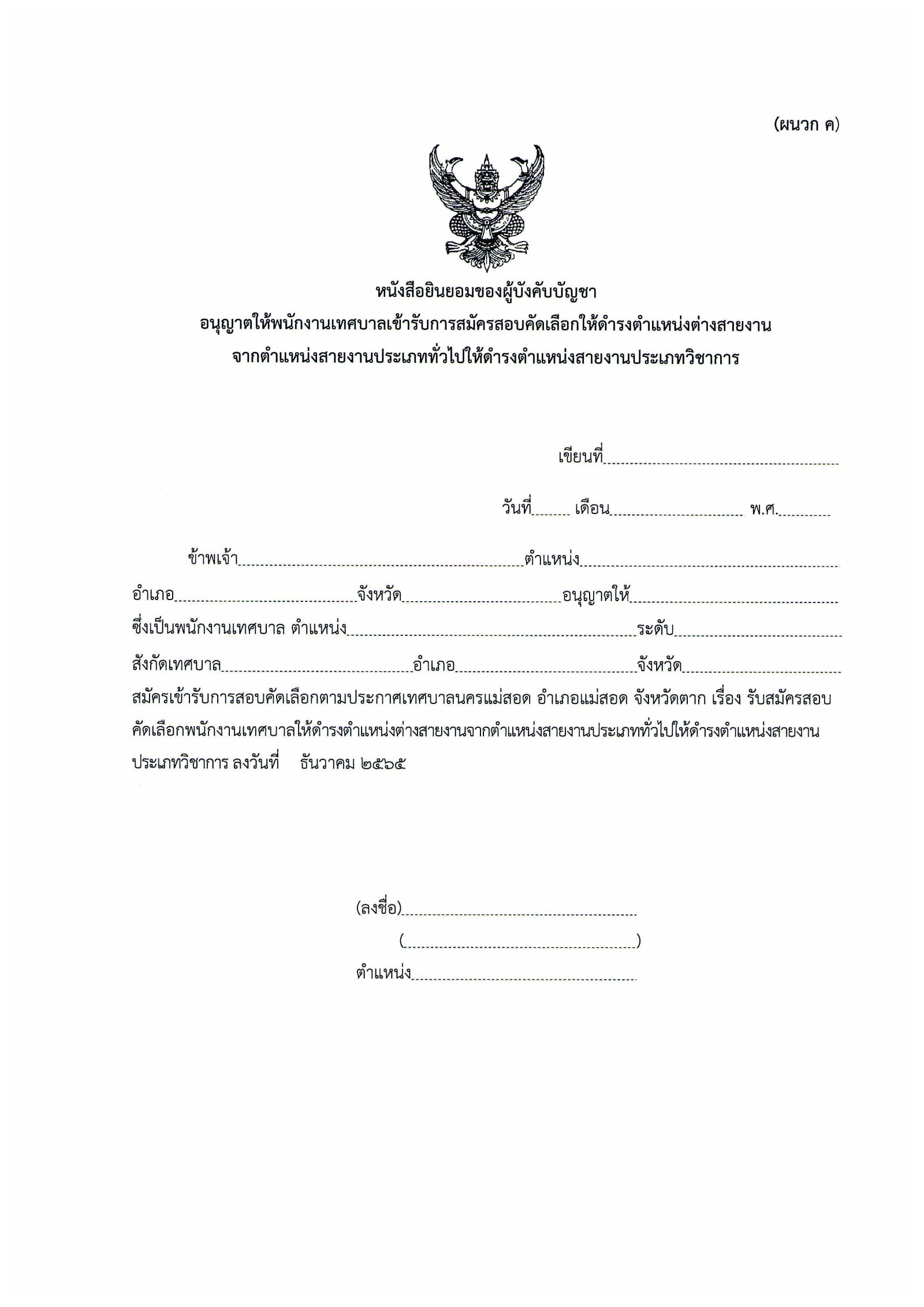 เทศบาลนครแม่สอด รับโอน (ย้าย) พนักงานเทศบาลหรือพนักงานส่วนท้องถิ่นอื่น มาดำรงตำแหน่งที่ว่าง