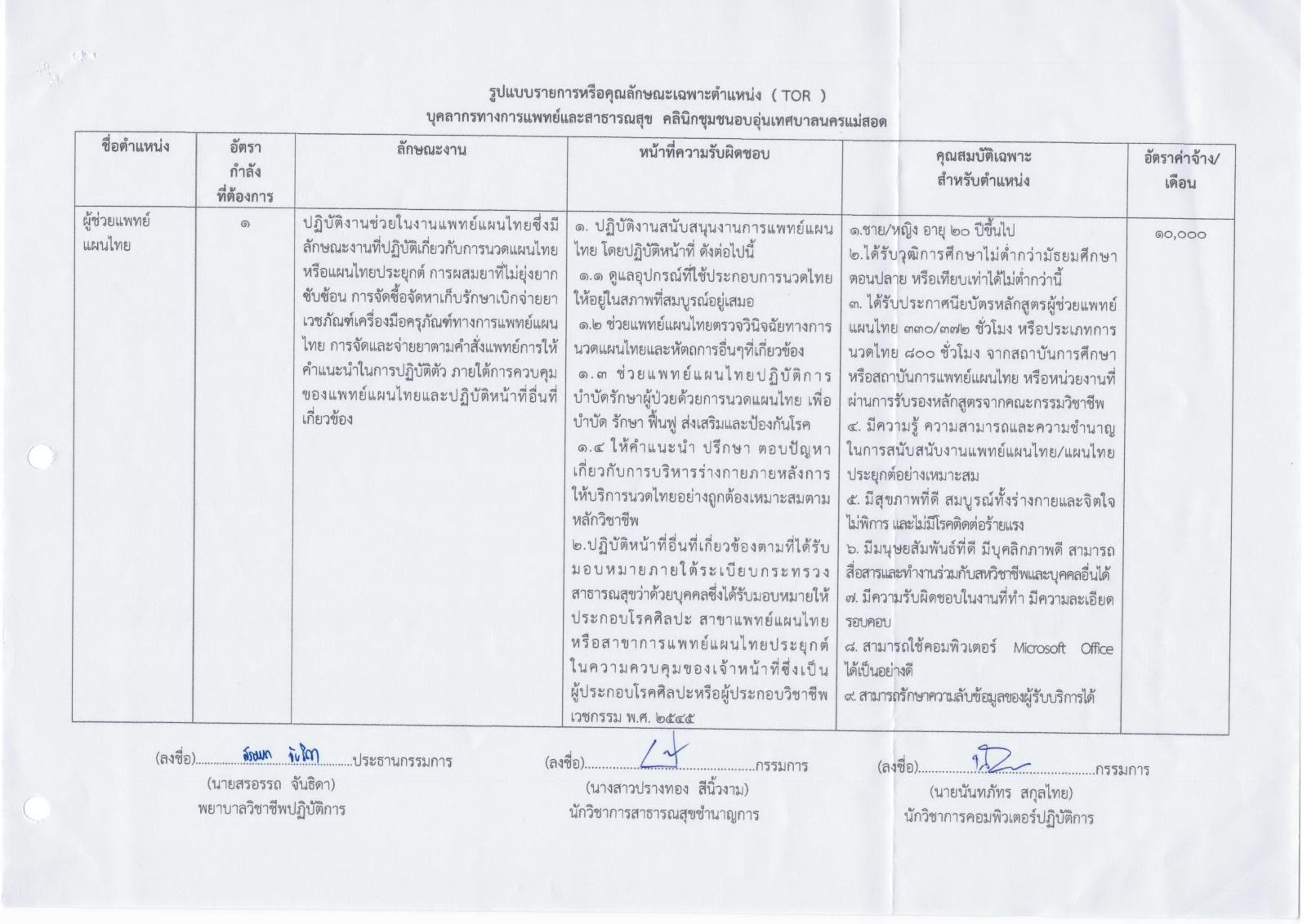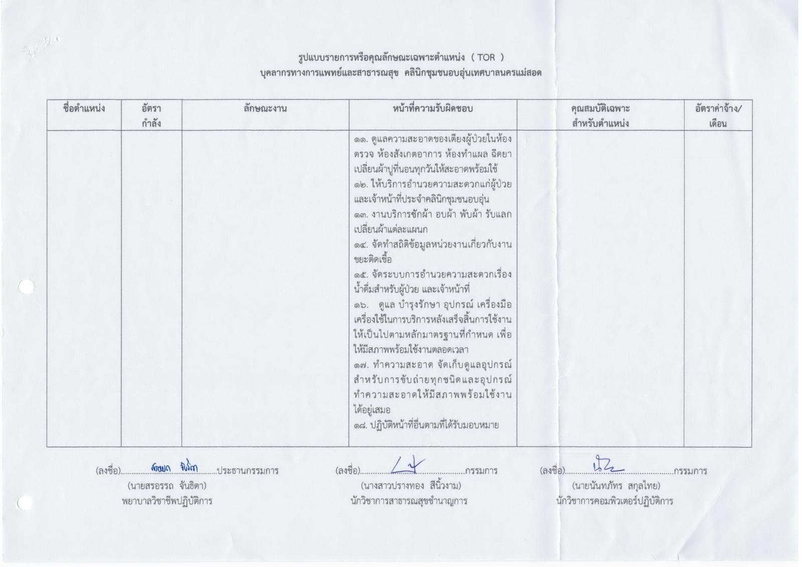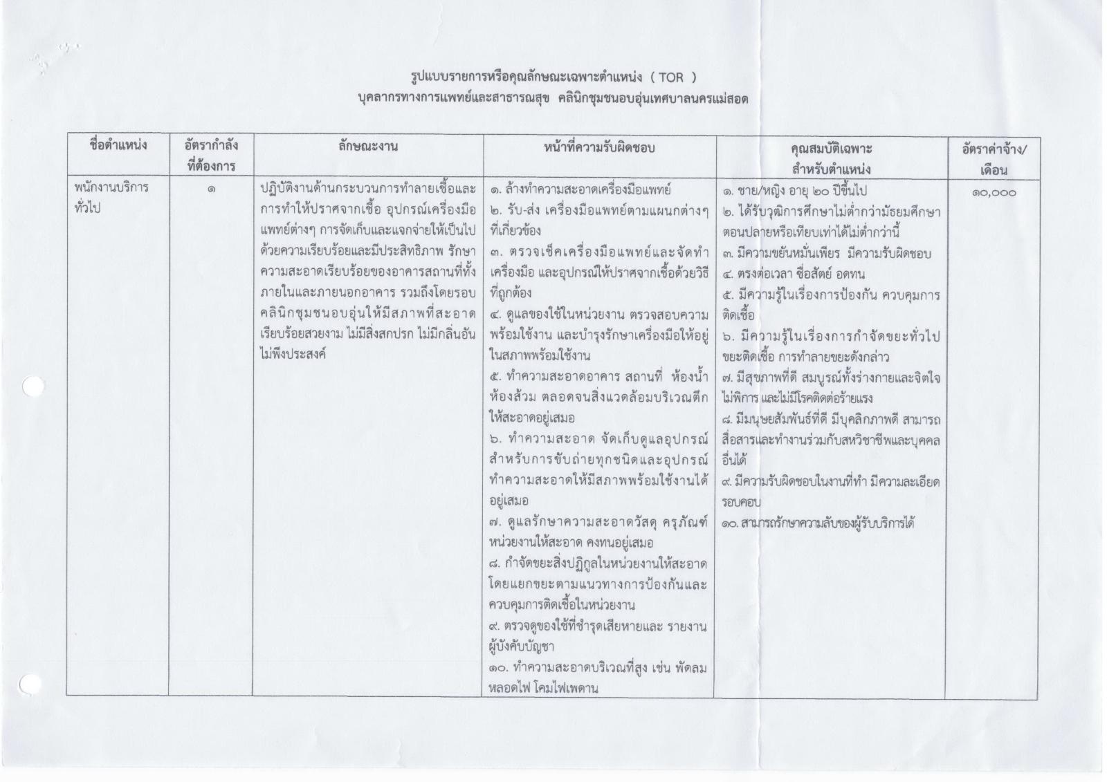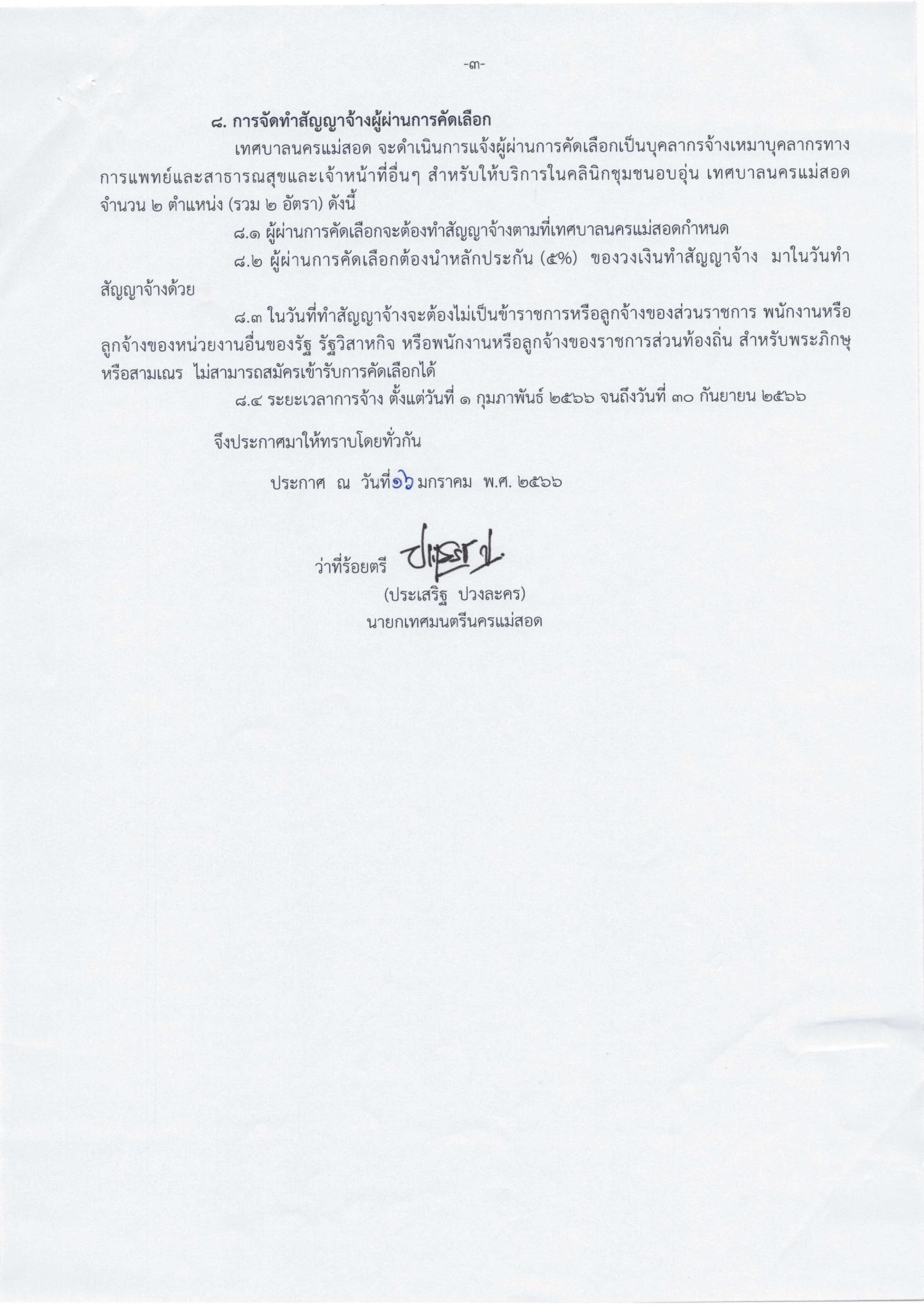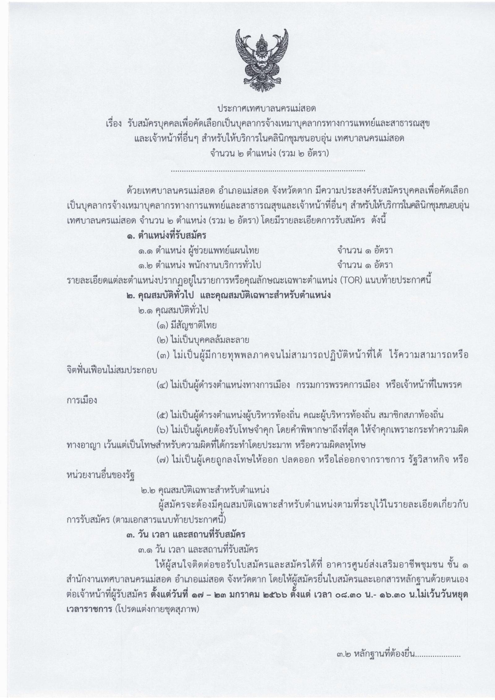 ประกาศเทศบาลนครแม่สอด เรื่อง รับสมัครบุคคลเพื่อคัดเลือกเป็นบุคลากรจ้างเหมาบุคลากรทางการแพทย์และสาธารณสุขและเจ้าหน้าที่อื่นๆ สำหรับให้บริการในคลินิกชุมชนอบอุ่น เทศบาลนครแม่สอด จำนวน 2 ตำแหน่ง (รวม 2 อัตรา)